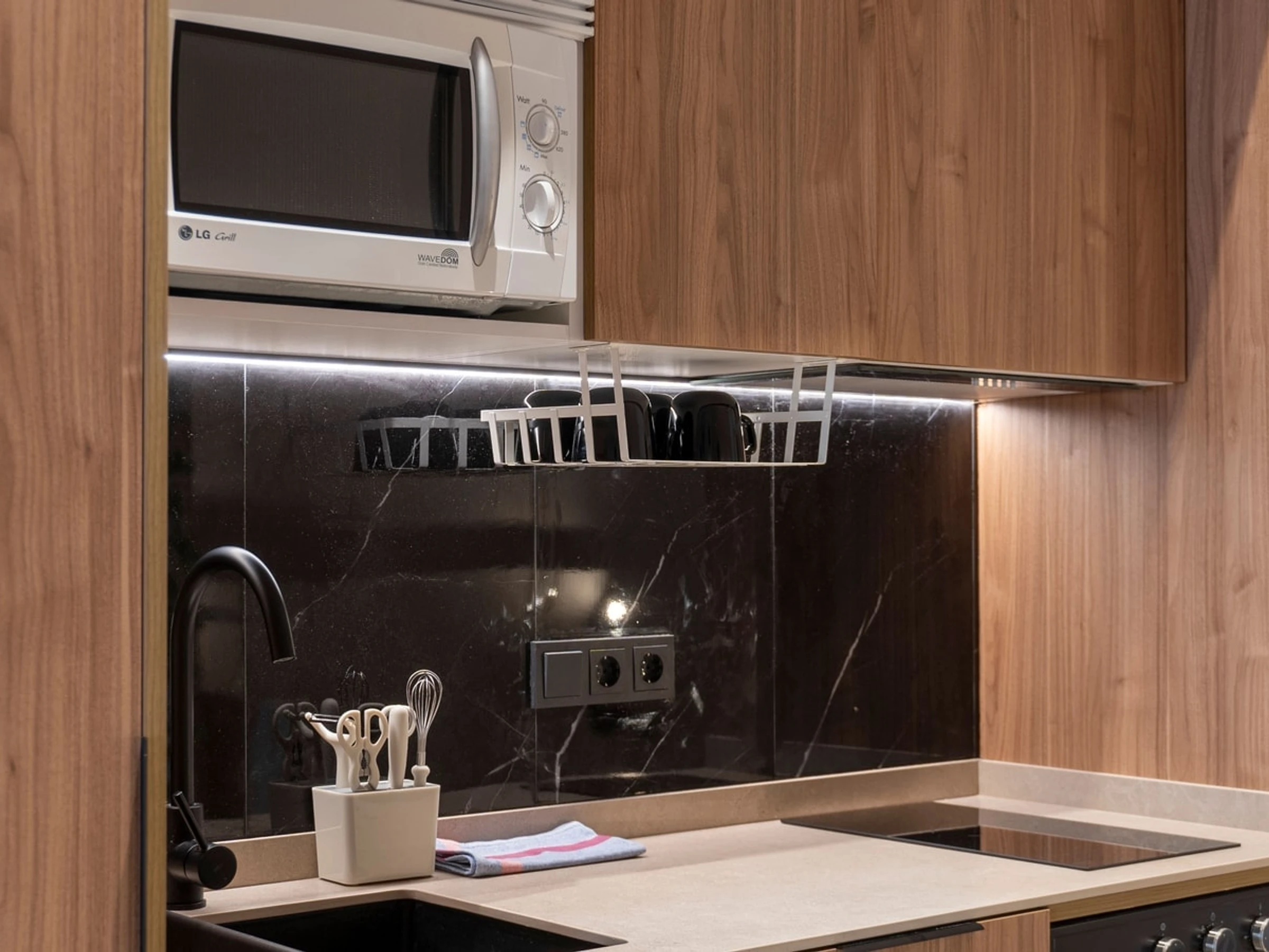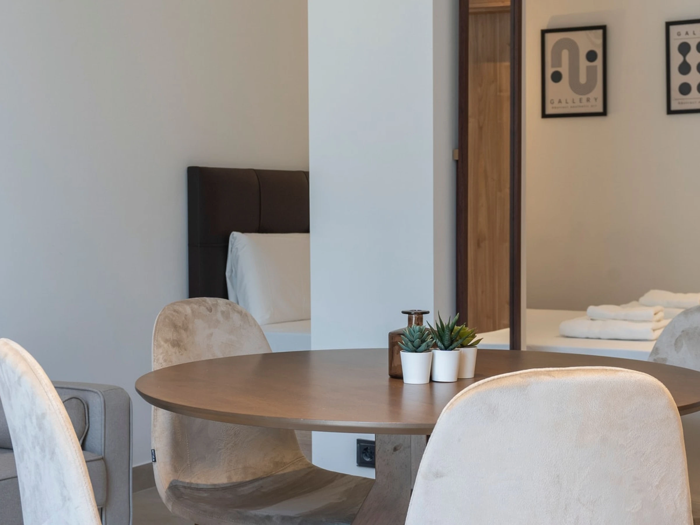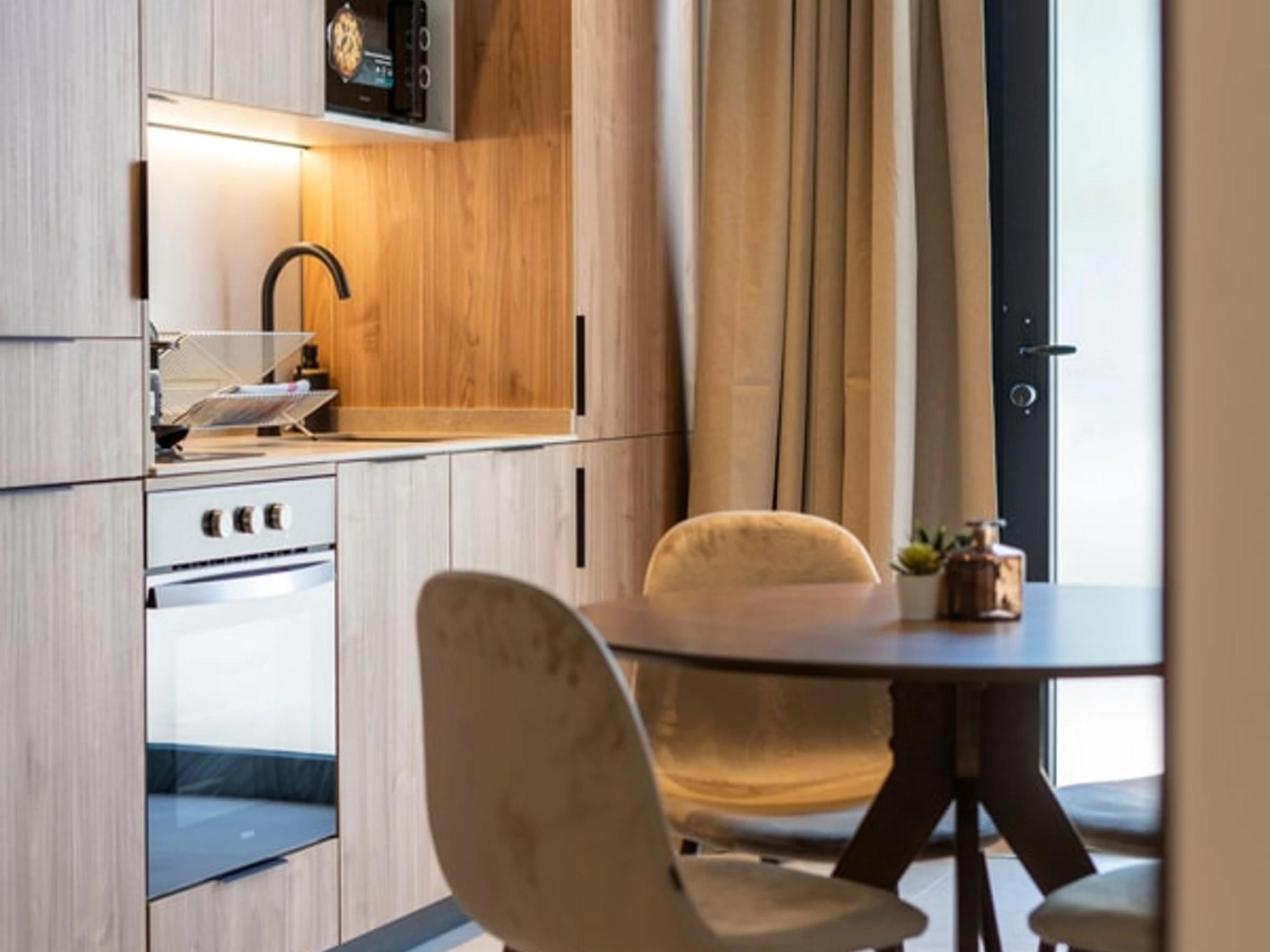 Beim Betreten empfängt Sie ein sorgfältig gestalteter Raum, der Komfort und Funktionalität vereint. Das Studio bietet Platz für drei Personen und verfügt über ein Schlafsofa, das sich in ein bequemes Bett verwandeln lässt, sowie ein geräumiges Queensize-Bett für erholsamen Schlaf. Die Küche ist komplett ausgestattet mit allen Geräten, die Sie benötigen, darunter eine Nespresso-Kaffeemaschine für köstlichen Kaffee am Morgen, eine Mikrowelle zum schnellen Aufwärmen Ihrer Mahlzeiten und ein Wasserkocher für Ihren Lieblingstee zu jeder Tageszeit. Für alle, die in Verbindung bleiben möchten, steht WLAN zur Verfügung, damit Sie Ihre privaten oder beruflichen Angelegenheiten erledigen können.