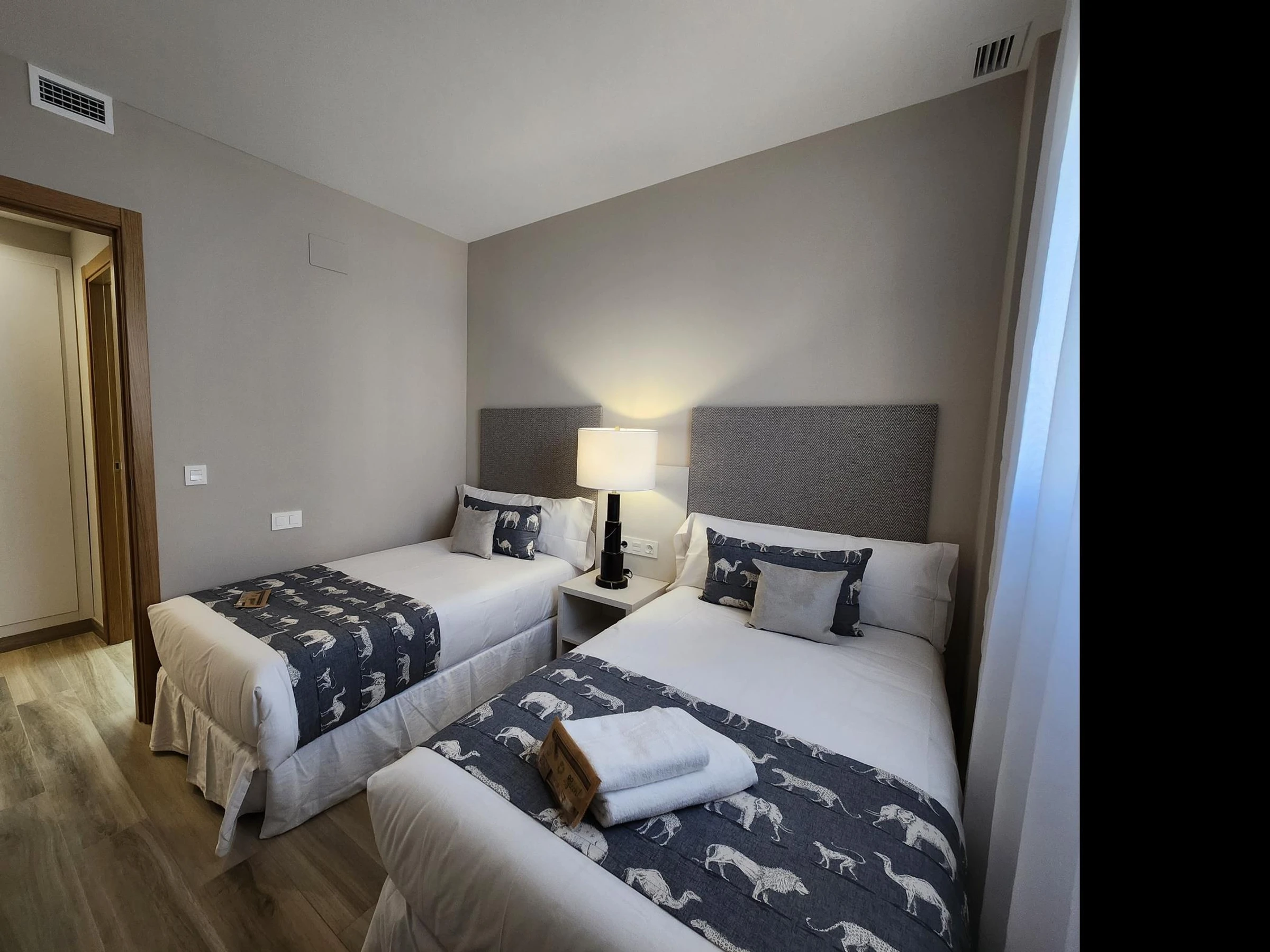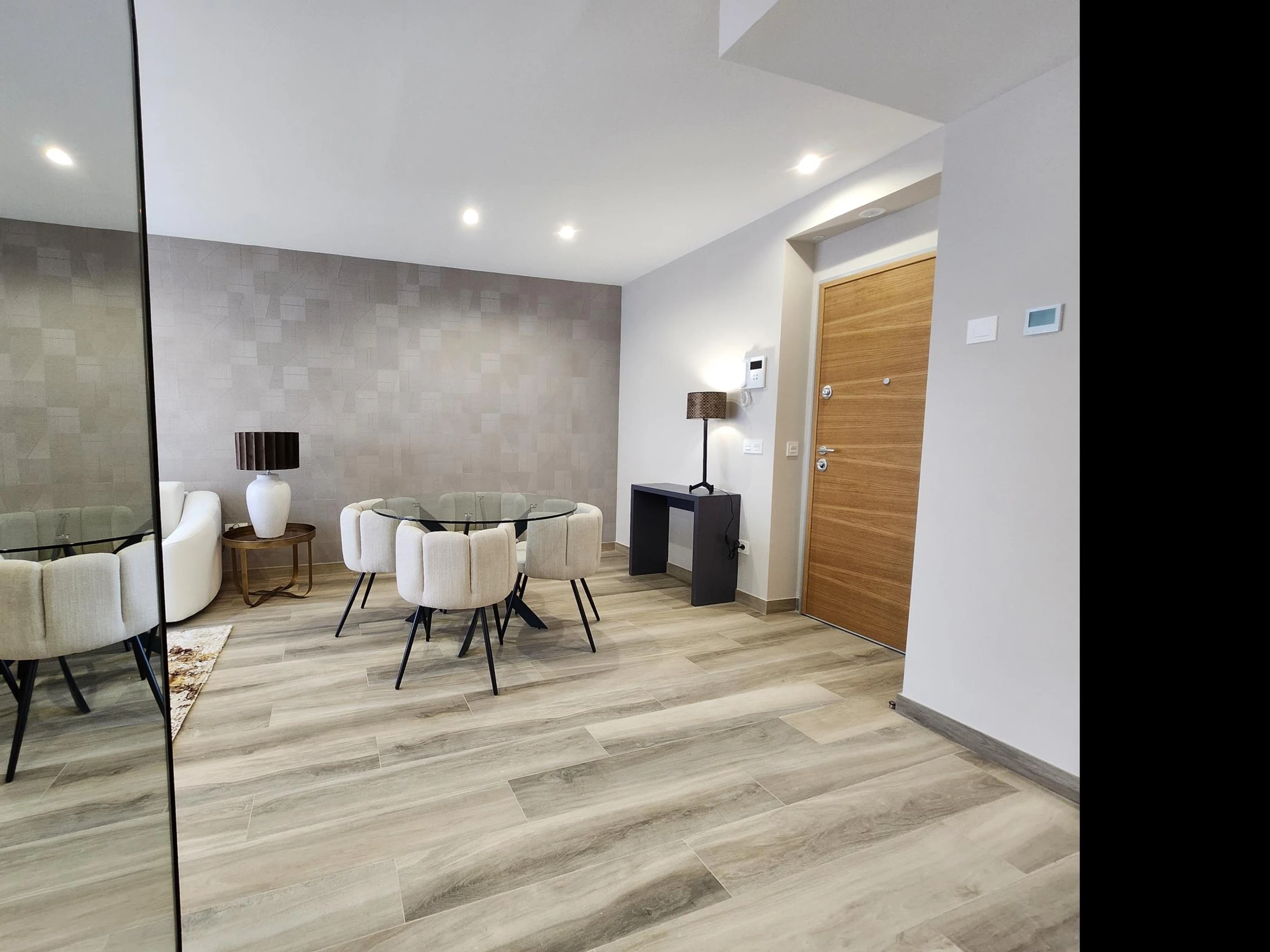 Das Apartment befindet sich in einem Neubau mit Aufzug. Es verfügt über ein Hauptschlafzimmer mit einem 150 x 190 cm großen Bett, ein zweites Schlafzimmer mit zwei Einzelbetten, ein Badezimmer mit Dusche, eine voll ausgestattete Küche und ein geräumiges Wohnzimmer mit einem 140 x 200 cm großen Doppelschlafsofa. Hochwertige Möbel, viel Tageslicht und geschmackvolle Einrichtung schaffen eine moderne und einladende Atmosphäre.