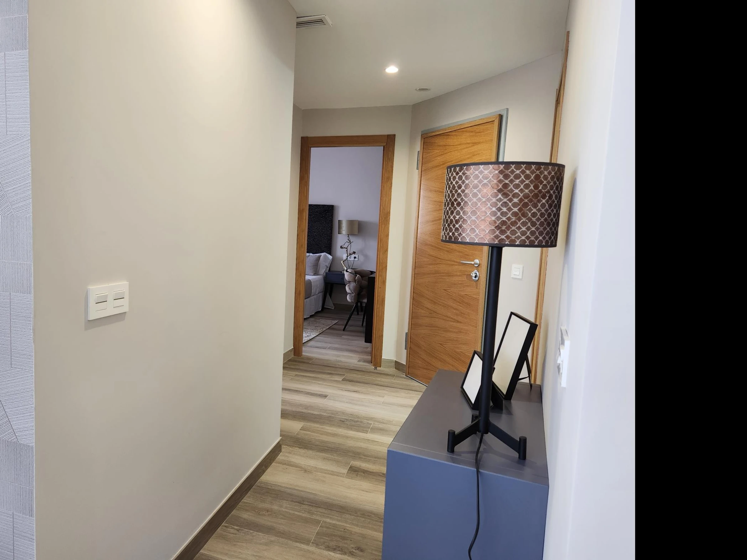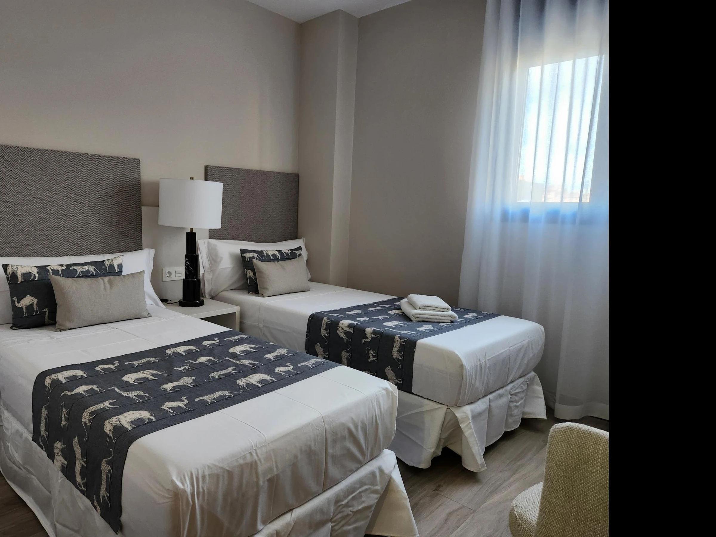 Das Apartment befindet sich in einem Neubau mit Aufzug. Es verfügt über ein Hauptschlafzimmer mit einem 150 x 190 cm großen Bett, ein zweites Schlafzimmer mit zwei Einzelbetten, ein Badezimmer mit Dusche, eine voll ausgestattete Küche und ein geräumiges Wohnzimmer mit einem 140 x 200 cm großen Doppelschlafsofa. Hochwertige Möbel, viel Tageslicht und geschmackvolle Einrichtung schaffen eine moderne und einladende Atmosphäre.