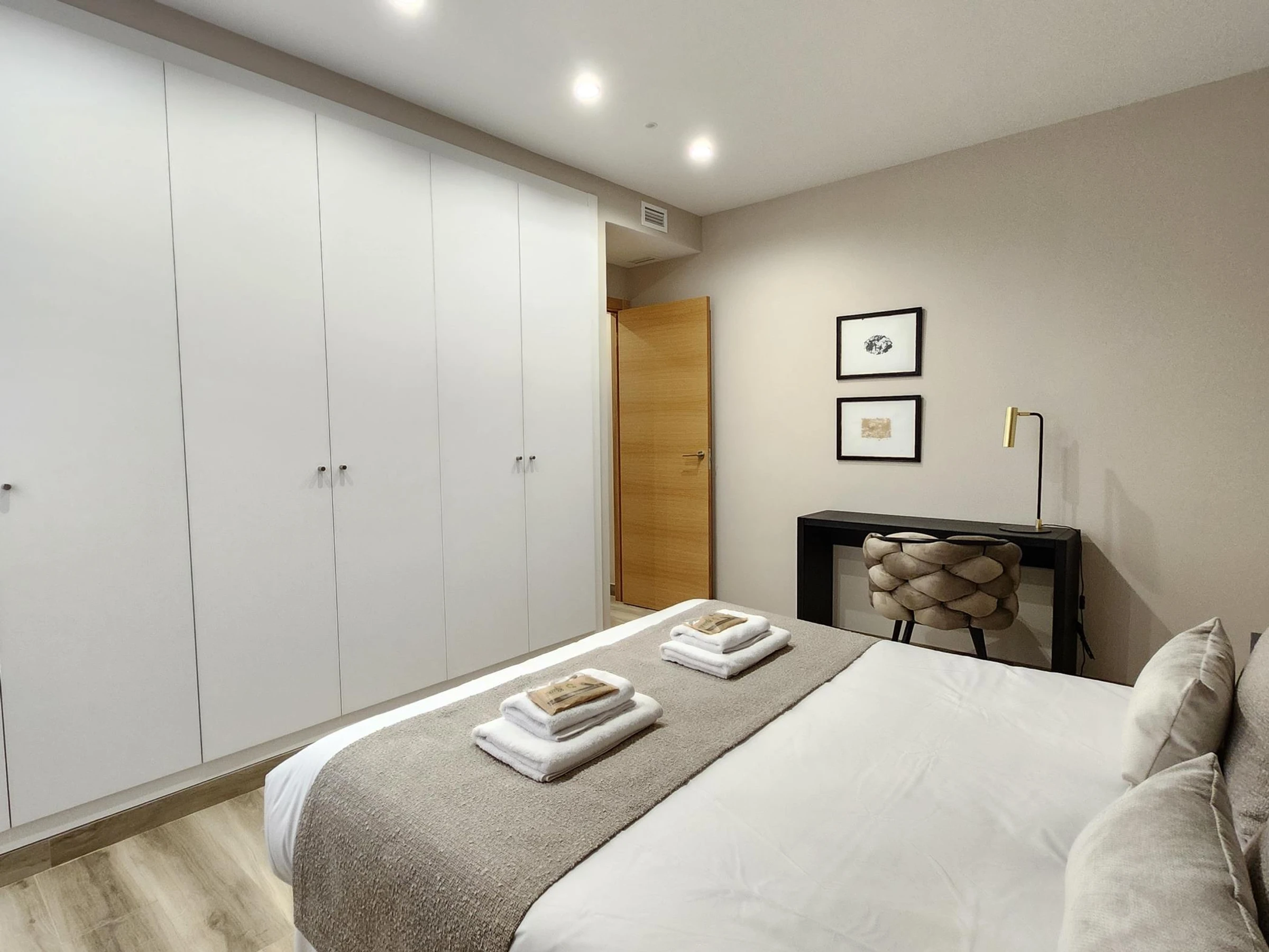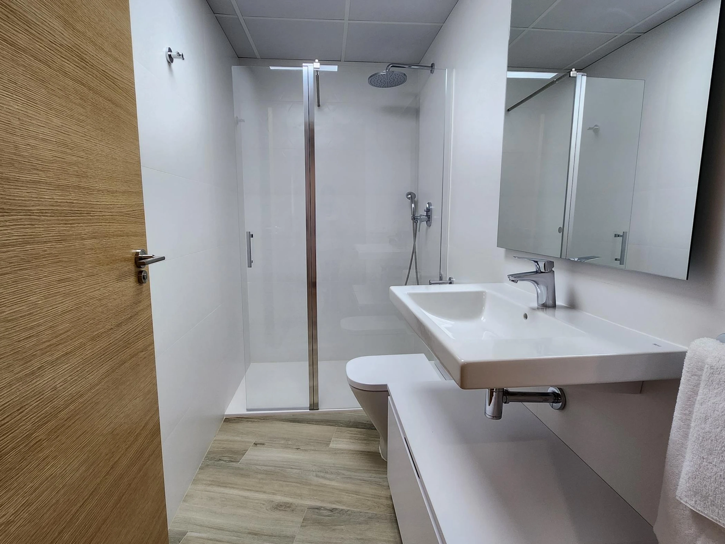 Das Apartment befindet sich in einem Neubau mit Aufzug. Es verfügt über ein Hauptschlafzimmer mit einem 150 x 190 cm großen Bett, ein zweites Schlafzimmer mit zwei Einzelbetten, ein Badezimmer mit Dusche, eine voll ausgestattete Küche und ein geräumiges Wohnzimmer mit einem 140 x 200 cm großen Doppelschlafsofa. Hochwertige Möbel, viel Tageslicht und geschmackvolle Einrichtung schaffen eine moderne und einladende Atmosphäre.