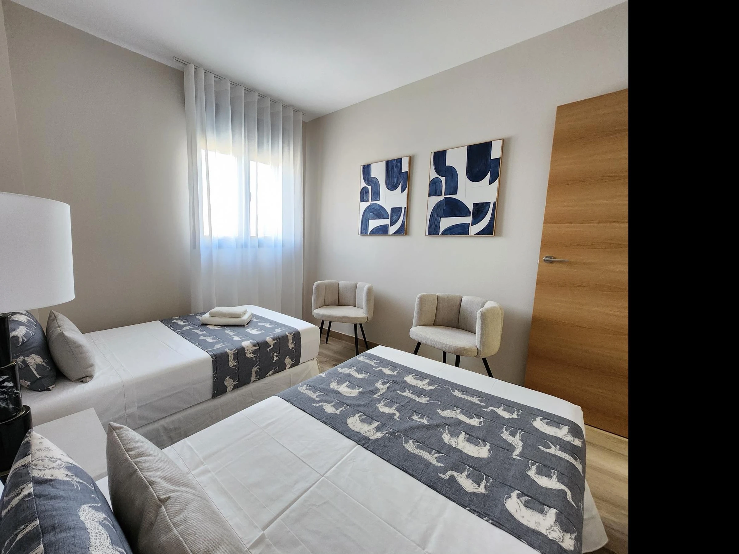 Das Apartment befindet sich in einem Neubau mit Aufzug. Es verfügt über ein Hauptschlafzimmer mit einem 150 x 190 cm großen Bett, ein zweites Schlafzimmer mit zwei Einzelbetten, ein Badezimmer mit Dusche, eine voll ausgestattete Küche und ein geräumiges Wohnzimmer mit einem 140 x 200 cm großen Doppelschlafsofa. Hochwertige Möbel, viel Tageslicht und geschmackvolle Einrichtung schaffen eine moderne und einladende Atmosphäre.