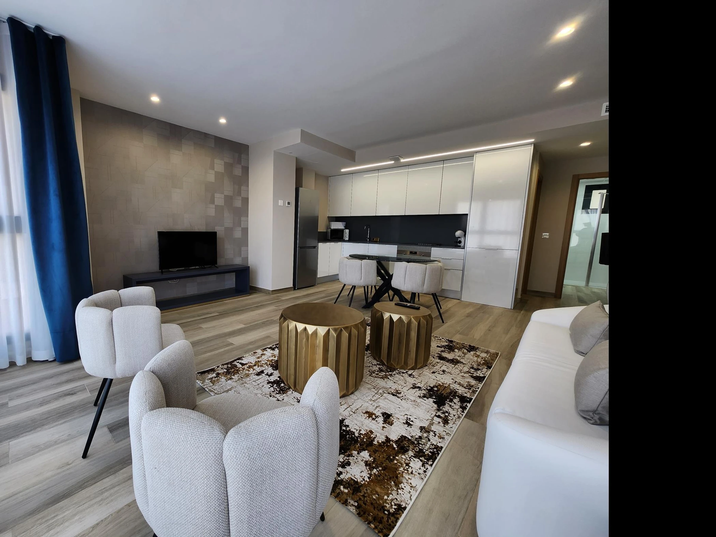 Das Apartment befindet sich in einem Neubau mit Aufzug. Es verfügt über ein Hauptschlafzimmer mit einem 150 x 190 cm großen Bett, ein zweites Schlafzimmer mit zwei Einzelbetten, ein Badezimmer mit Dusche, eine voll ausgestattete Küche und ein geräumiges Wohnzimmer mit einem 140 x 200 cm großen Doppelschlafsofa. Hochwertige Möbel, viel Tageslicht und geschmackvolle Einrichtung schaffen eine moderne und einladende Atmosphäre.