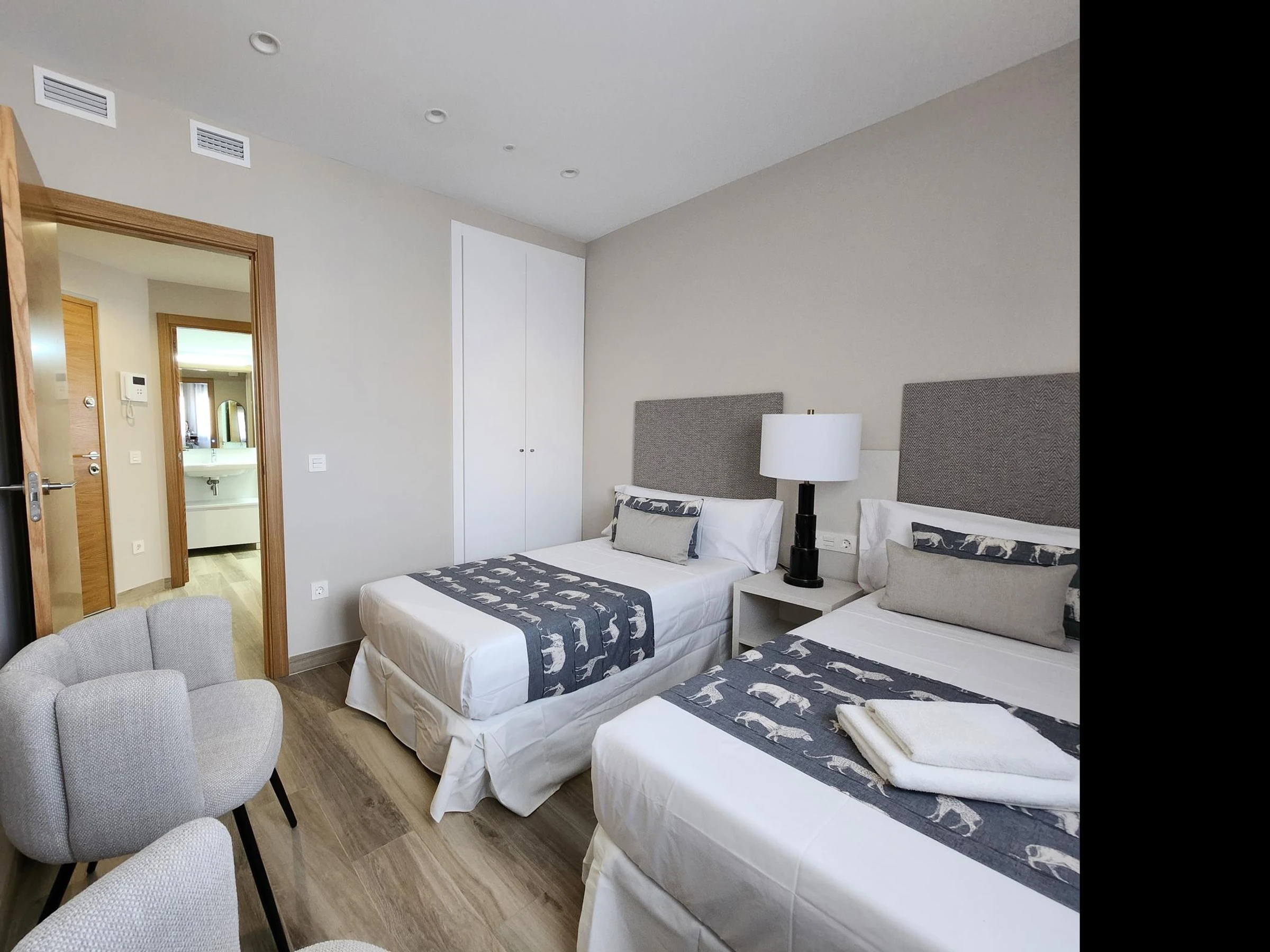 Das Apartment befindet sich in einem Neubau mit Aufzug. Es verfügt über ein Hauptschlafzimmer mit einem 150 x 190 cm großen Bett, ein zweites Schlafzimmer mit zwei Einzelbetten, ein Badezimmer mit Dusche, eine voll ausgestattete Küche und ein geräumiges Wohnzimmer mit einem 140 x 200 cm großen Doppelschlafsofa. Hochwertige Möbel, viel Tageslicht und geschmackvolle Einrichtung schaffen eine moderne und einladende Atmosphäre.