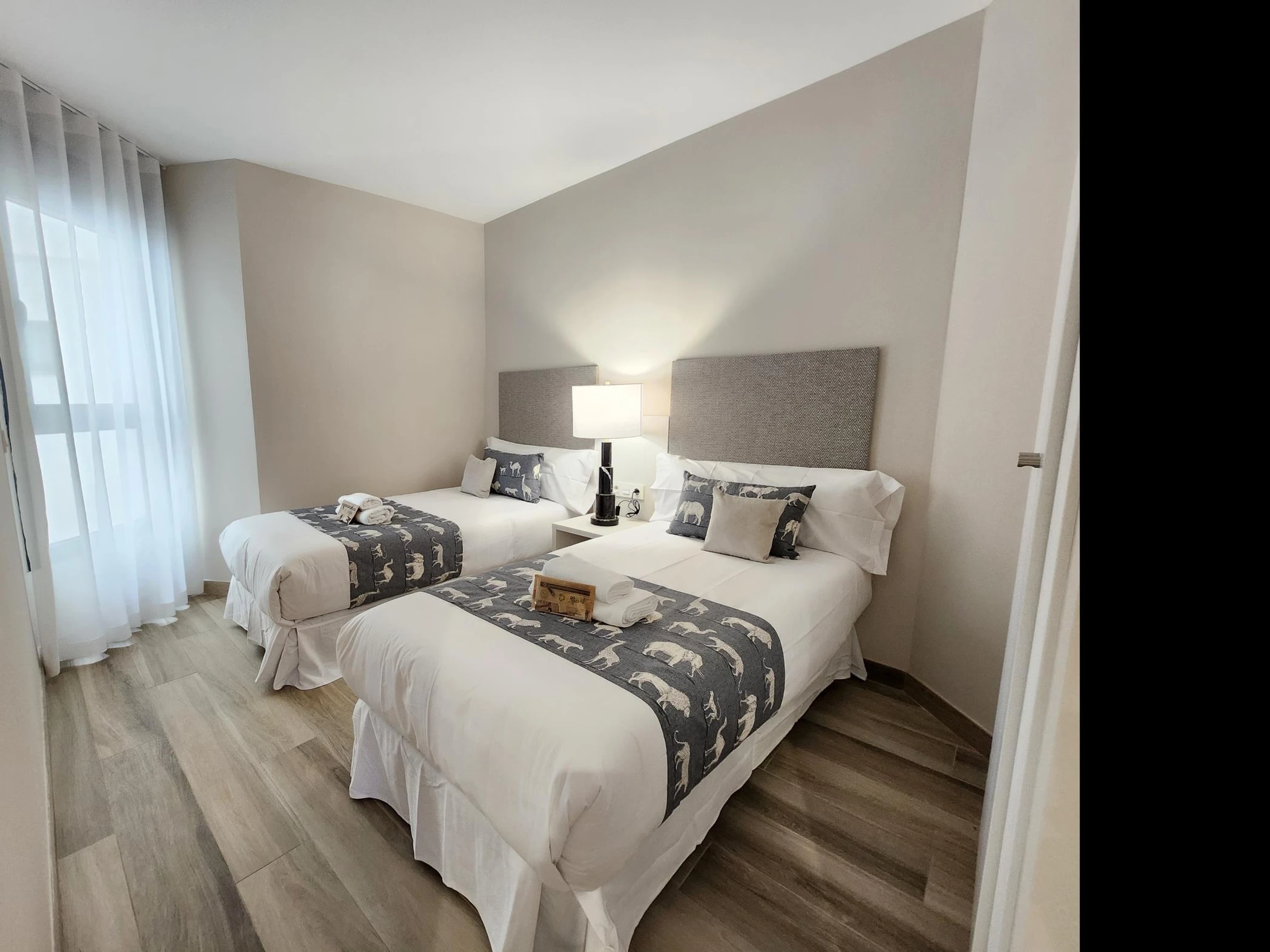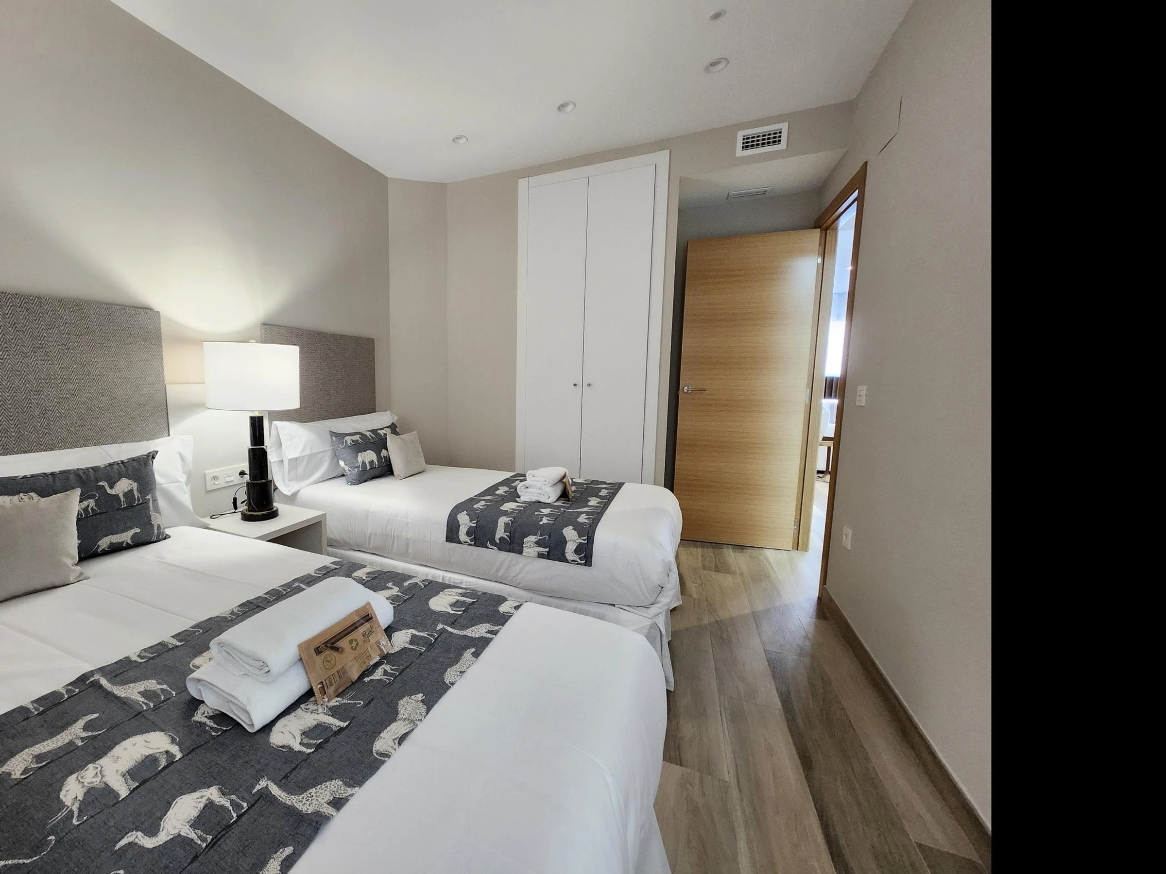 Das Apartment befindet sich in einem Neubau mit Aufzug. Es verfügt über ein Hauptschlafzimmer mit einem 150 x 190 cm großen Bett, ein zweites Schlafzimmer mit zwei Einzelbetten, ein Badezimmer mit Dusche, eine voll ausgestattete Küche und ein geräumiges Wohnzimmer mit einem 140 x 200 cm großen Doppelschlafsofa. Hochwertige Möbel, viel Tageslicht und geschmackvolle Einrichtung schaffen eine moderne und einladende Atmosphäre.