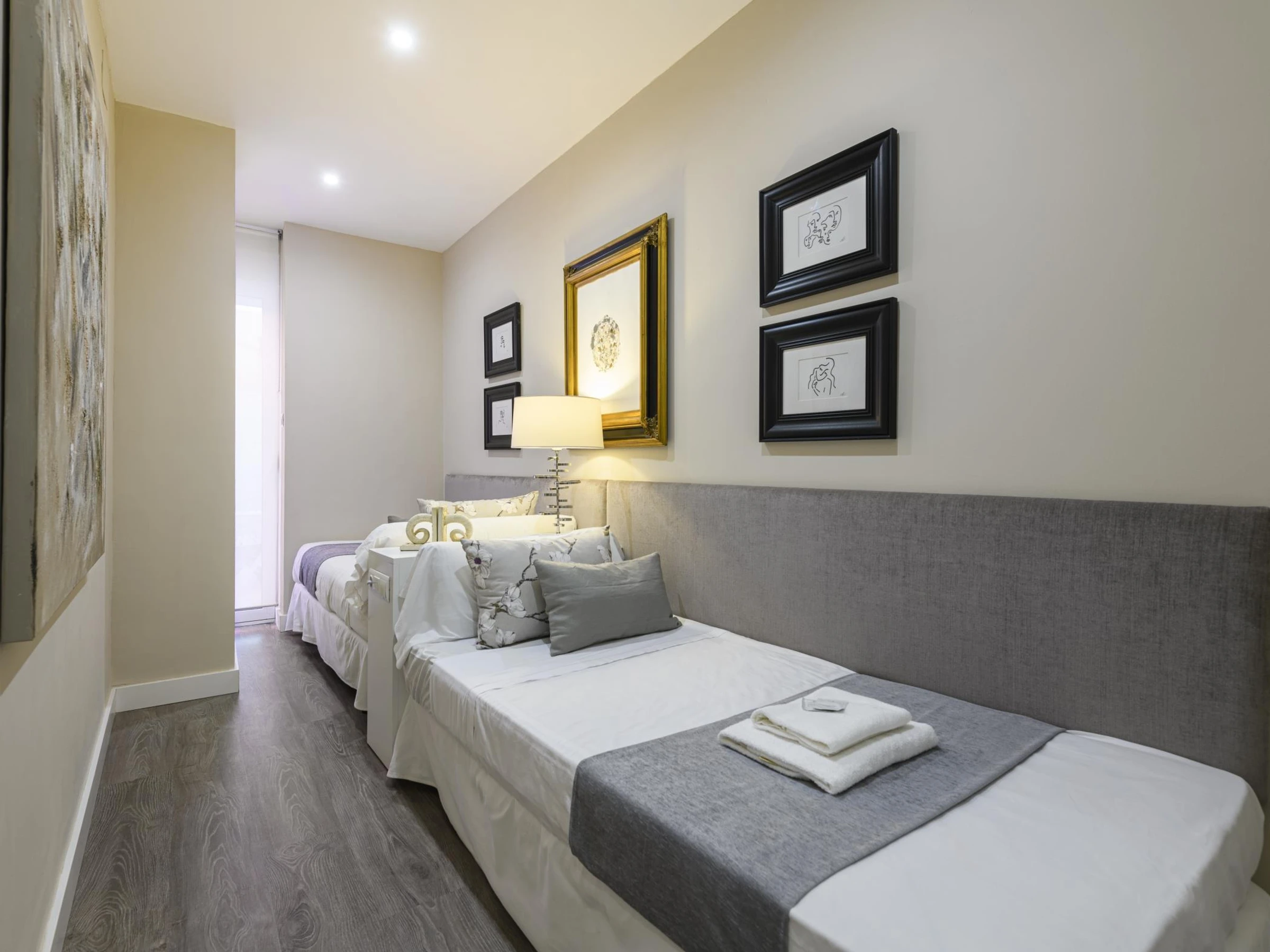 Das Apartment verfügt über ein Hauptschlafzimmer mit Doppelbett und ein zweites Schlafzimmer mit zwei Einzelbetten. Im Wohnzimmer befindet sich außerdem ein bequemes Schlafsofa, ideal für zusätzliche Gäste. Dank der kompletten Ausrichtung nach außen ist das Apartment den ganzen Tag über lichtdurchflutet.