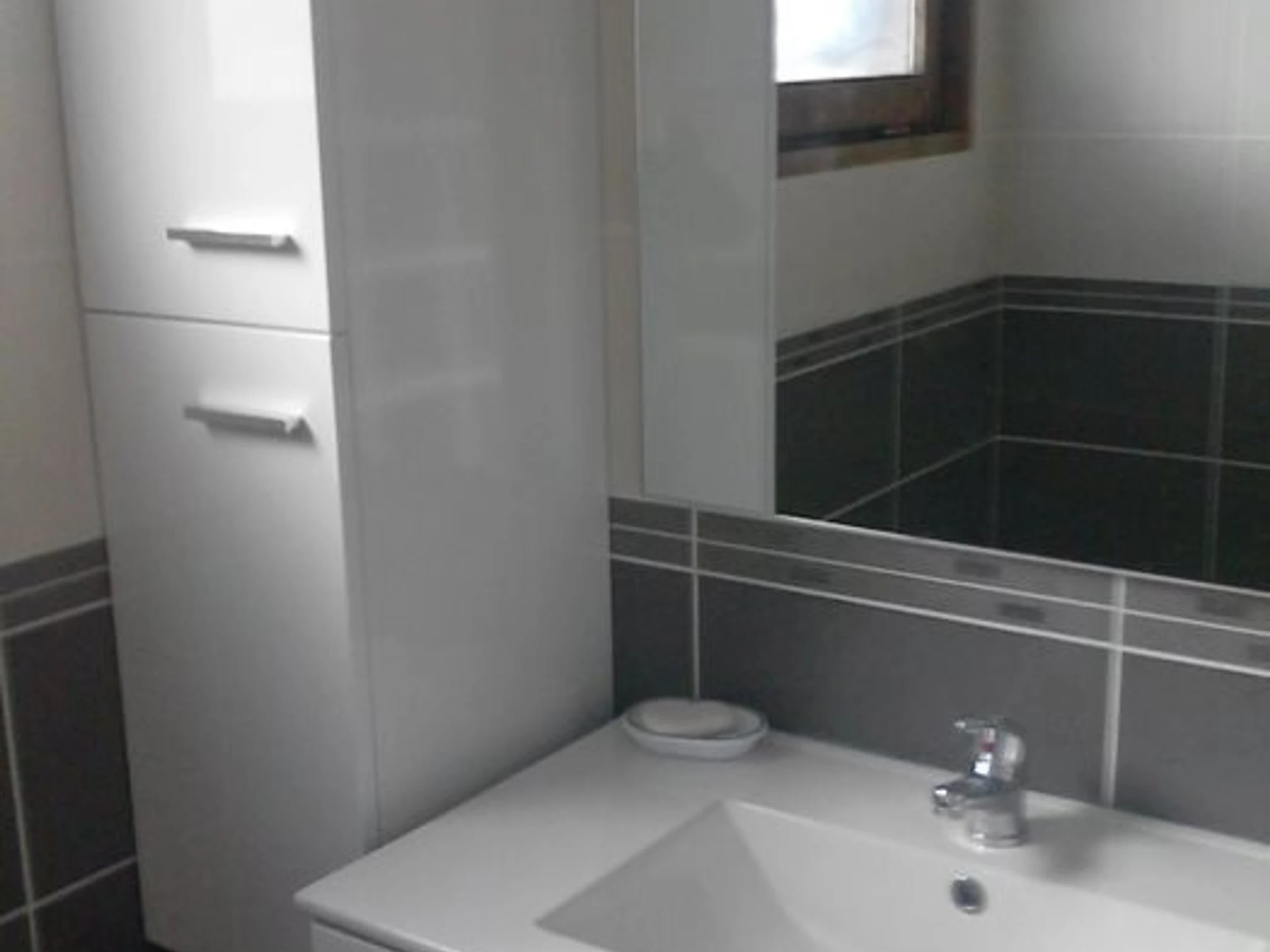 Badezimmer: Waschbecken, Dusche und Haartrockner. Separates WC.