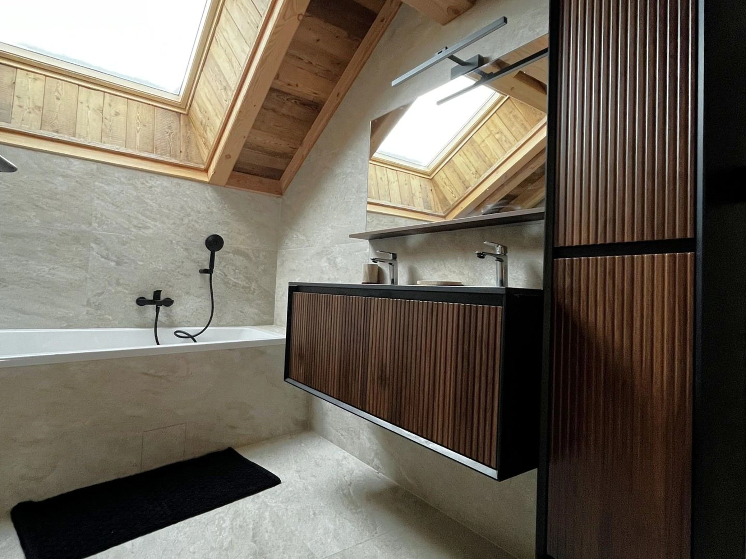 Gemeinschaftsbad (Ebene +2): Waschbecken, Badewanne und WC.