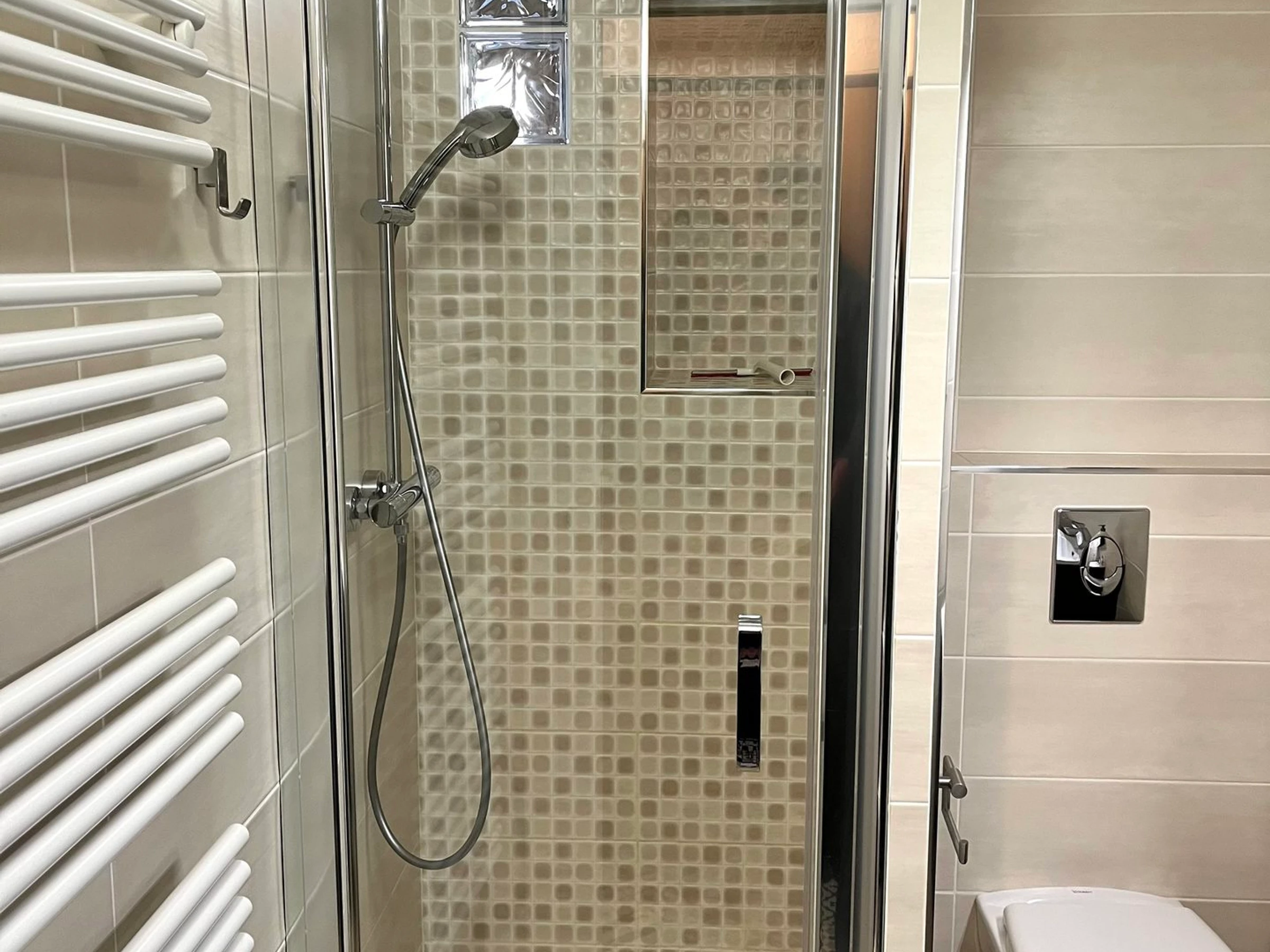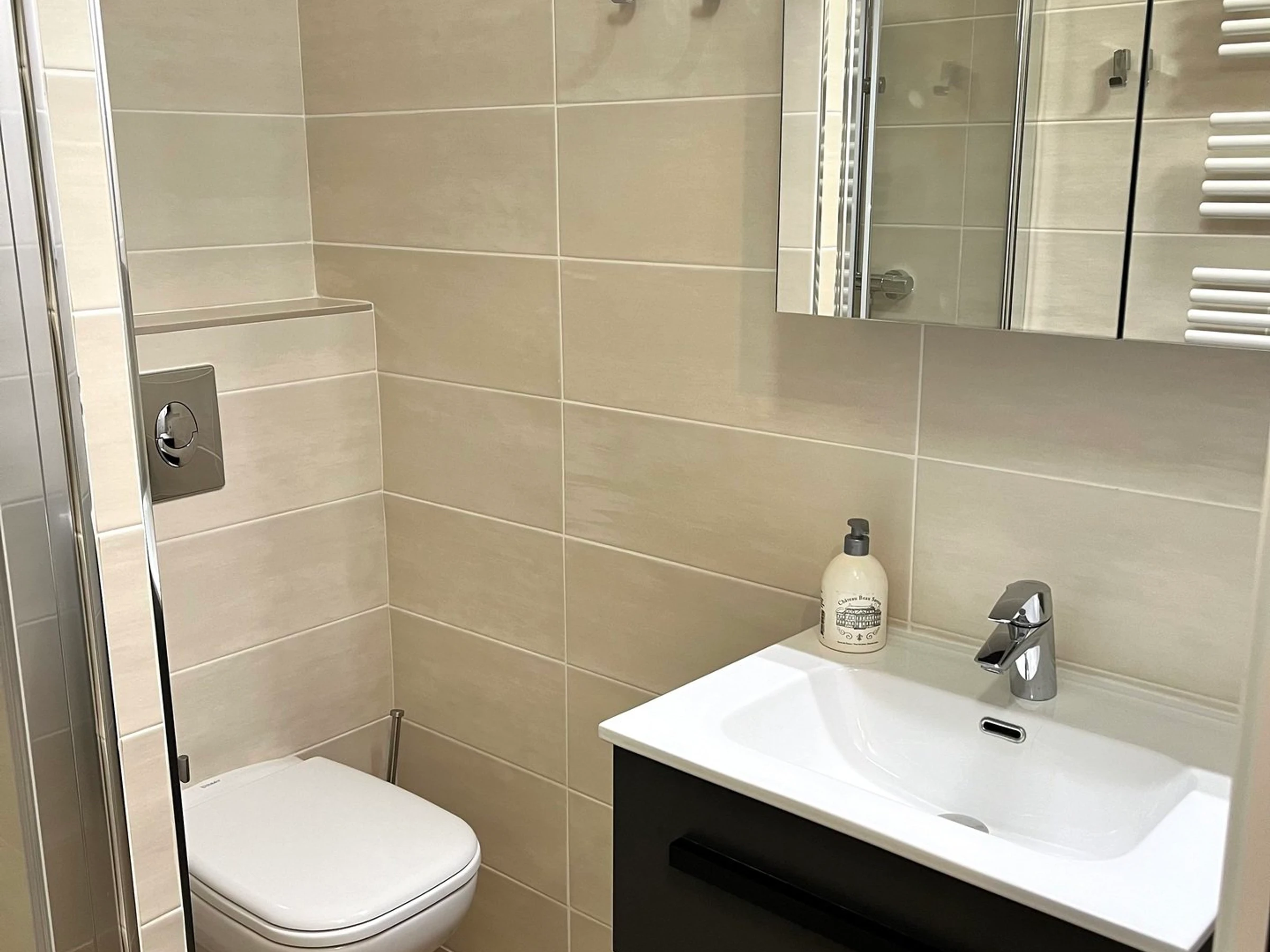 Badezimmer: Waschbecken, Dusche, Föhn, WC