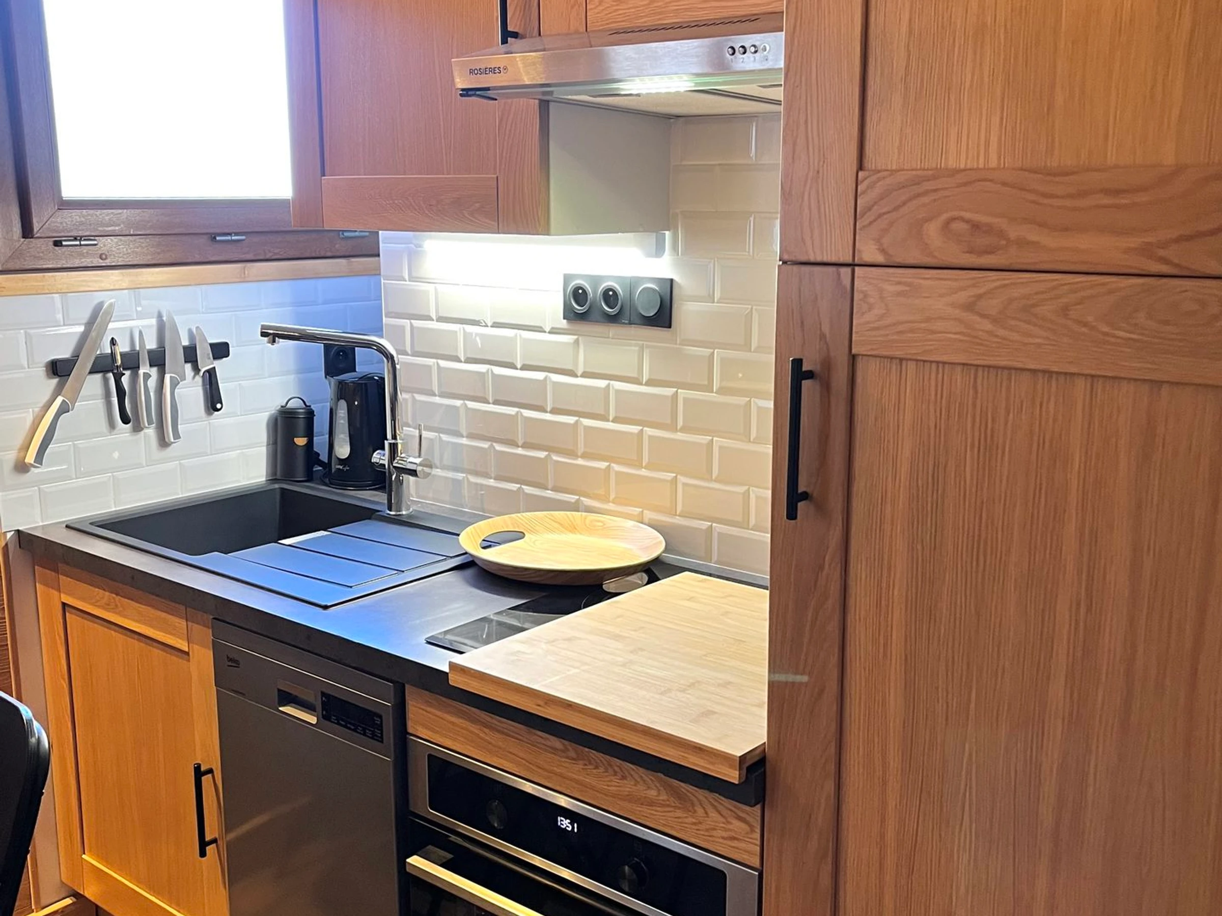 Küchenbereich: Backofen, Mikrowelle, Cerankochfeld (3 Kochzonen), Geschirrspüler, Kühlschrank