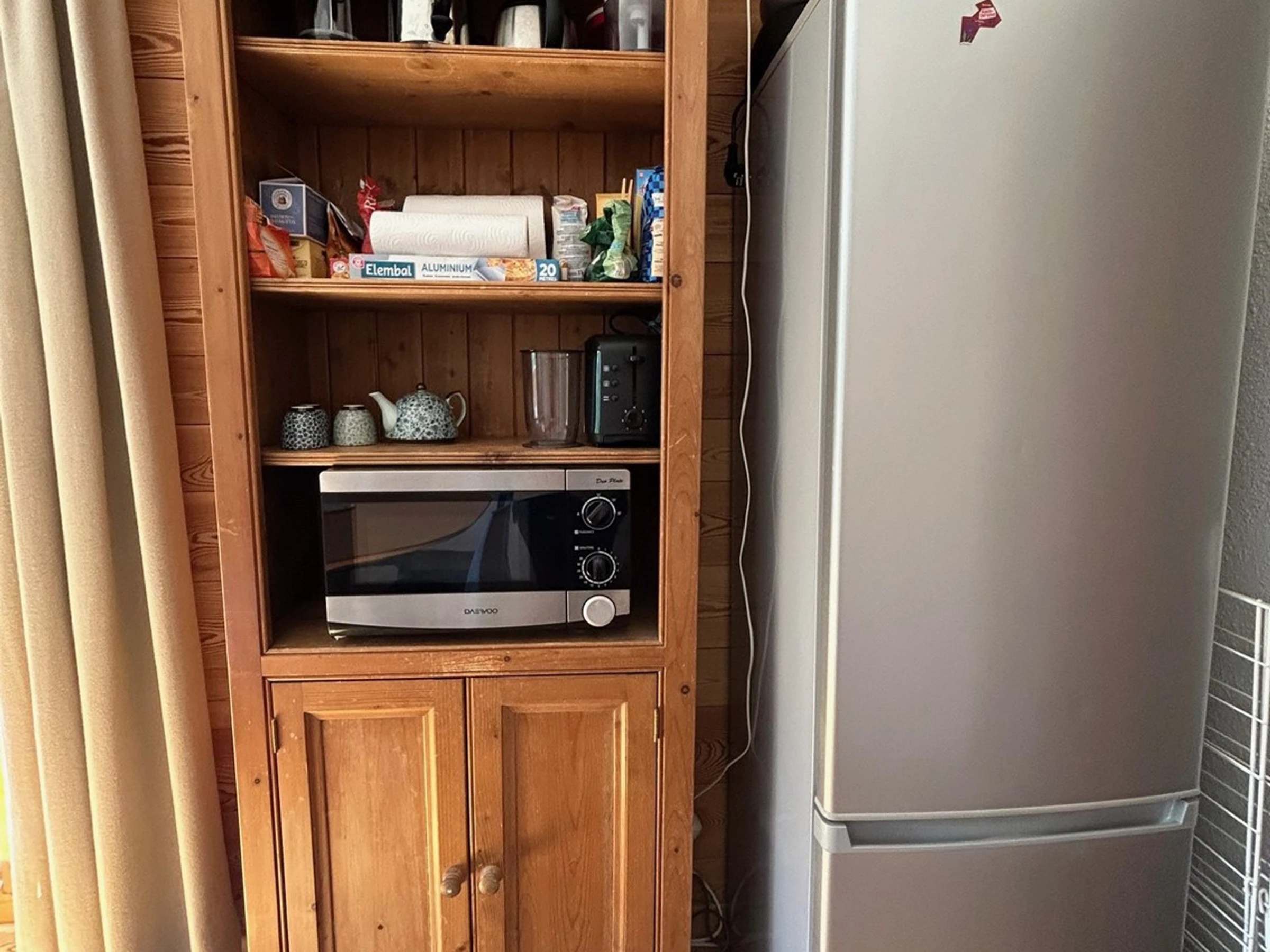 - Küchenbereich: Backofen, Mikrowelle, Geschirrspüler, Kühl-/Gefrierschrank und Cerankochfeld (2 Kochplatten)