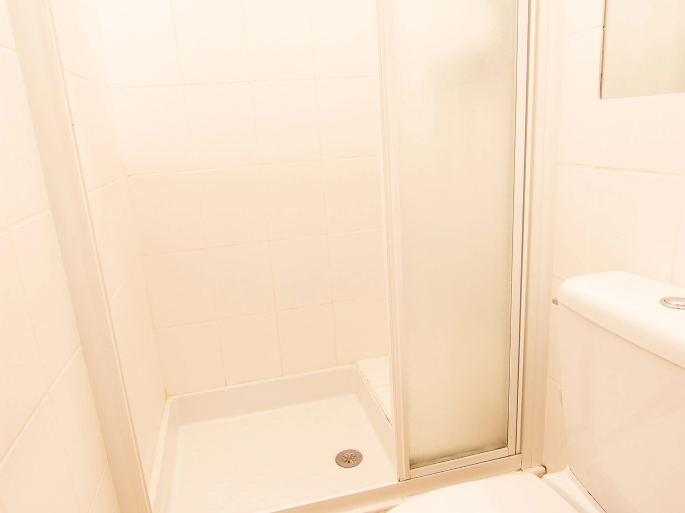 Badezimmer 1: Waschbecken, Dusche und WC.
