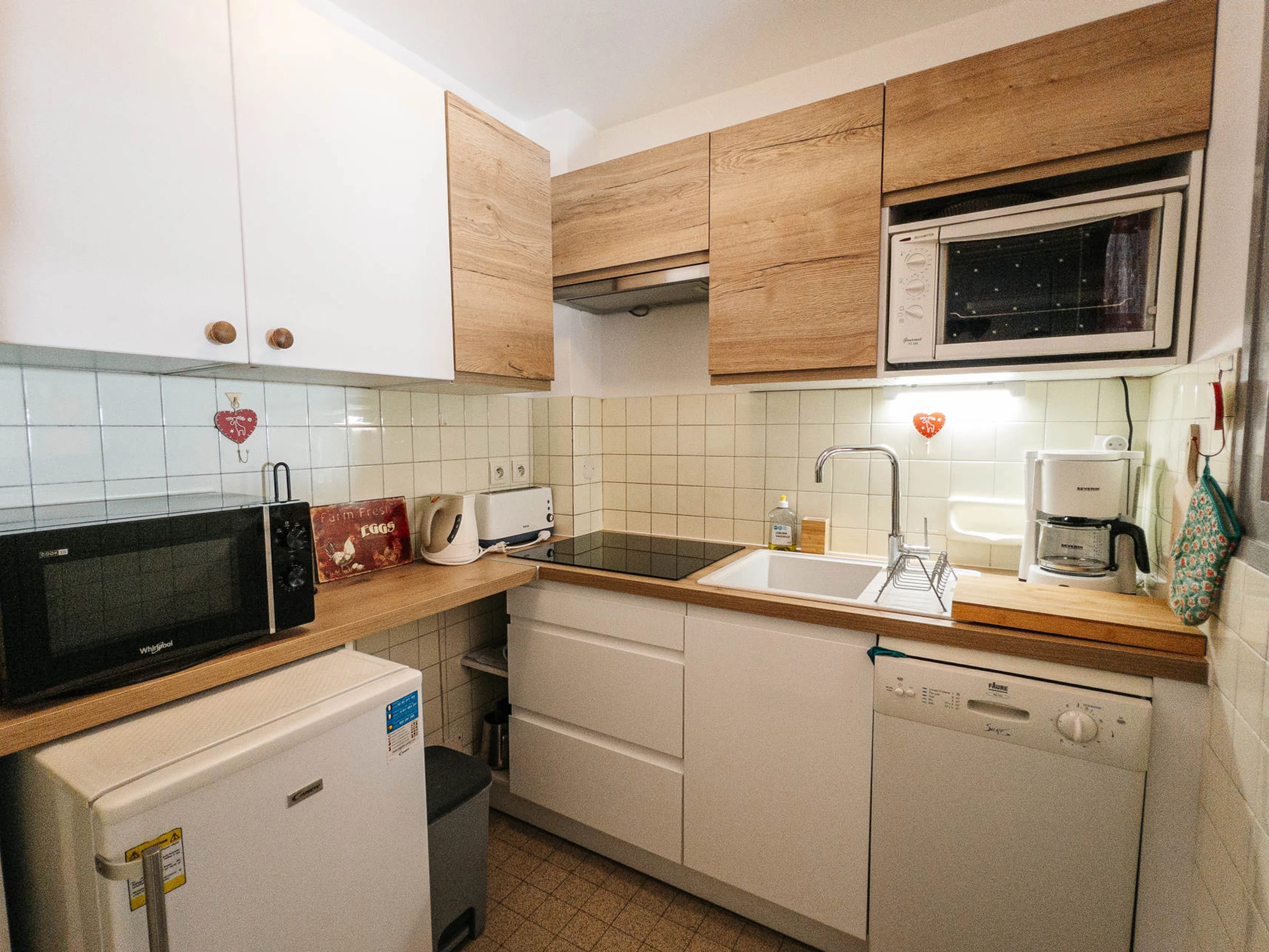 Separate Küche: Backofen, Kühlschrank, Mikrowelle mit Grillfunktion, Cerankochfeld (3 Kochplatten) und Geschirrspüler.