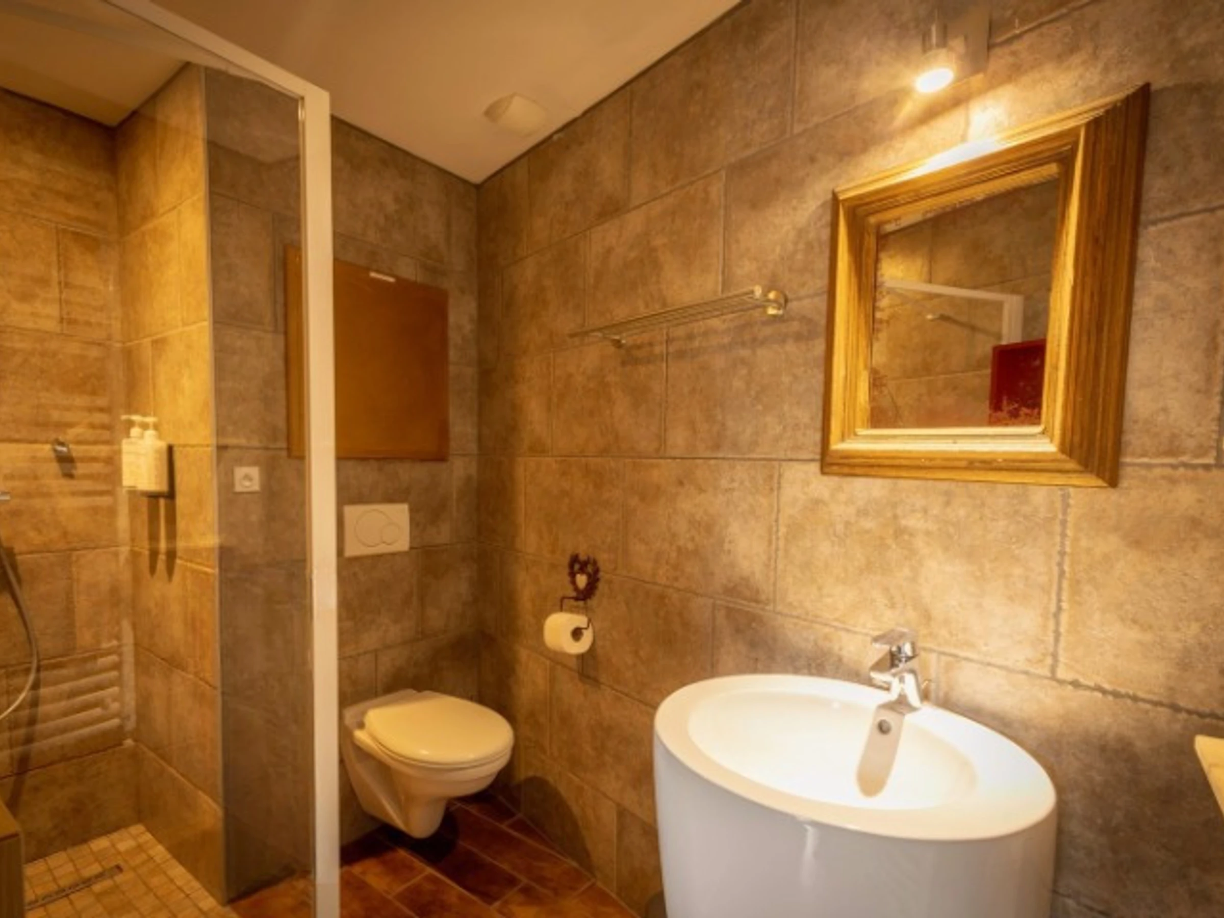 Privates Badezimmer (Schlafzimmer 1): Waschbecken, Dusche und Toilette.