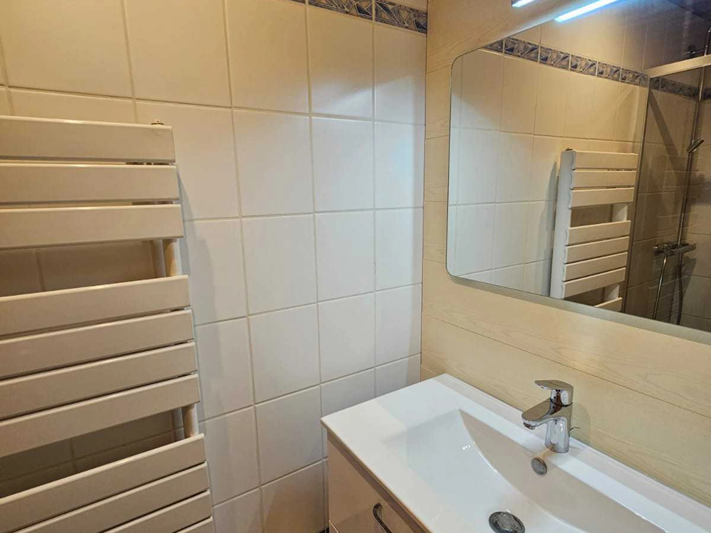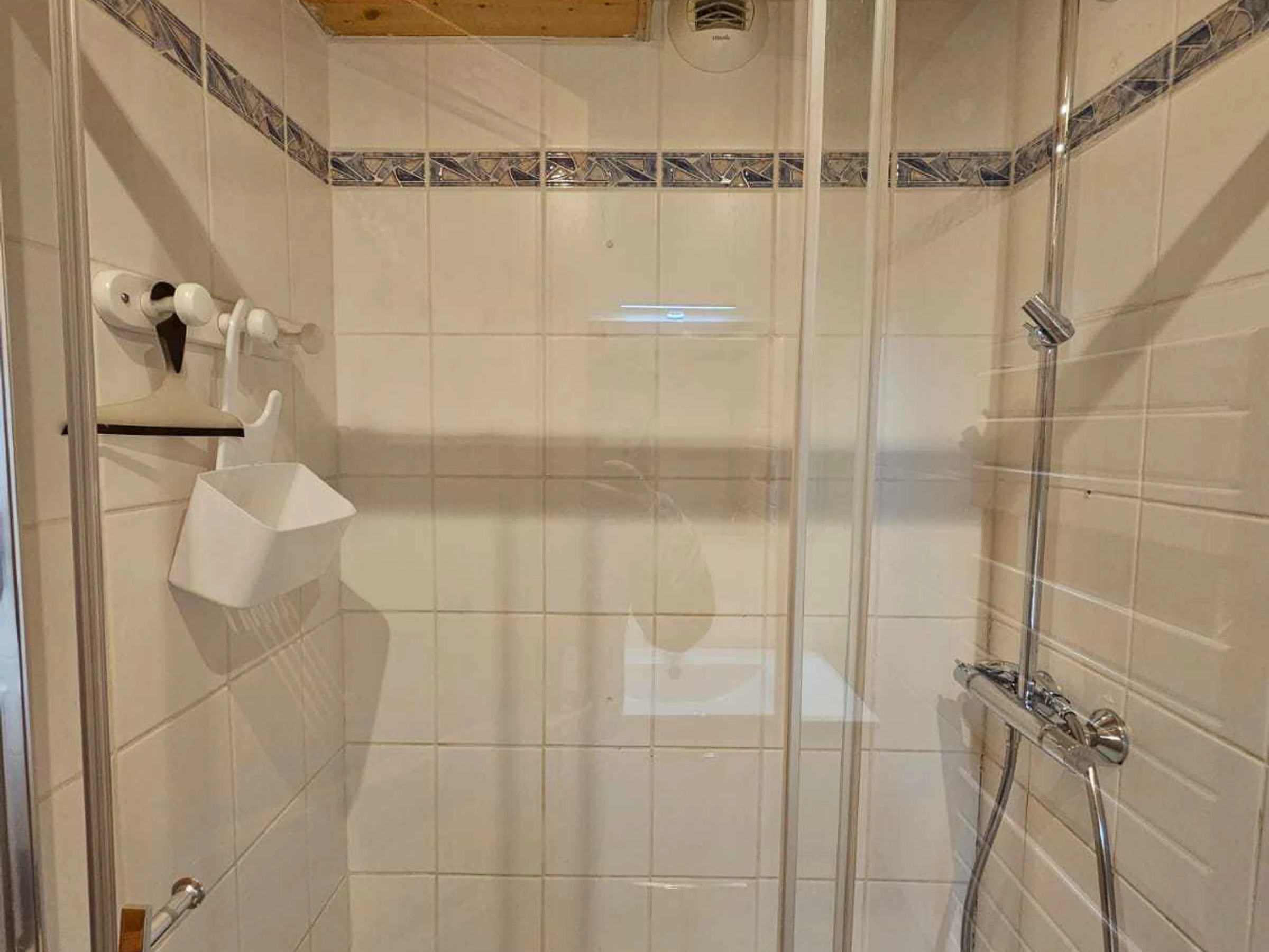 Badezimmer: Waschbecken, Dusche, Föhn