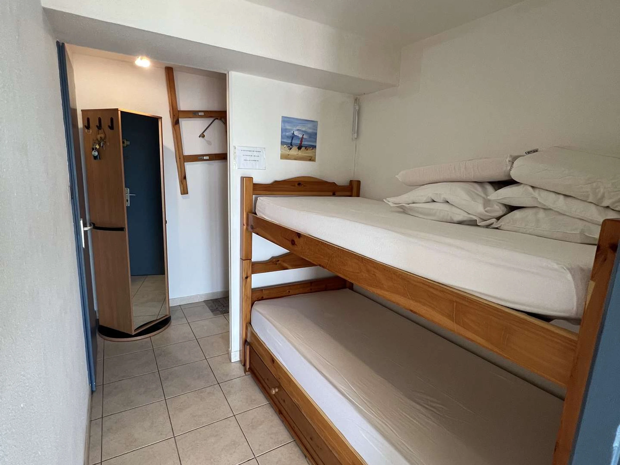 Aufteilung: Eingangsbereich mit zwei 90 cm breiten Etagenbetten, Wohnzimmer mit 140 cm breitem Schlafsofa, voll ausgestattete Küchenzeile (Mikrowelle, Herd, Kühlschrank, Gefrierschrank etc.), Loggia mit herrlichem Hafen- und Meerblick sowie Badezimmer mit Dusche, Waschbecken und WC.