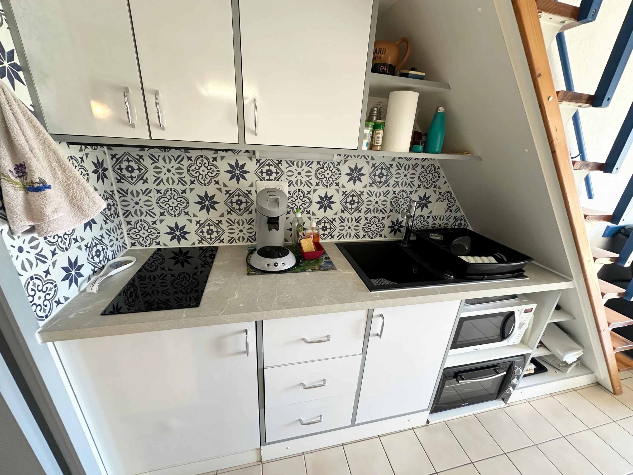 Klimatisierte, helle und gut ausgestattete Wohnküche für einen komfortablen Urlaub (Herd, Kühlschrank, Mikrowelle, Geschirr etc.)