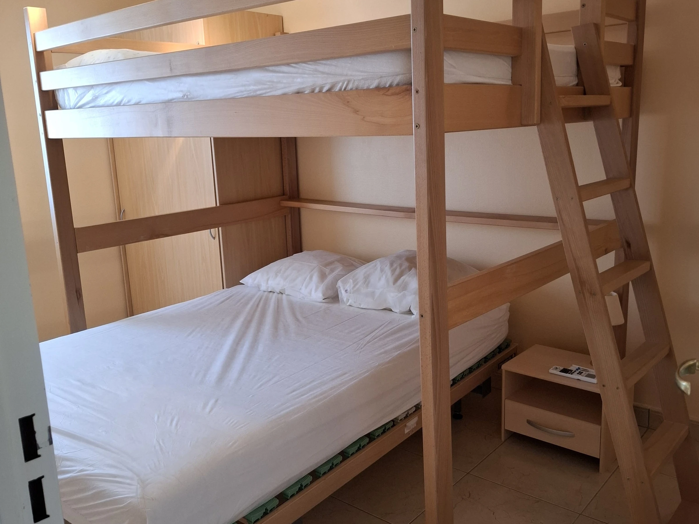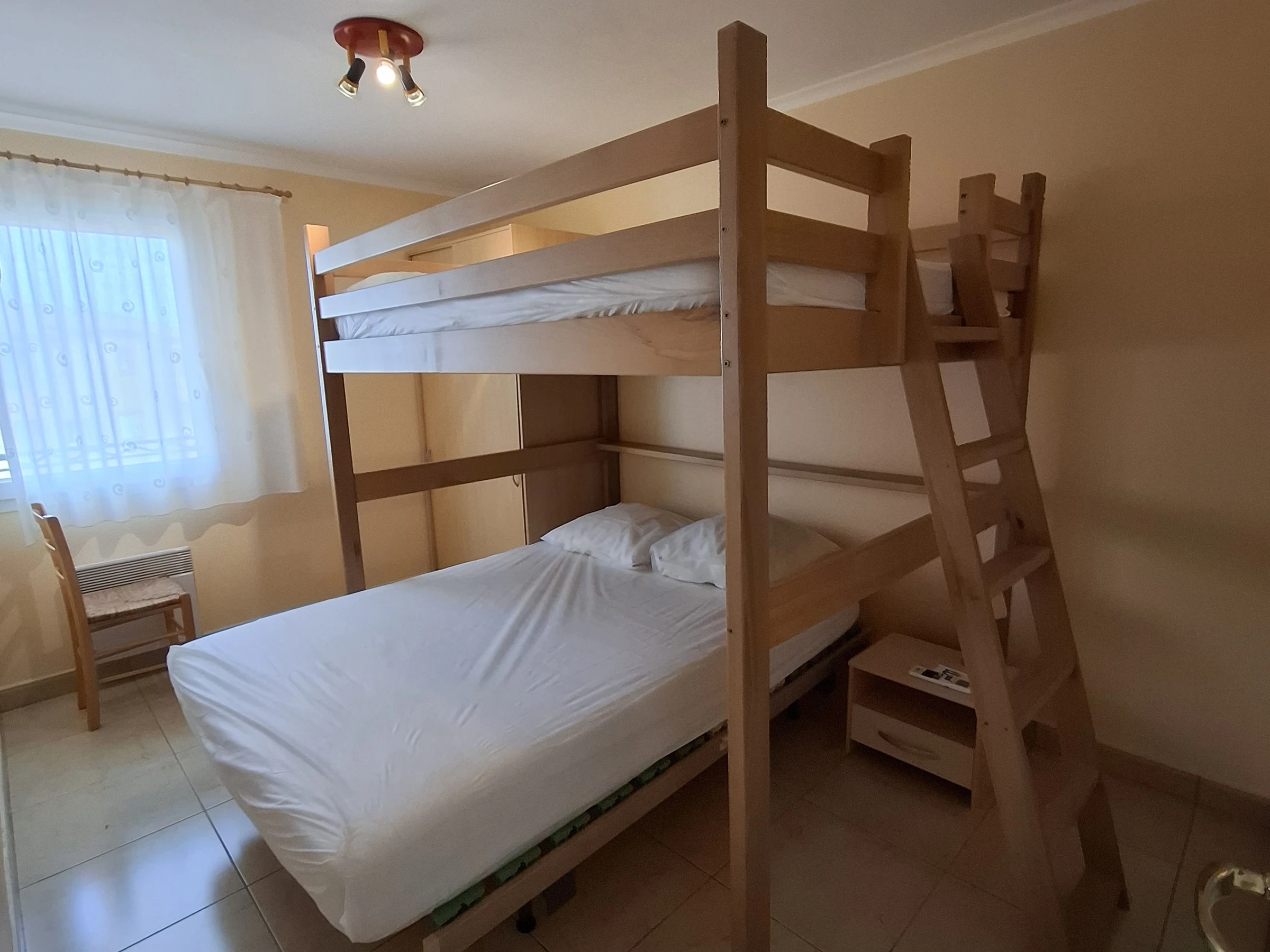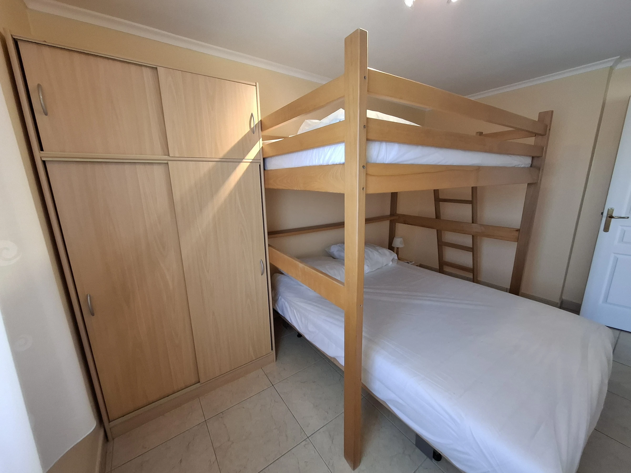 Im Obergeschoss befinden sich ein Schlafzimmer mit Doppelbett (140 cm), Stauraum und Klimaanlage sowie Zugang zu einem Balkon; ein zweites Schlafzimmer mit Doppelbett (140 cm) und darüberliegendem Etagenbett (140 cm), ebenfalls mit Klimaanlage und Kleiderschrank; ein Duschbad; und ein separates WC.