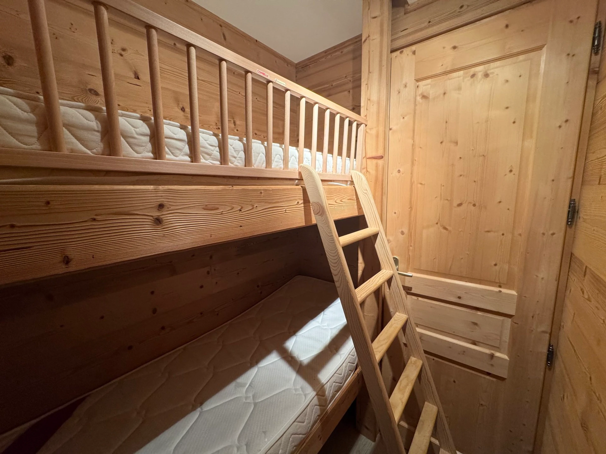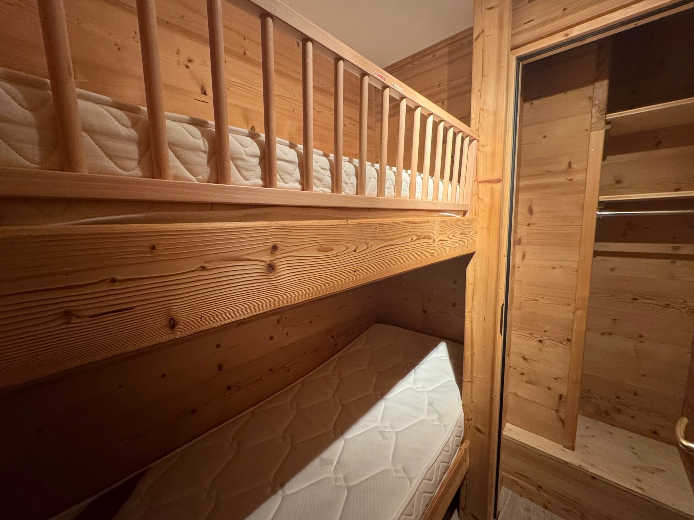 Der Schlafbereich umfasst ein Schlafzimmer mit Doppelbett und Stauraum sowie ein zweites Schlafzimmer mit Etagenbetten (zwei Einzelbetten) – ideal für die ganze Familie.