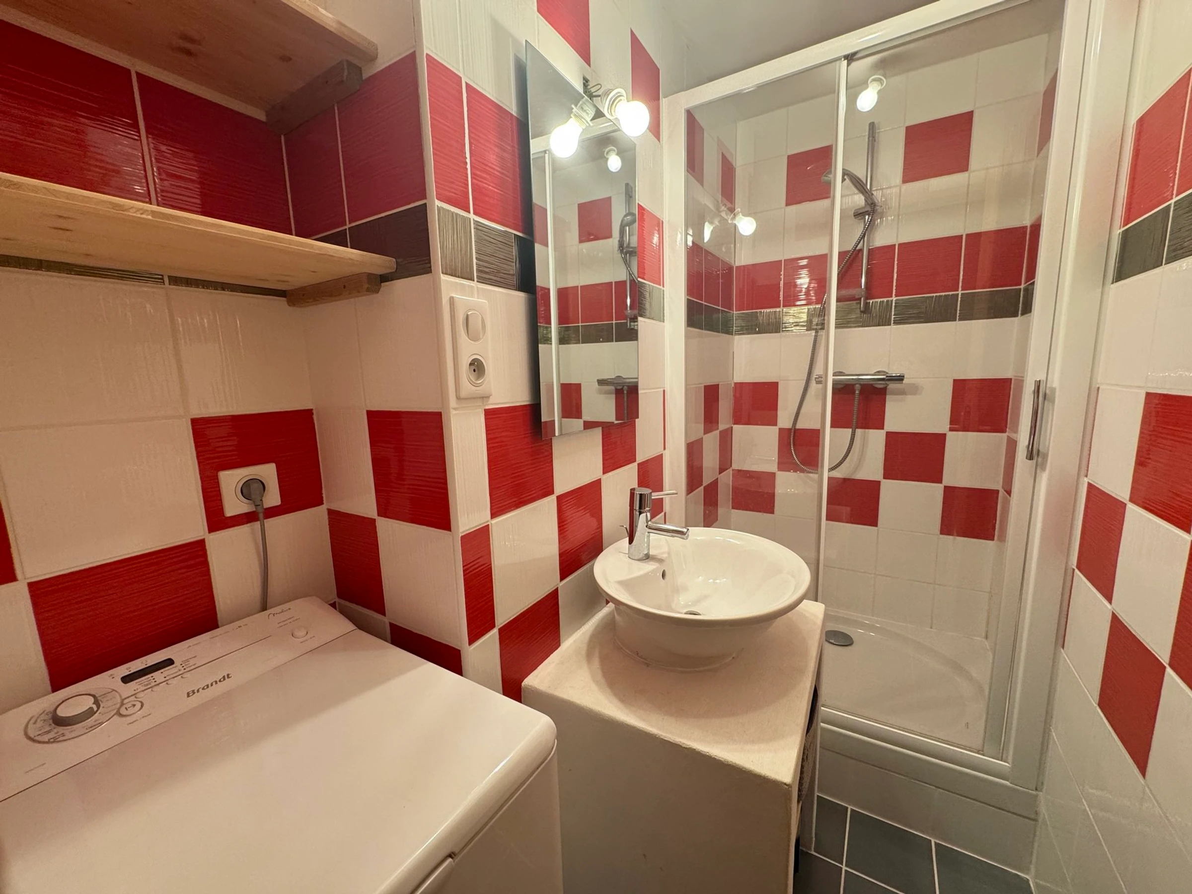 Das geschmackvoll eingerichtete Badezimmer bietet eine geräumige Dusche, einen Waschtisch und eine Waschmaschine für zusätzlichen Komfort.