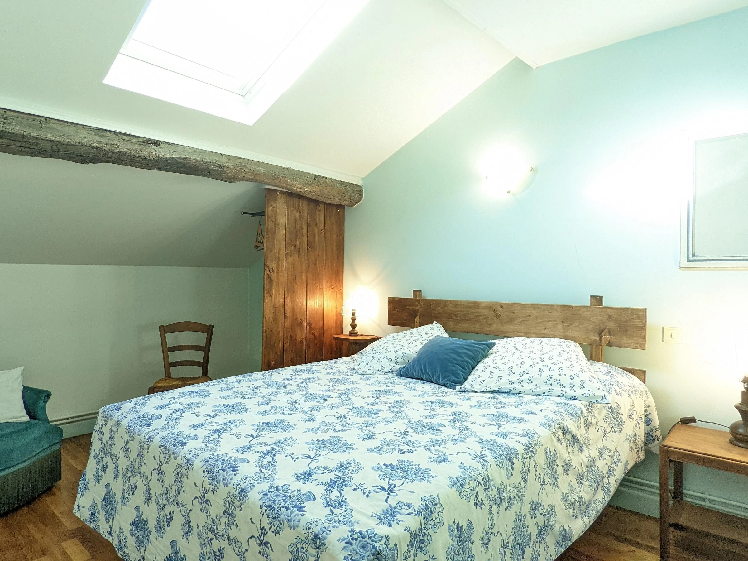 Obergeschoss: ein Dachbodenbad (niedrige Höhe in der Badewanne) mit WC, Schlafzimmer 1 bestehend aus einem Einzelbett (90x190) und einem Doppelbett (140x190), Schlafzimmer 2 bestehend aus einem Einzelbett (90x190) und einem Doppelbett (160x190). Für Ihren Komfort sind die Betten bei Ihrer Ankunft gemacht.