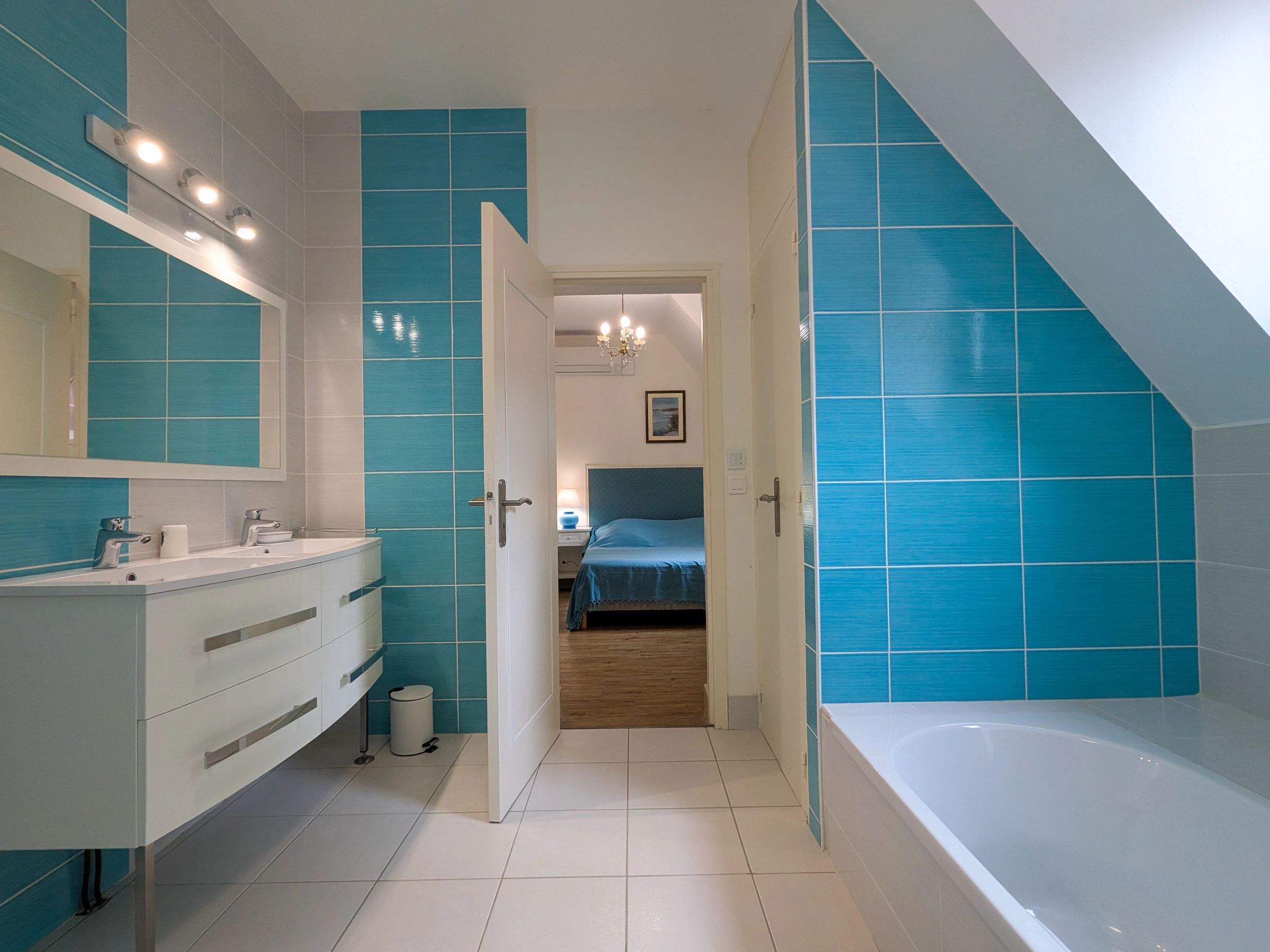 Obergeschoss: Ein großer Treppenabsatz, der in ein Büro und einen Ruhebereich umgewandelt wurde, führt zu zwei Schlafzimmern, jedes mit einem 160 cm breiten Bett und eigenem Zugang zu einem Duschbad oder Badezimmer.