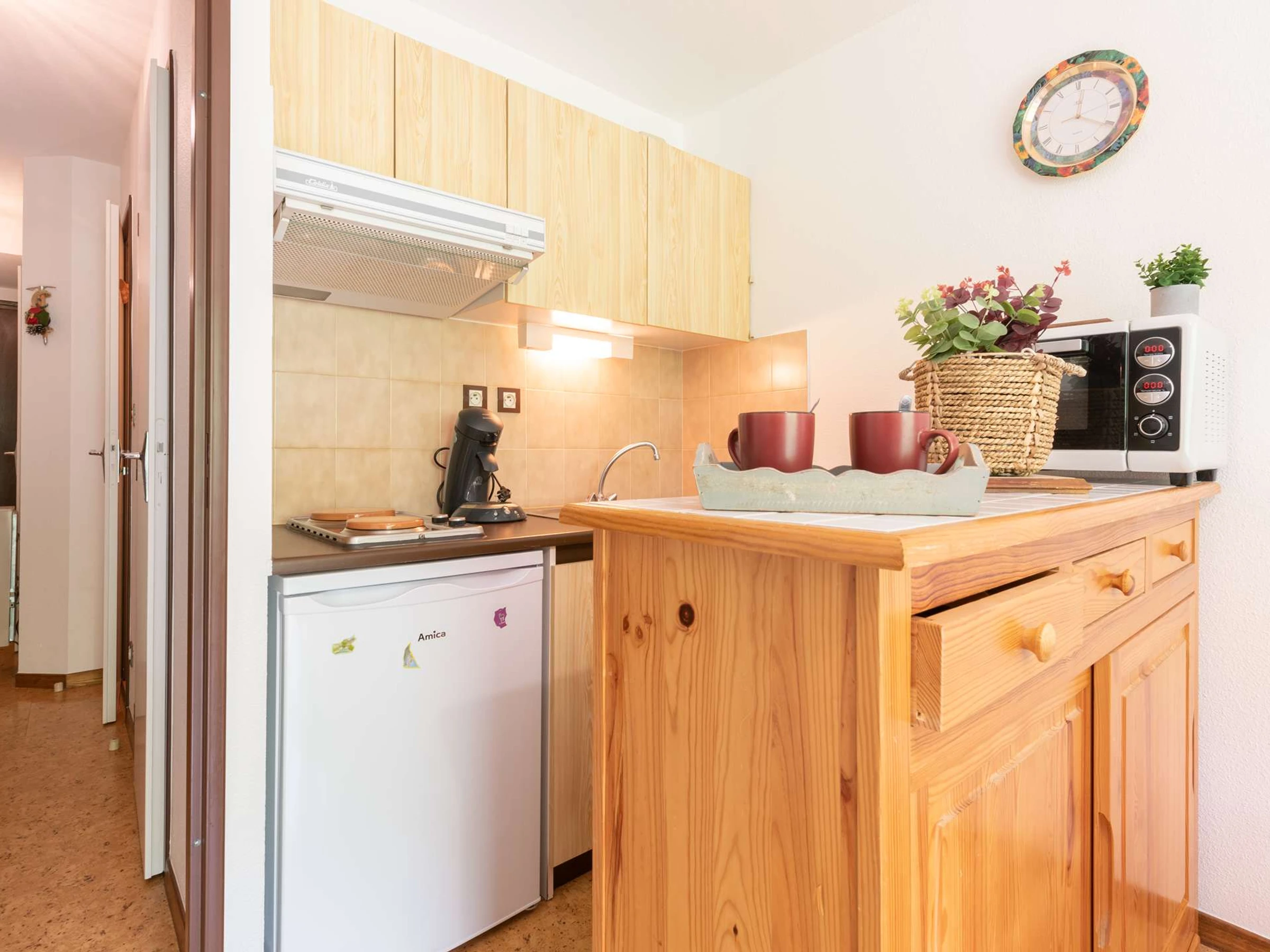 Eine ausgestattete Küchenzeile, die zum Wohnzimmer hin offen ist