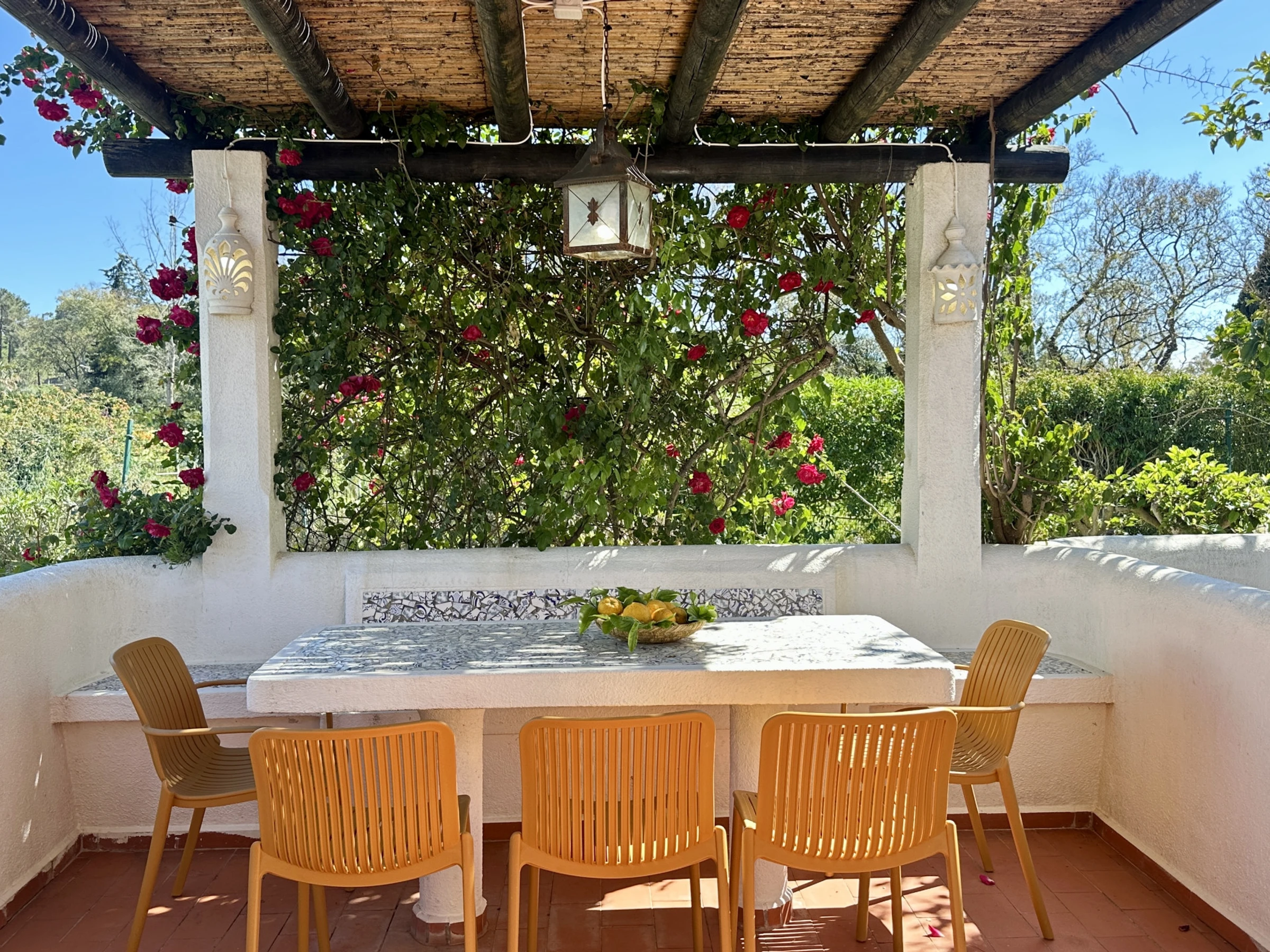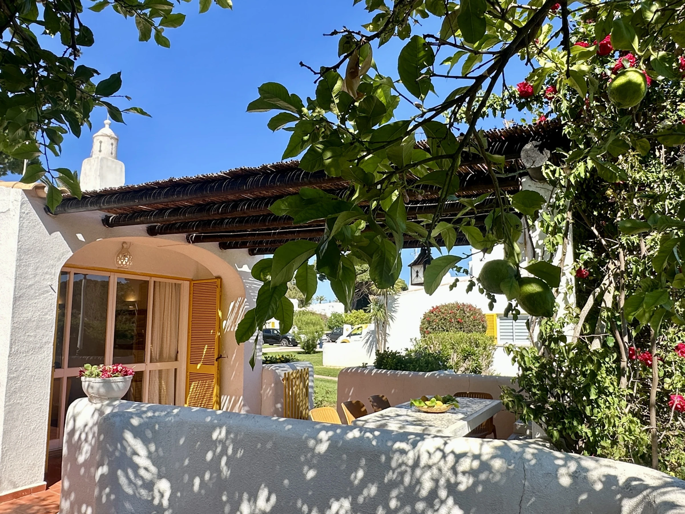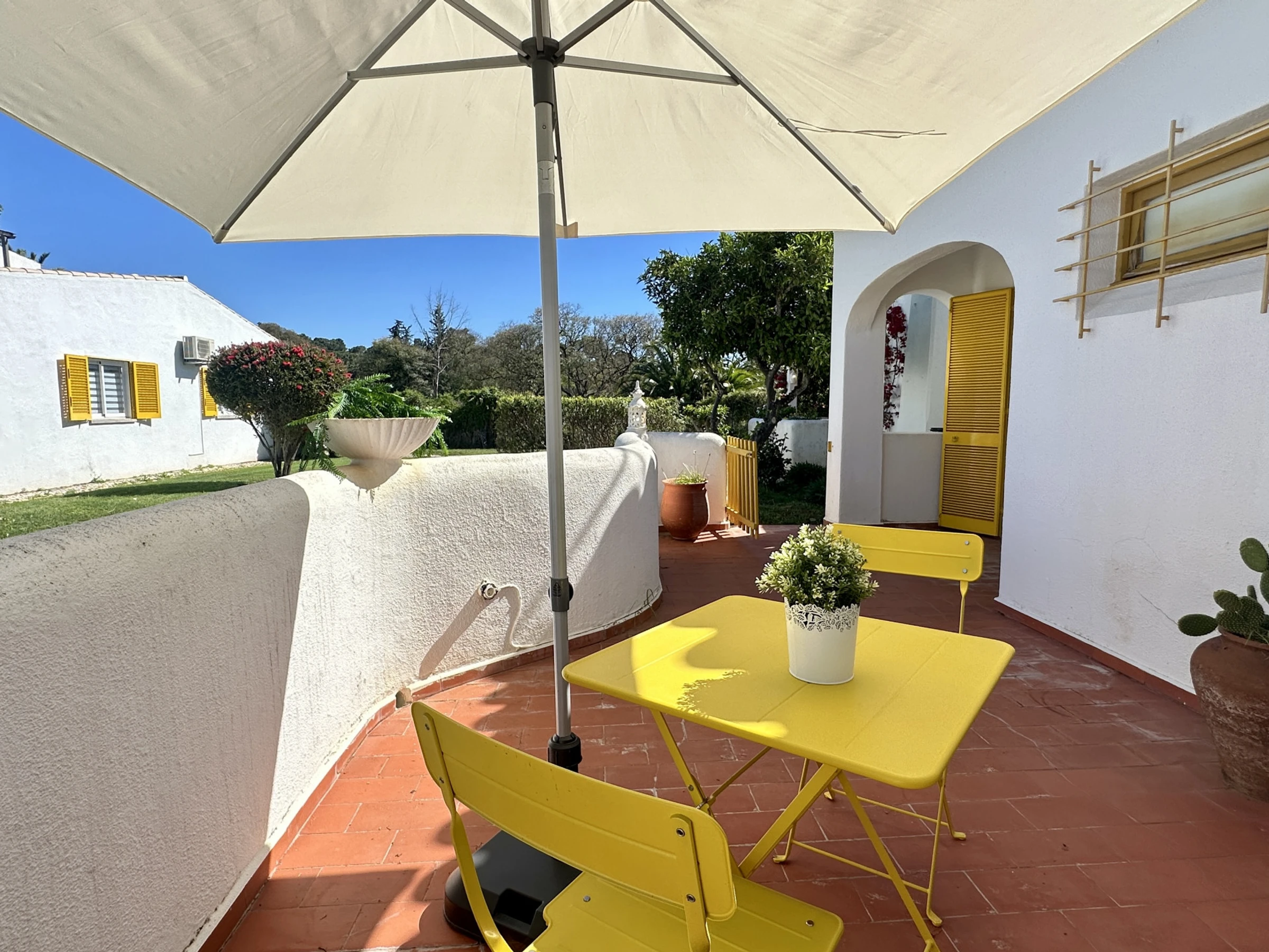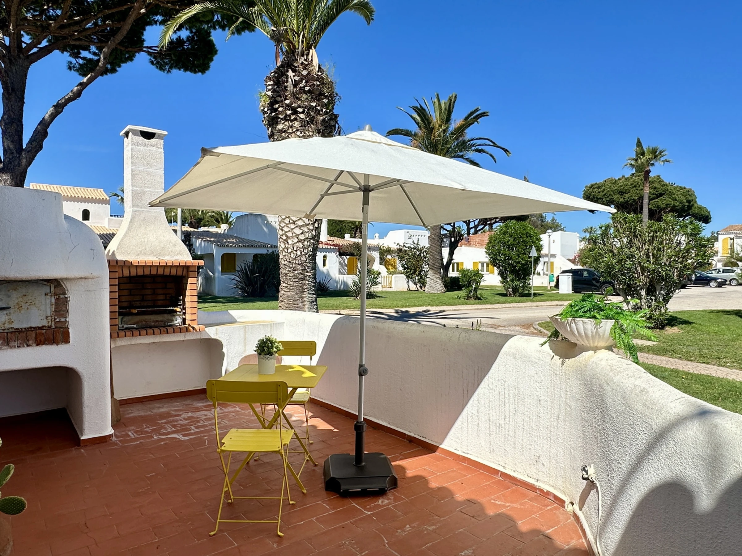 Der Außenbereich lädt dazu ein, das Klima der Algarve zu genießen, mit angenehmen Bereichen zum Essen und Entspannen, ergänzt durch den Zugang zum gemeinsamen Swimmingpool der Anlage.