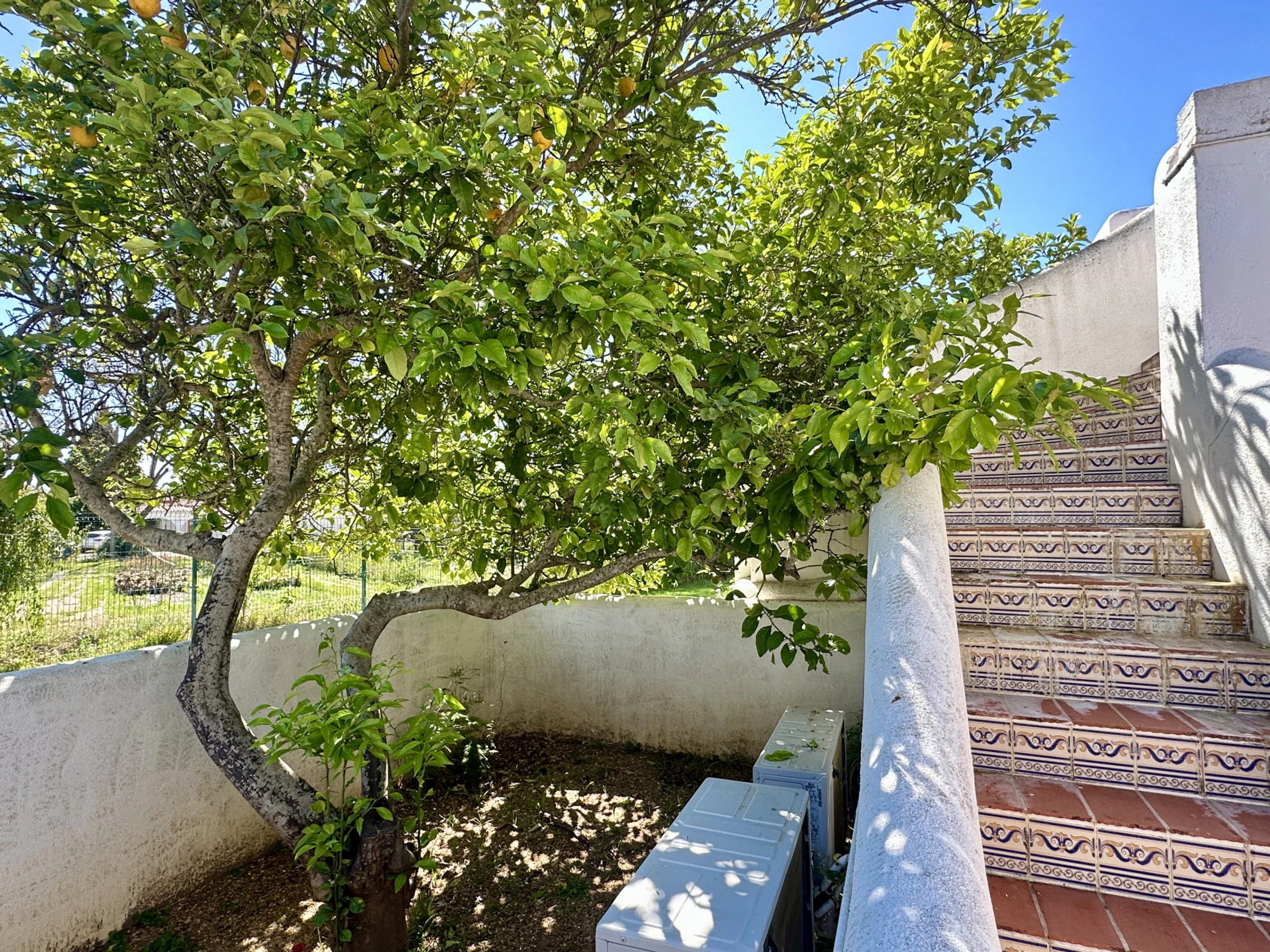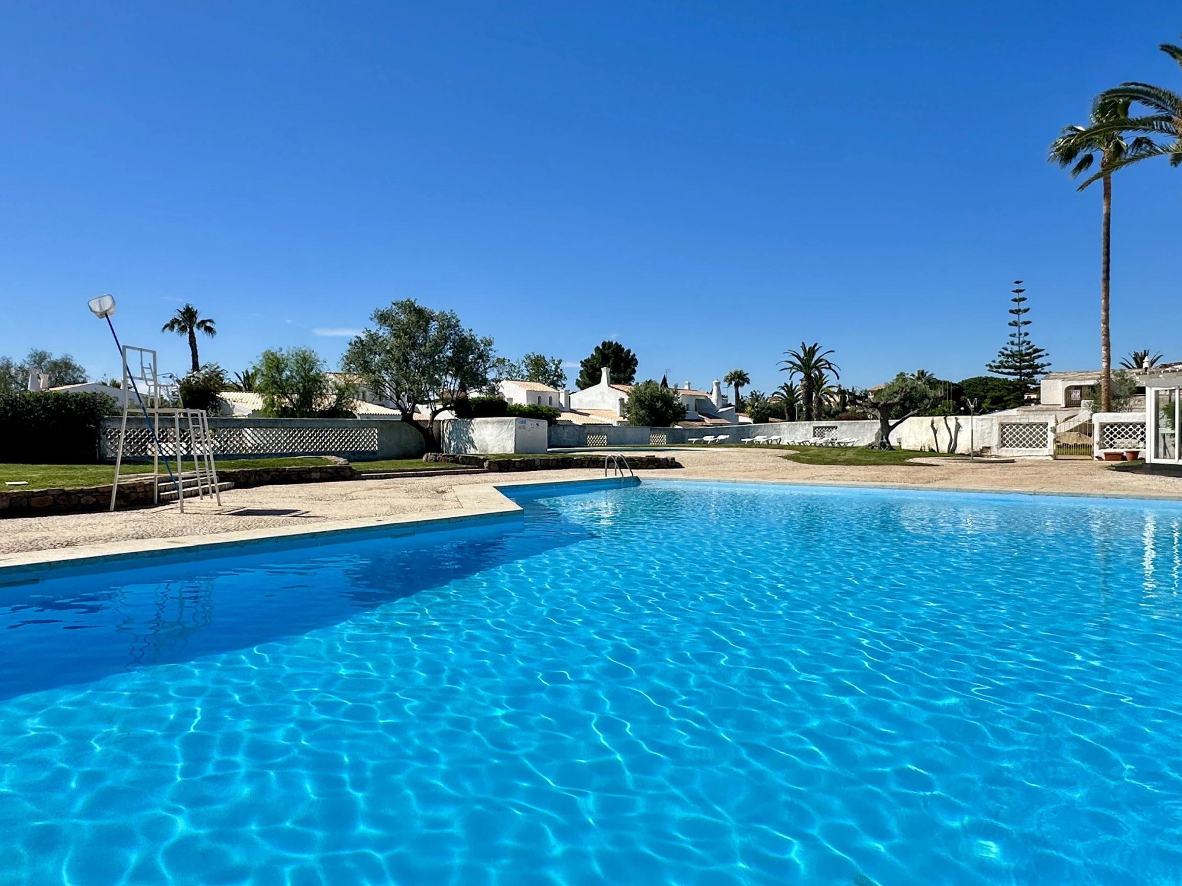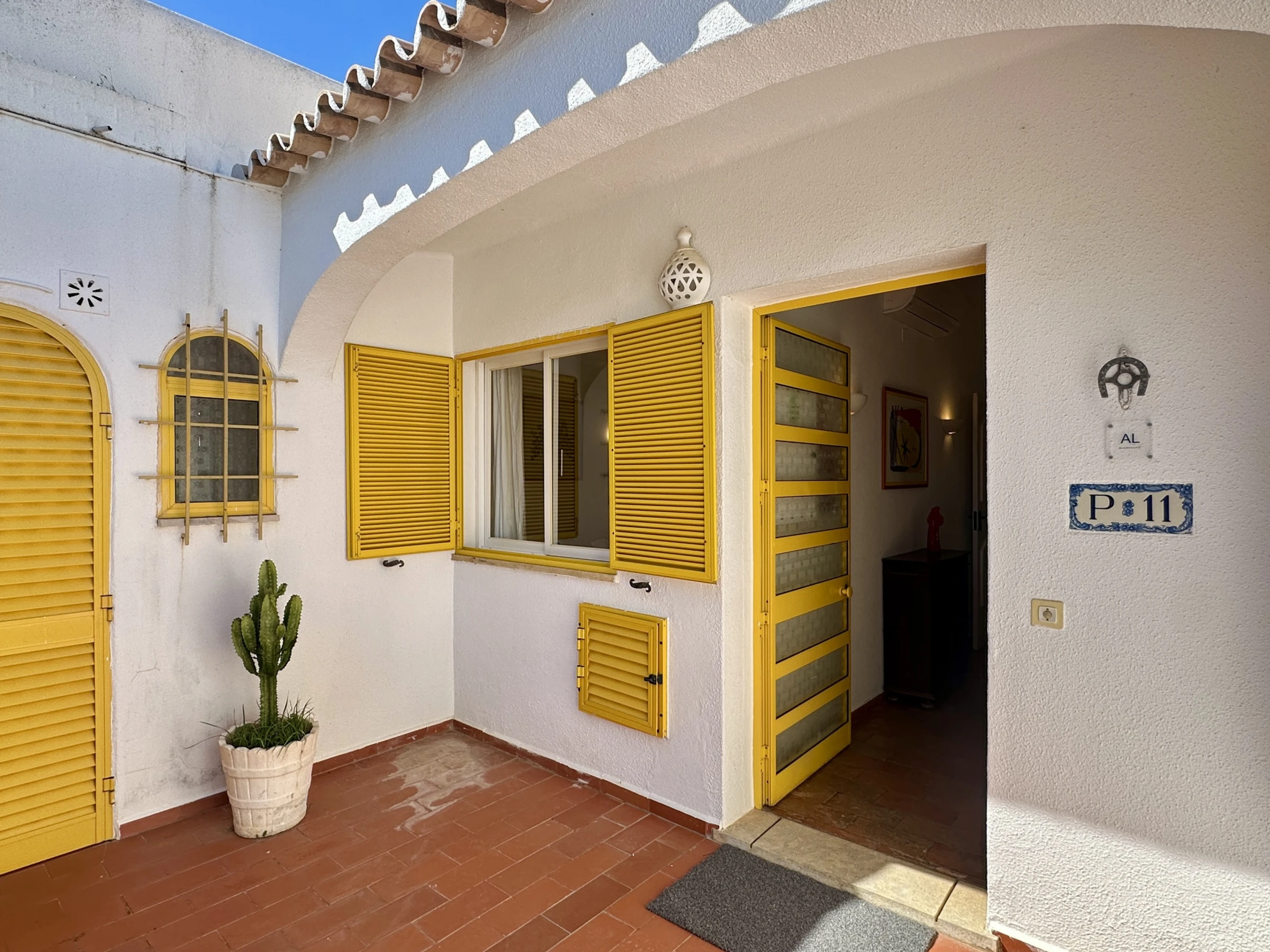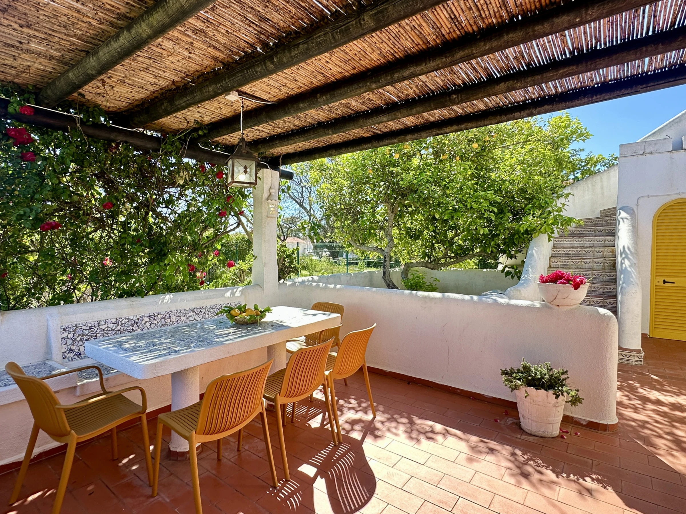 Der Außenbereich lädt dazu ein, das Klima der Algarve zu genießen, mit angenehmen Bereichen zum Essen und Entspannen, ergänzt durch den Zugang zum gemeinsamen Swimmingpool der Anlage.