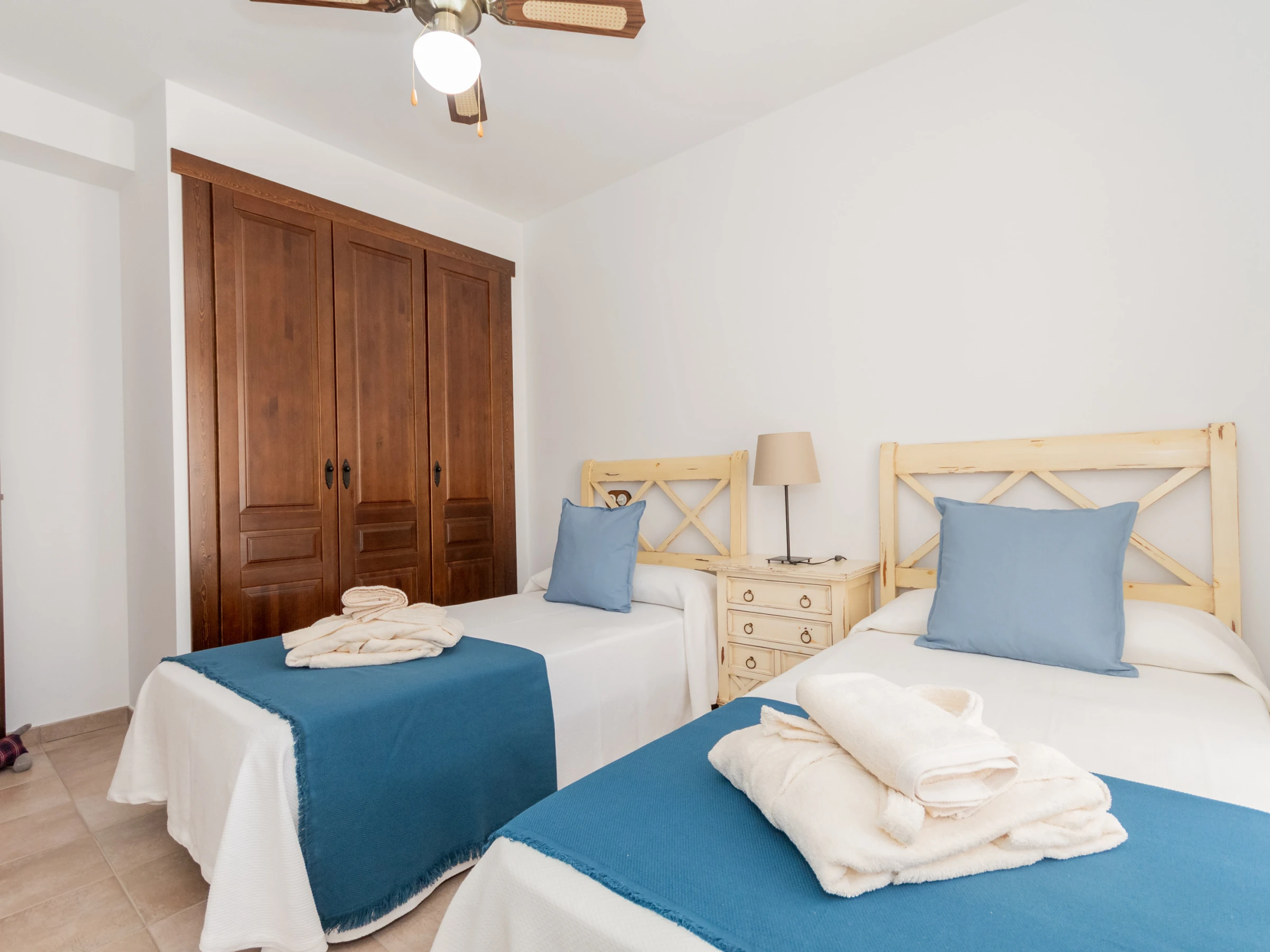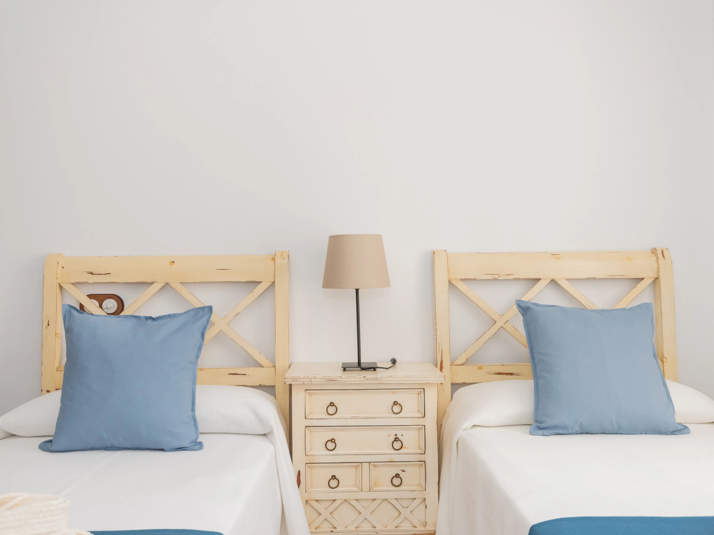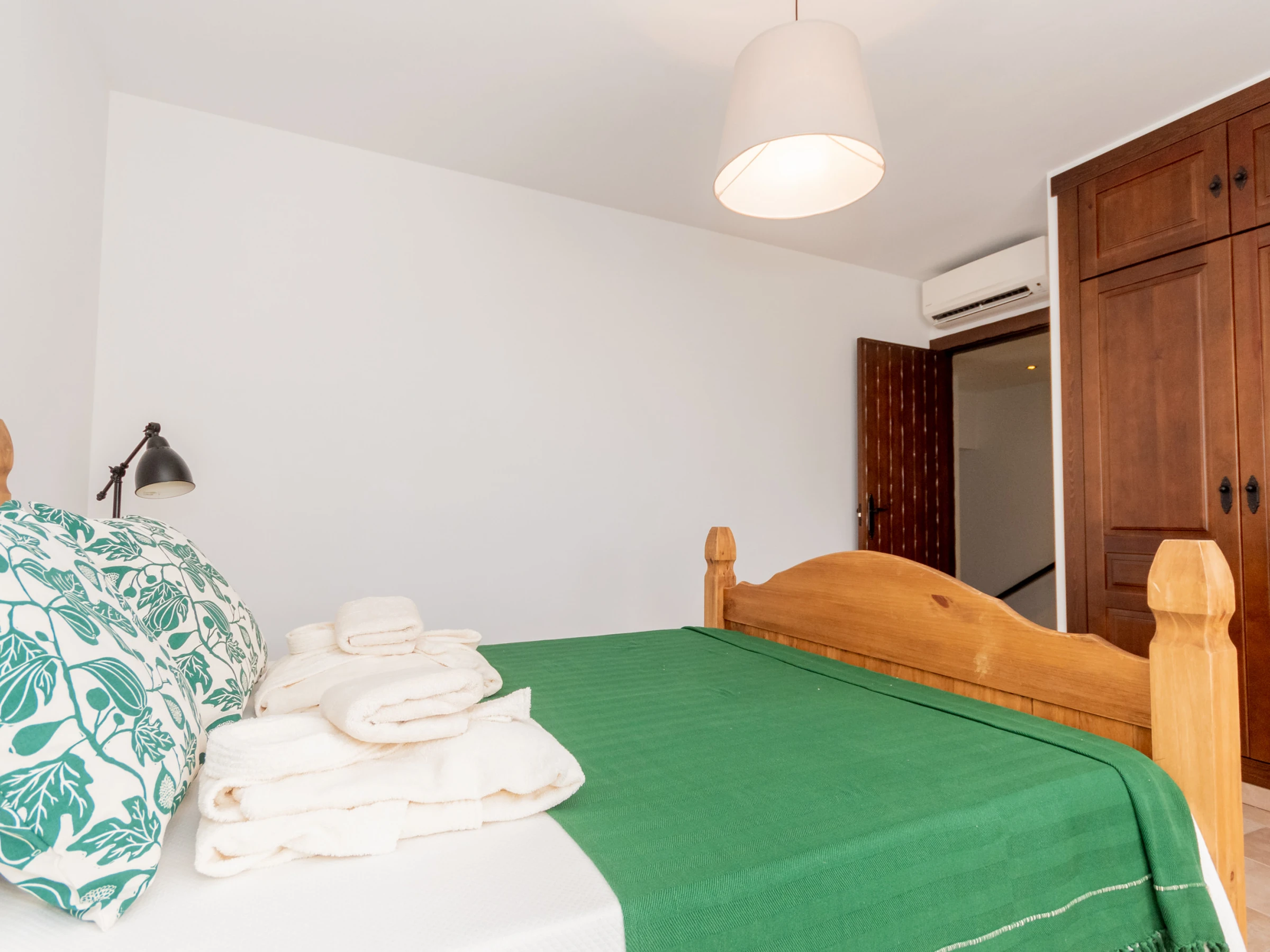 Im Obergeschoss befinden sich drei weitere Zimmer: eines mit einem Doppelbett von 1,35 cm und Klimaanlage, eines mit zwei Einzelbetten von 90 cm und Ventilator und ein Einzelzimmer mit einem Bett von 1,05 cm und Ventilator. Alle Zimmer verfügen über große Fenster, die natürliches Licht hereinlassen und Platz zum Verstauen des Gepäcks bieten. Außerdem gibt es ein großes Badezimmer mit Badewanne für mehr Komfort.