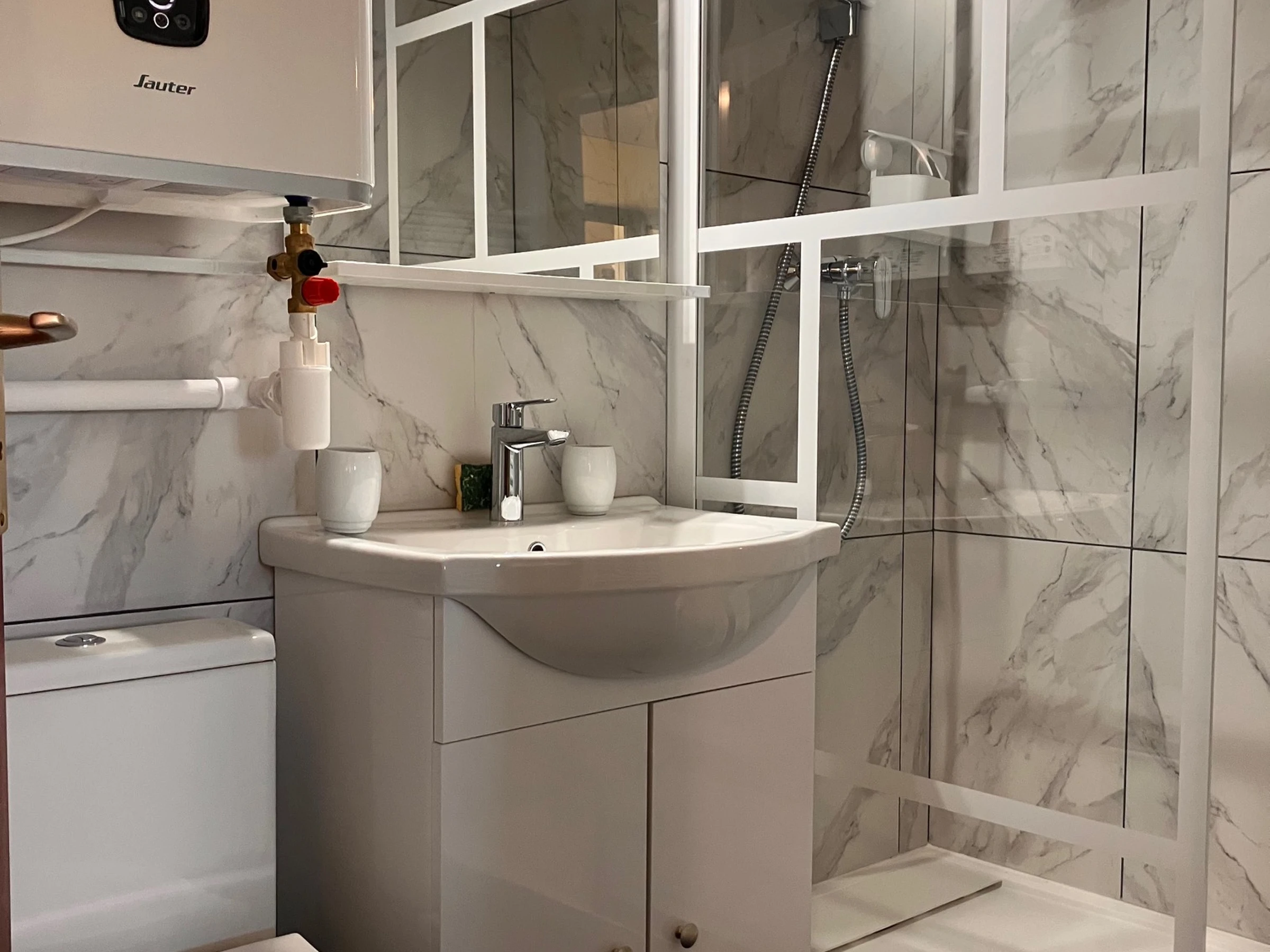 Ein schönes neues Badezimmer (Frühjahr 2025) mit eigenem WC und modernem Warmwasserspeicher. Ein Genuss, nach dem Strandbesuch zu duschen! Eine praktische Loggia für Aperitifs...