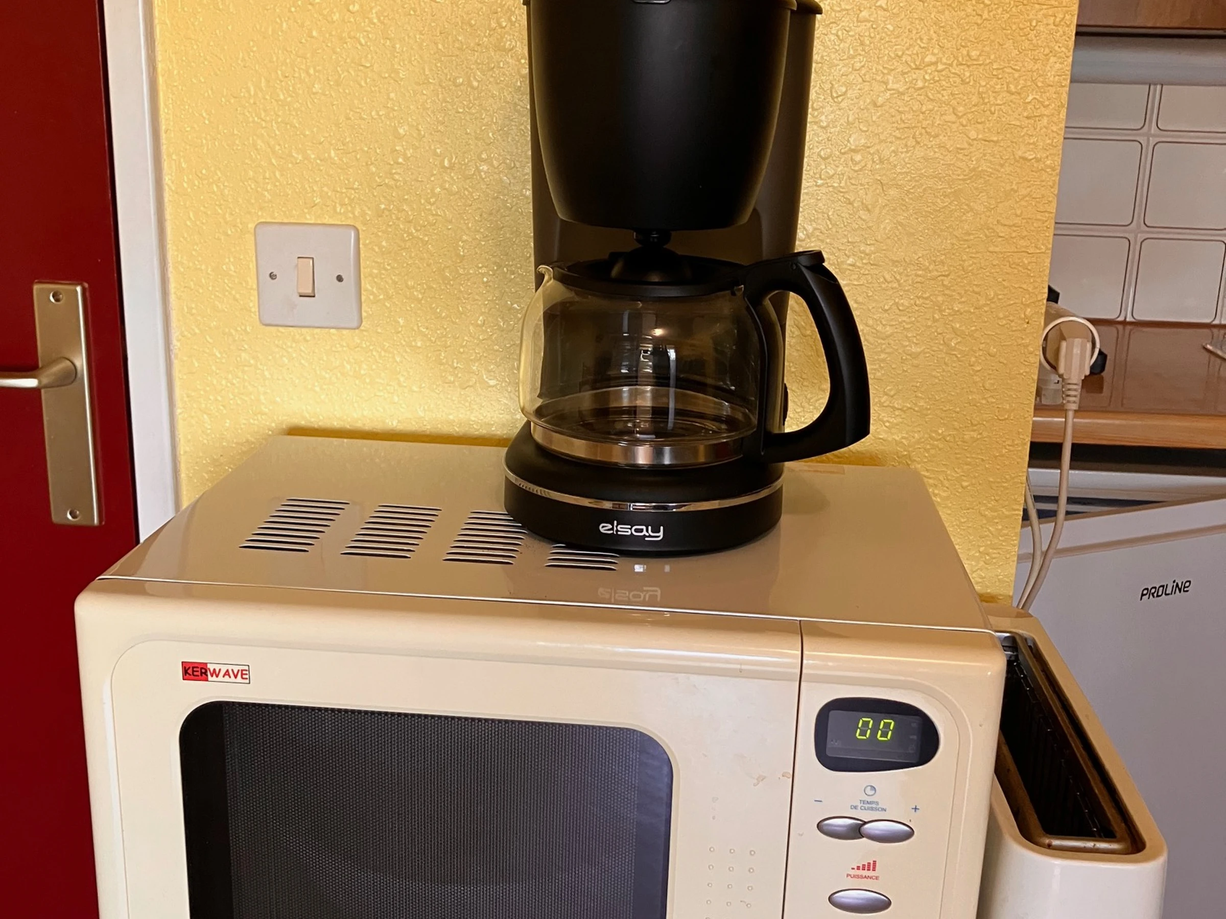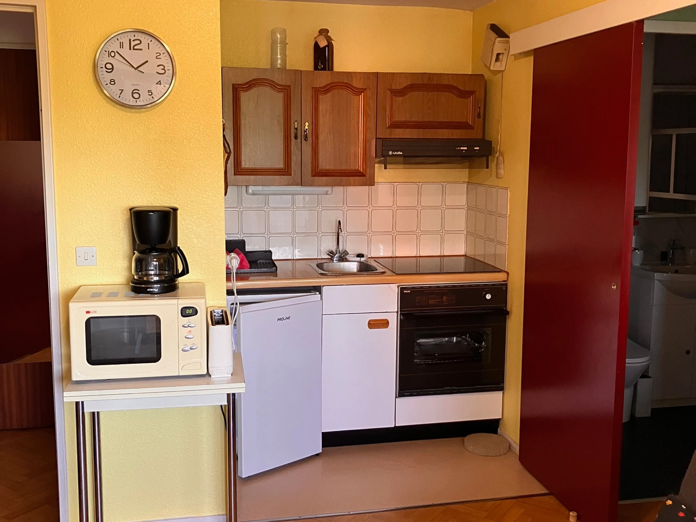 Eine praktische Küchenzeile mit Kühlschrank, Backofen, Cerankochfeld, Mikrowelle und allen wichtigen Küchenutensilien.