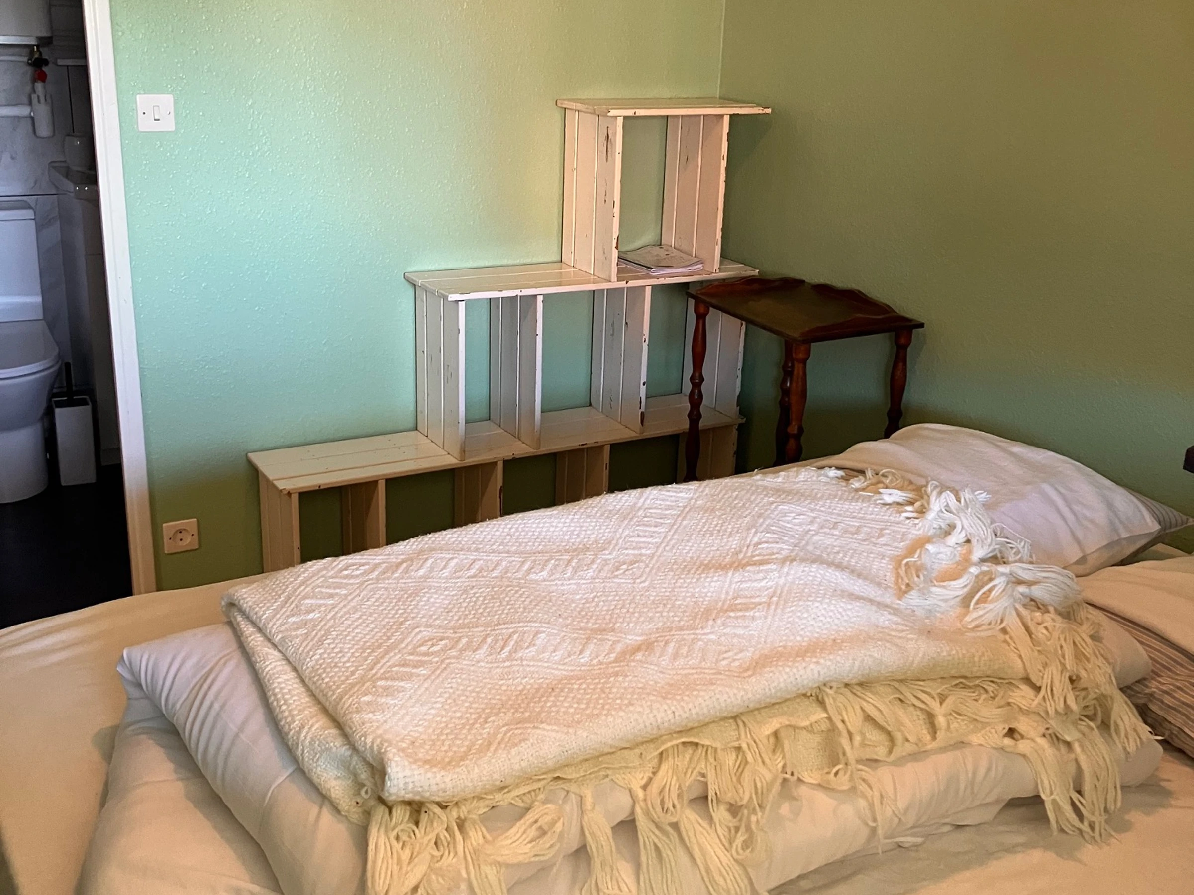 Ein Schlafzimmer mit einem 140 cm breiten Doppelbett.