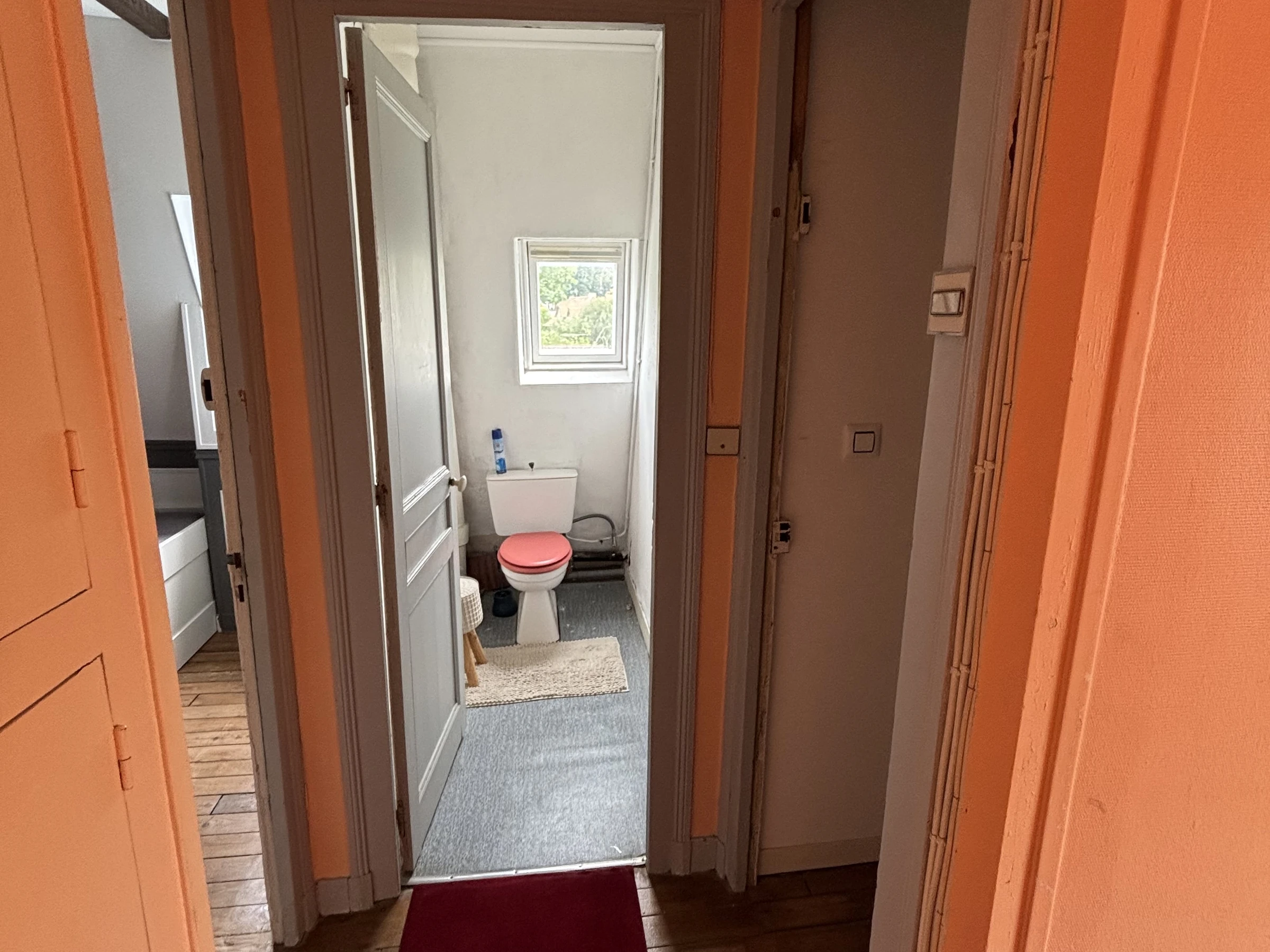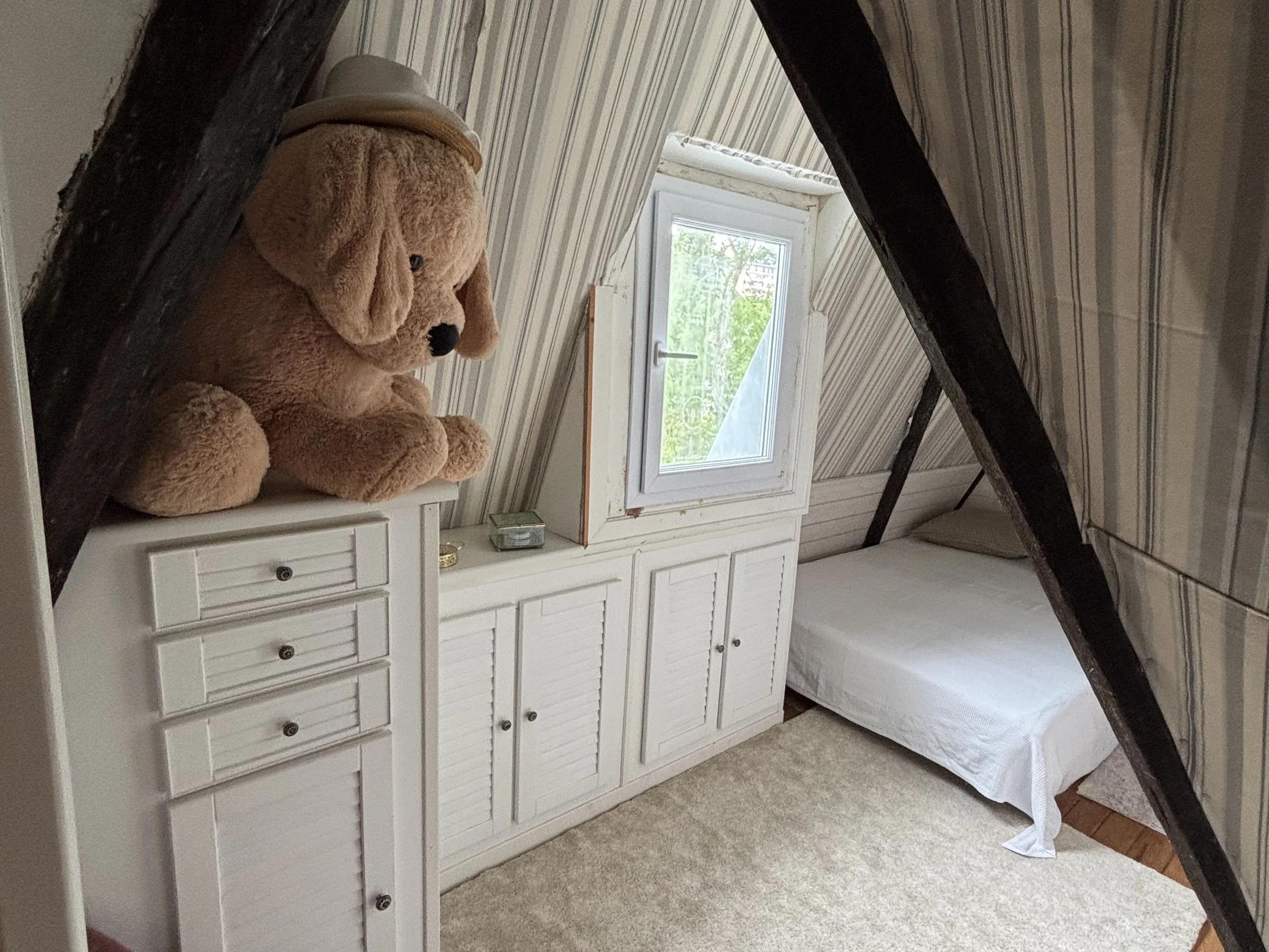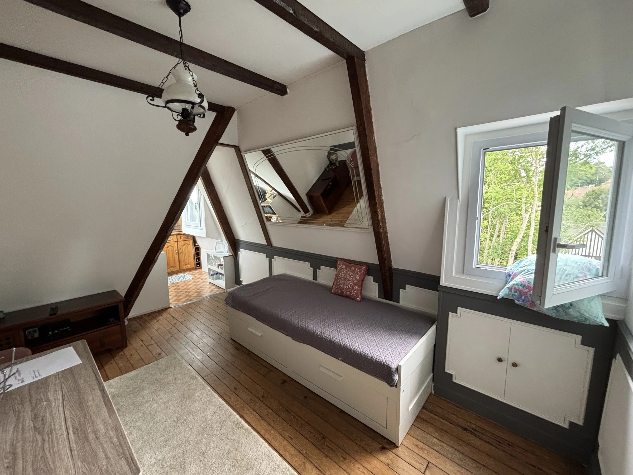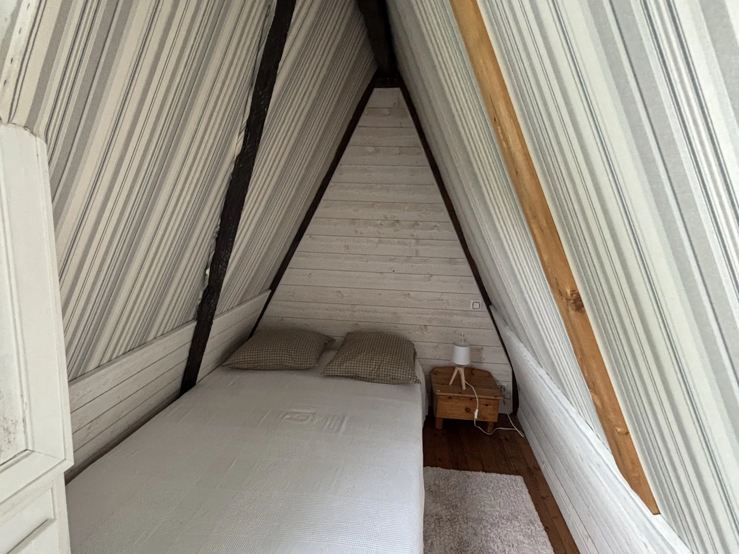 Ein Schlafzimmer im Dachgeschoss mit freiliegenden Balken, die eine warme und gemütliche Atmosphäre schaffen, und einem Doppelbett (140 x 190 cm).