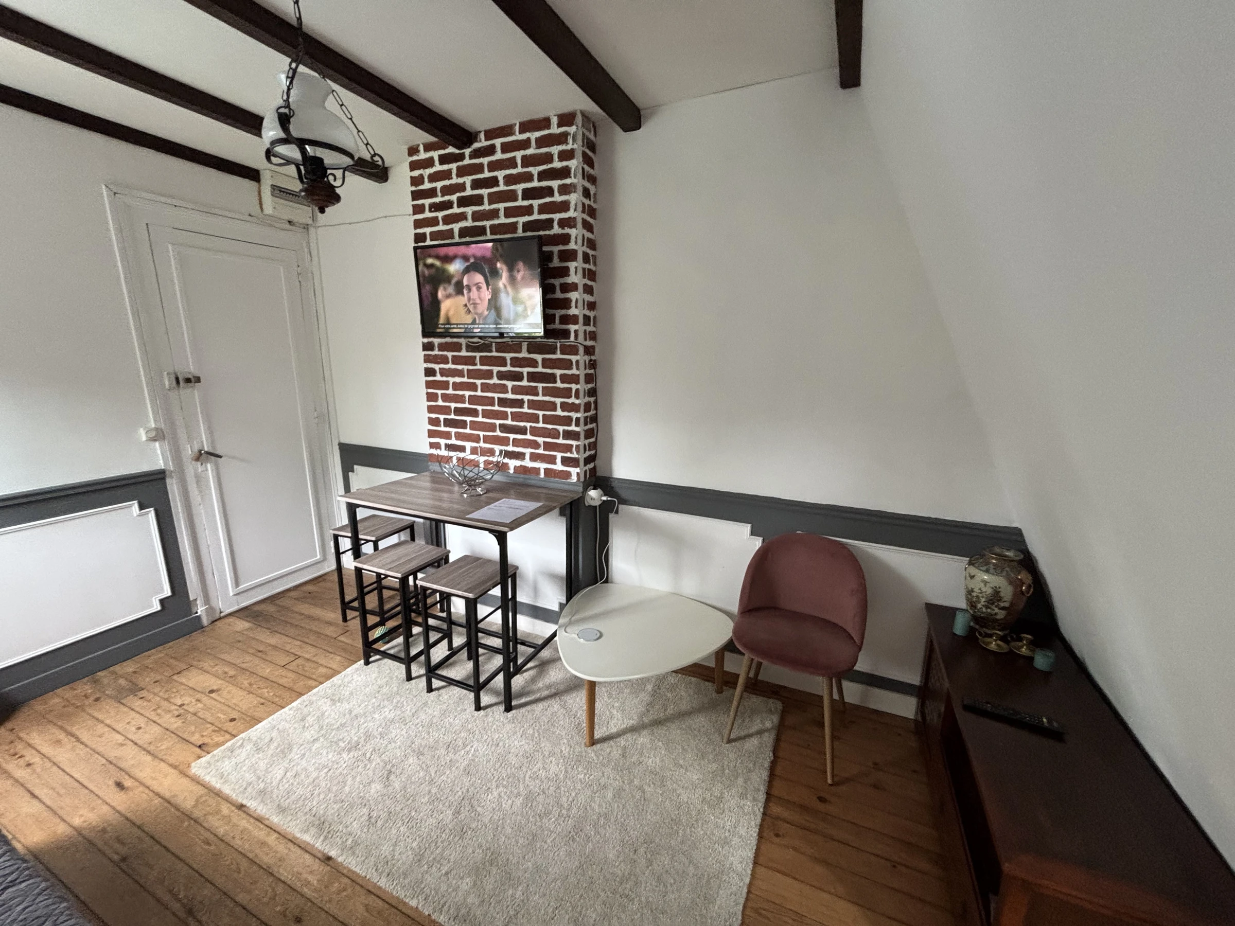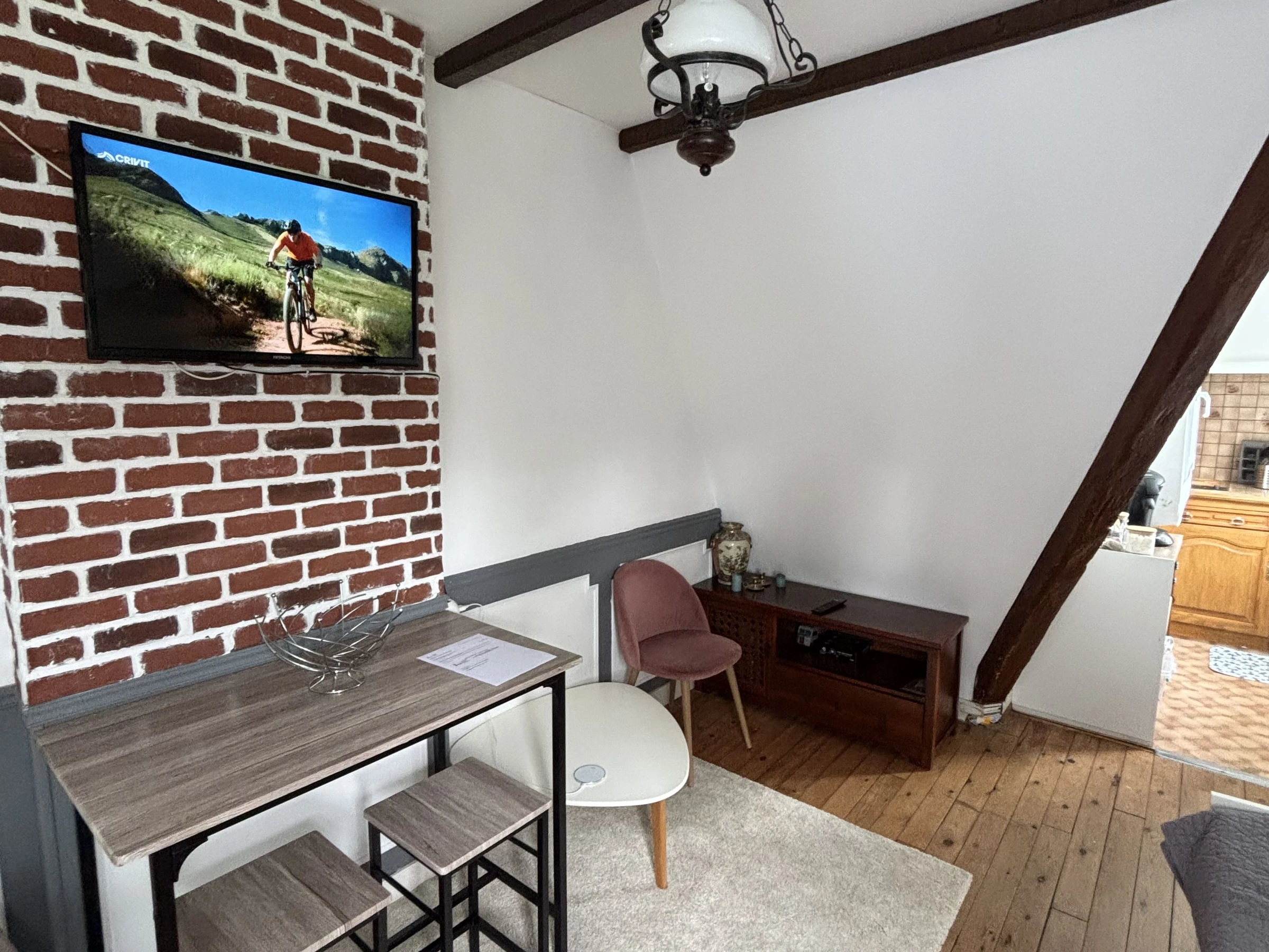 Ein Wohnzimmer mit Schlafsofa (Einzelbett), Essbereich und Fernseher.