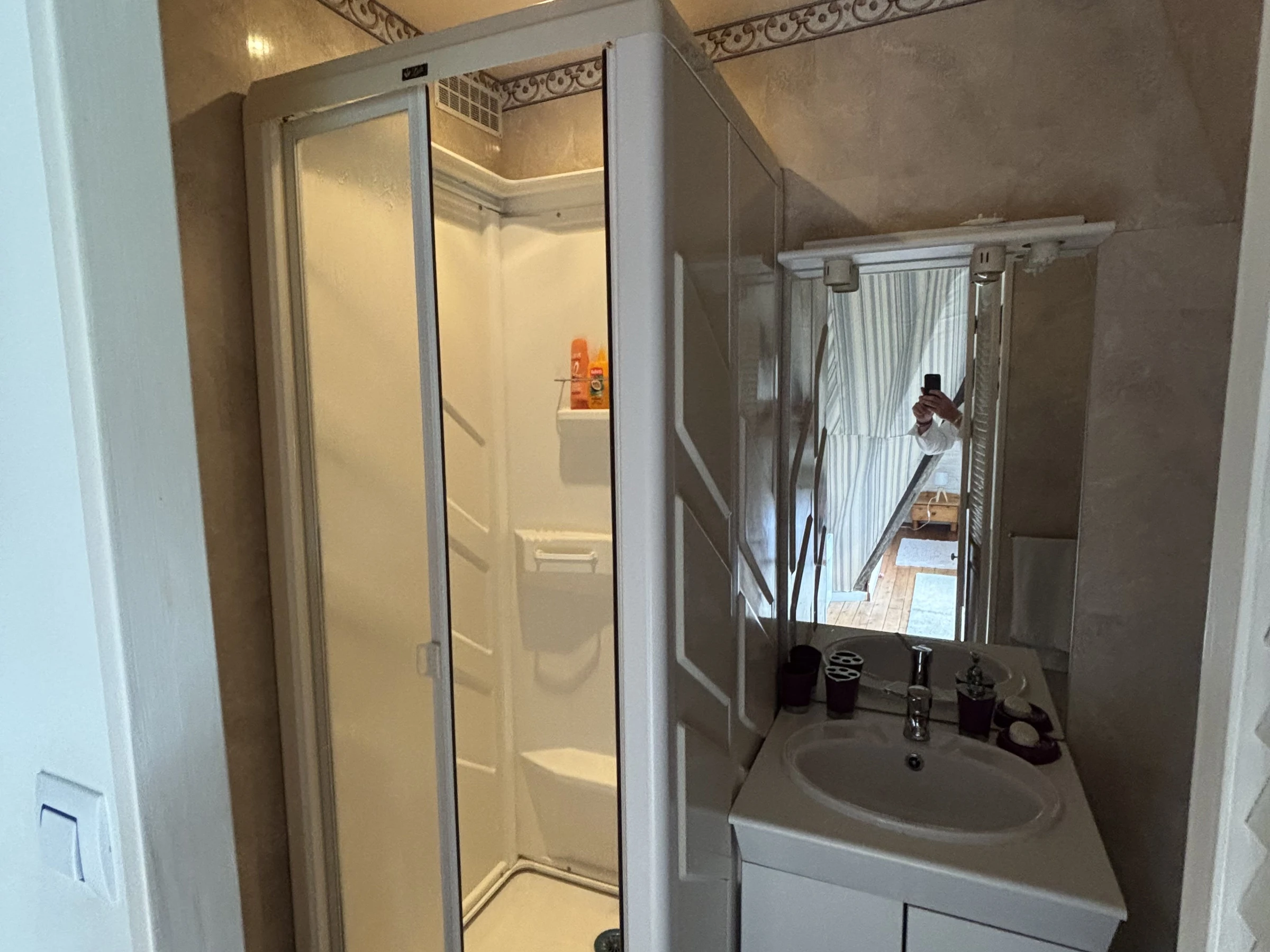 Ein Badezimmer mit Dusche, Waschbecken und WC.