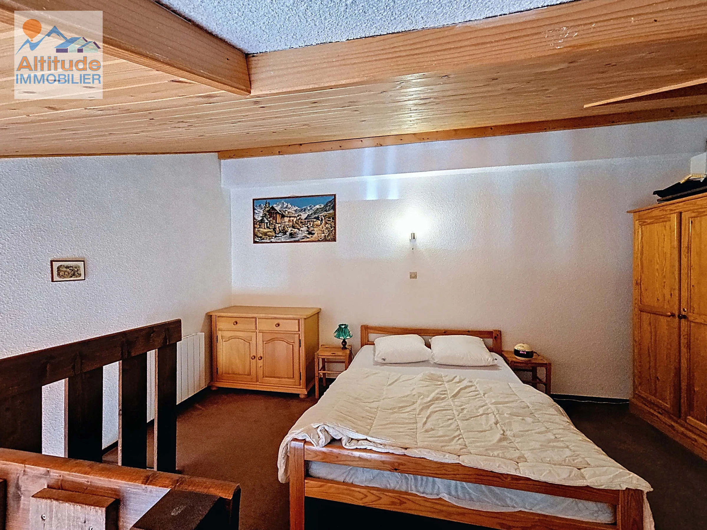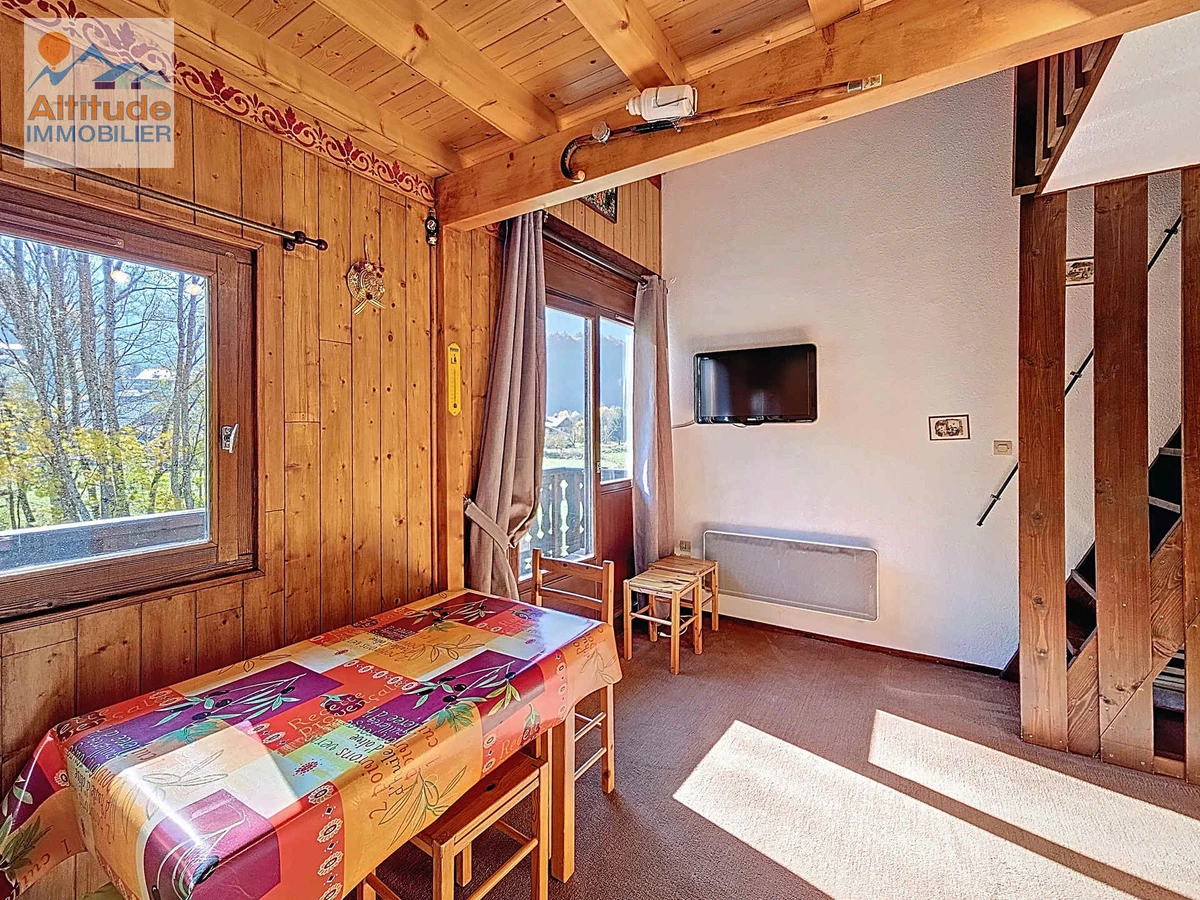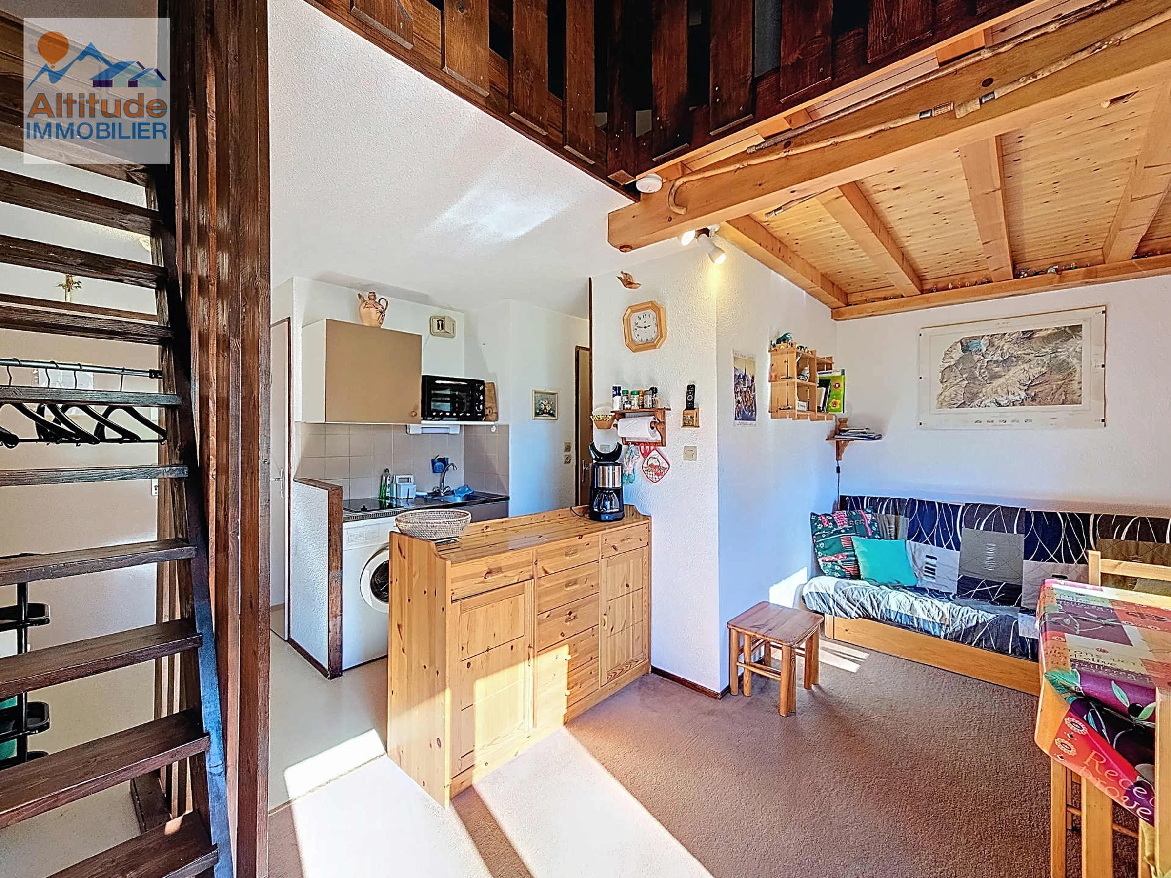 35 m² apartment with mezzanine, located on the first floor, comprising an entrance hall, separate toilet, bathroom with bathtub, and a fully equipped kitchenette opening onto the living room with a sofa bed (140x190) and a south-facing balcony.