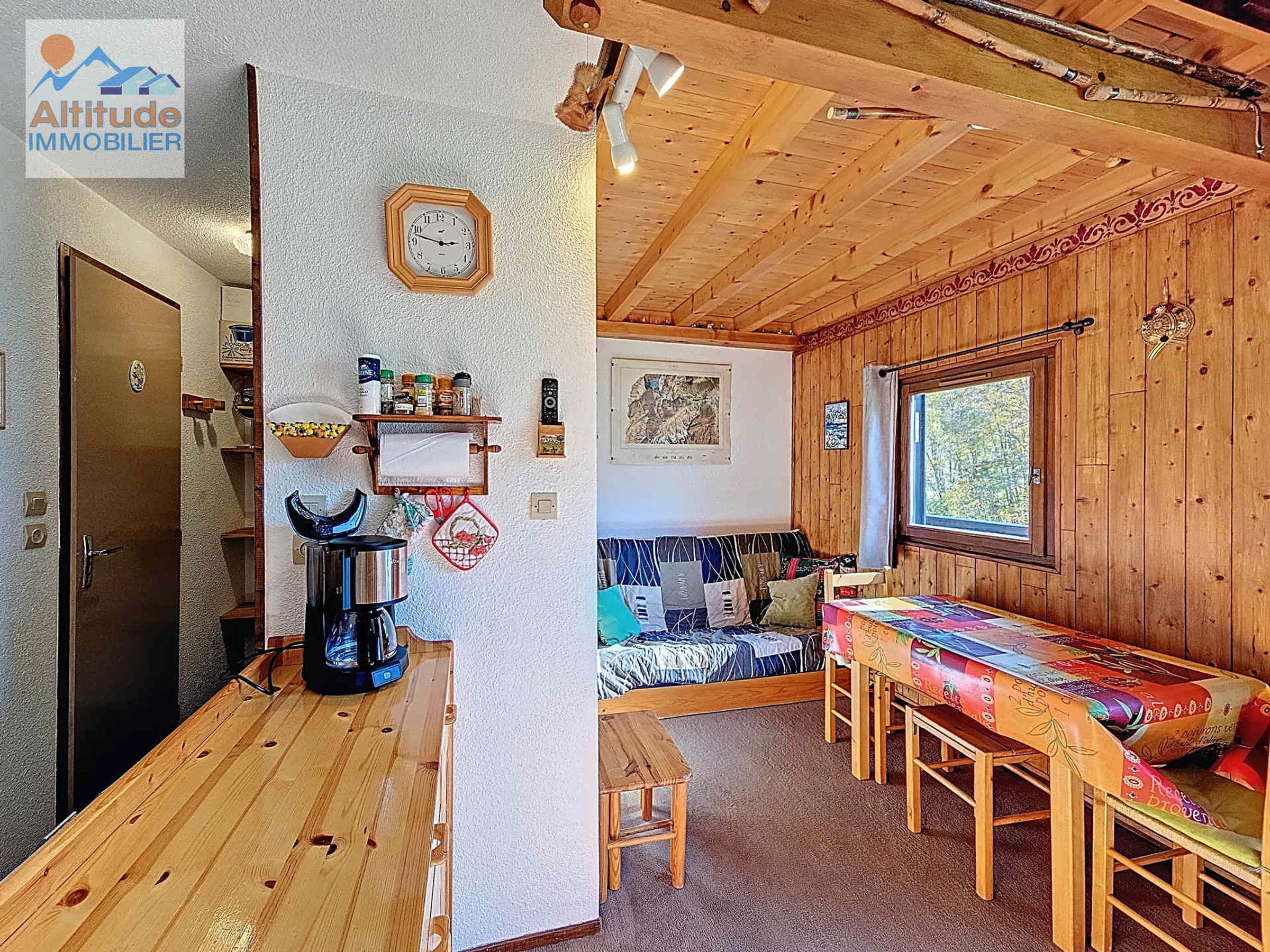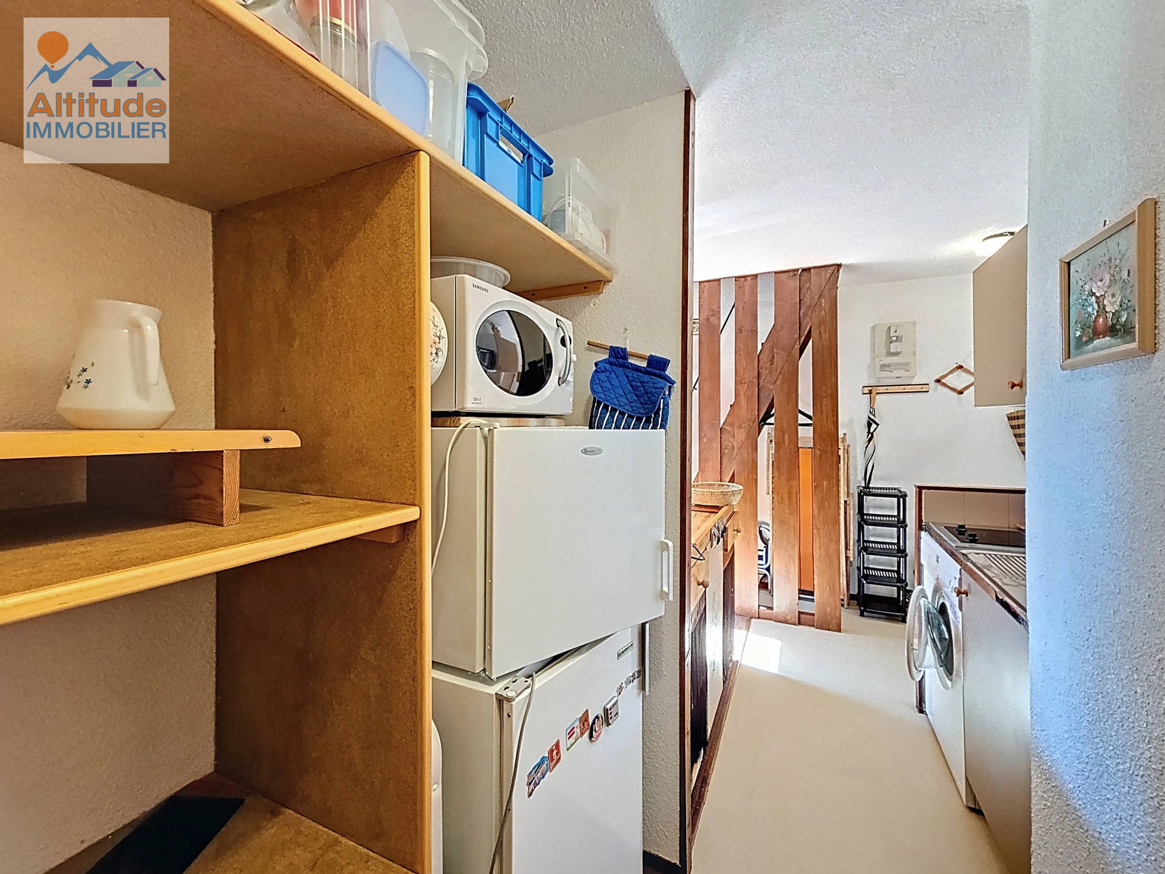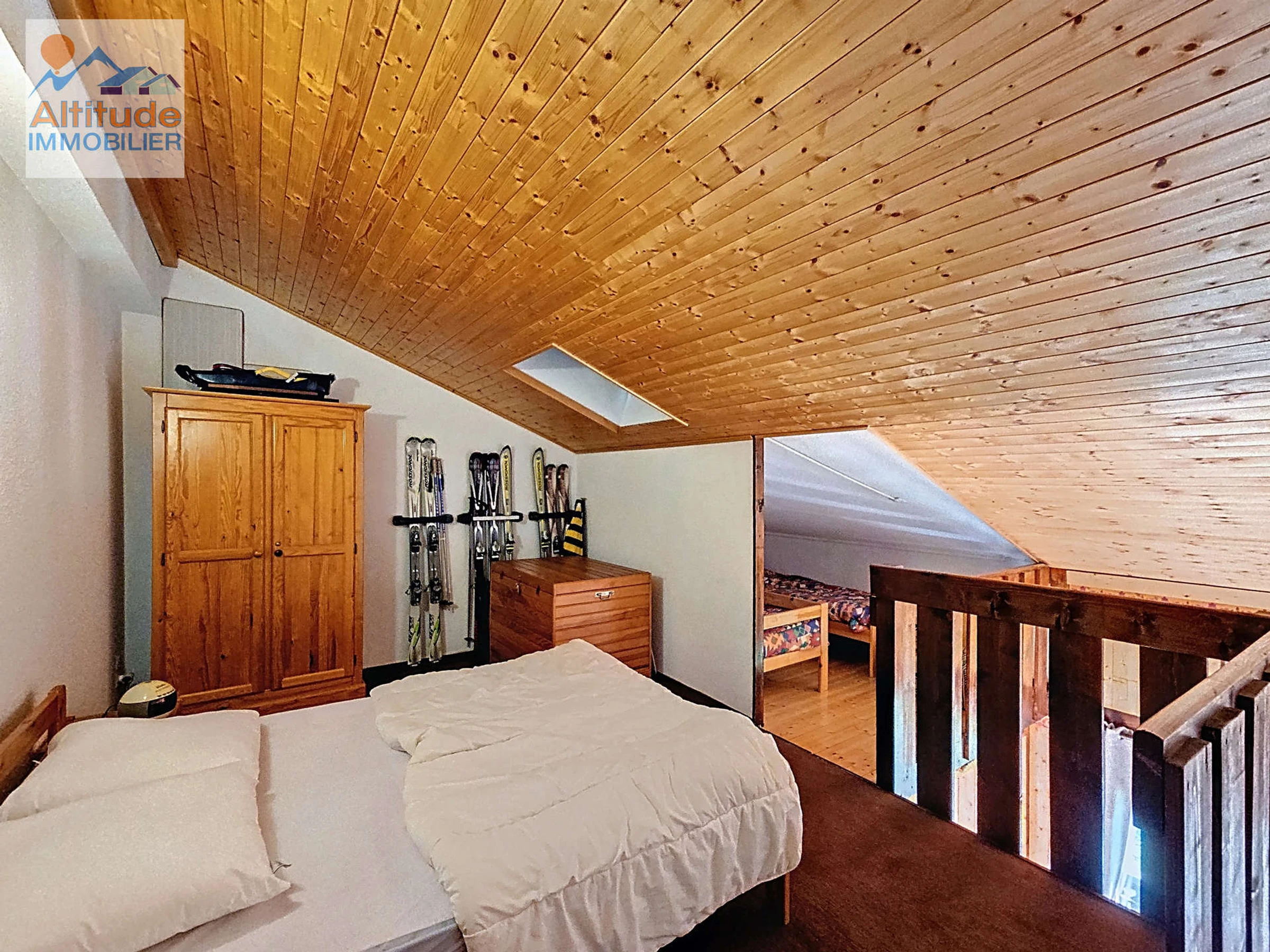 35 m² apartment with mezzanine, located on the first floor, comprising an entrance hall, separate toilet, bathroom with bathtub, and a fully equipped kitchenette opening onto the living room with a sofa bed (140x190) and a south-facing balcony.
