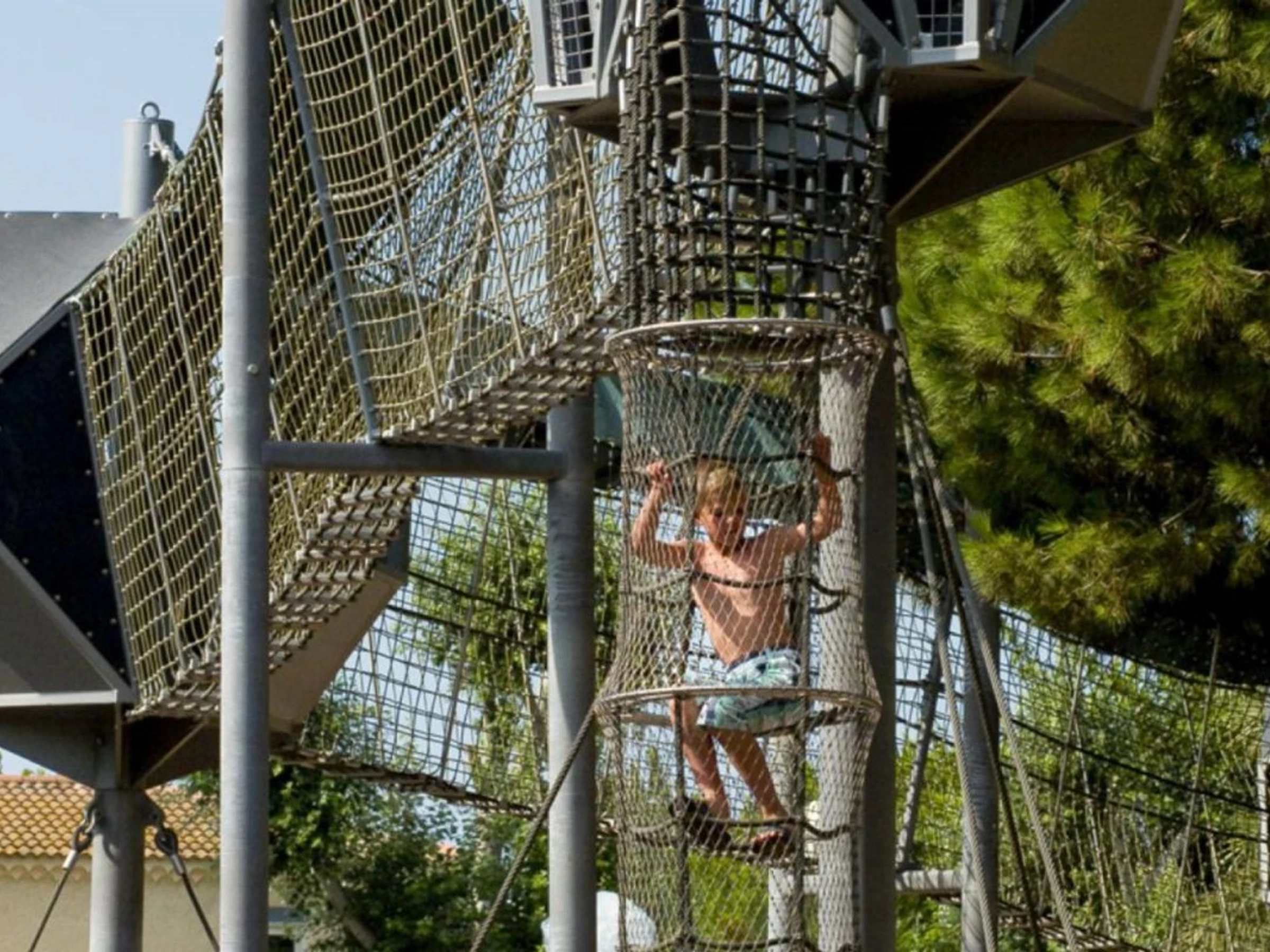 Multi-activity maze, spring riders, slides, suspension bridges, and climbing structures.