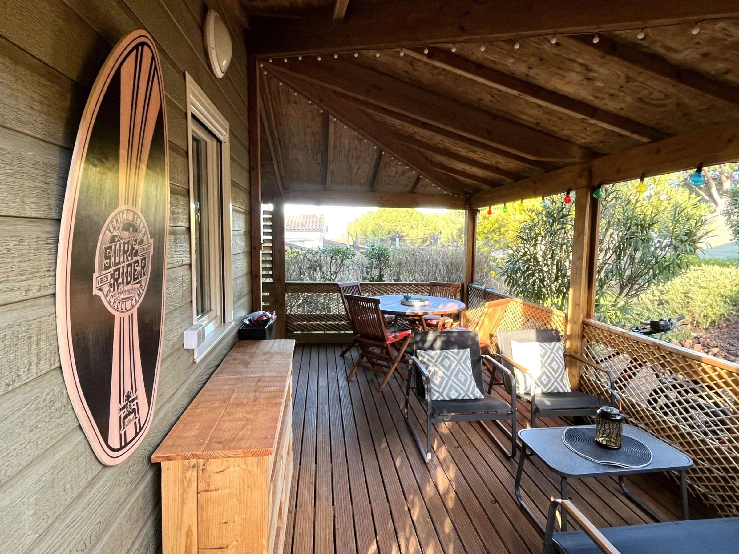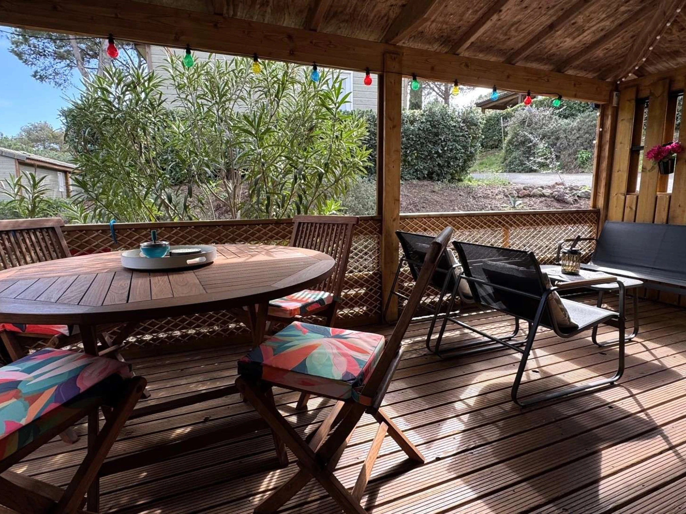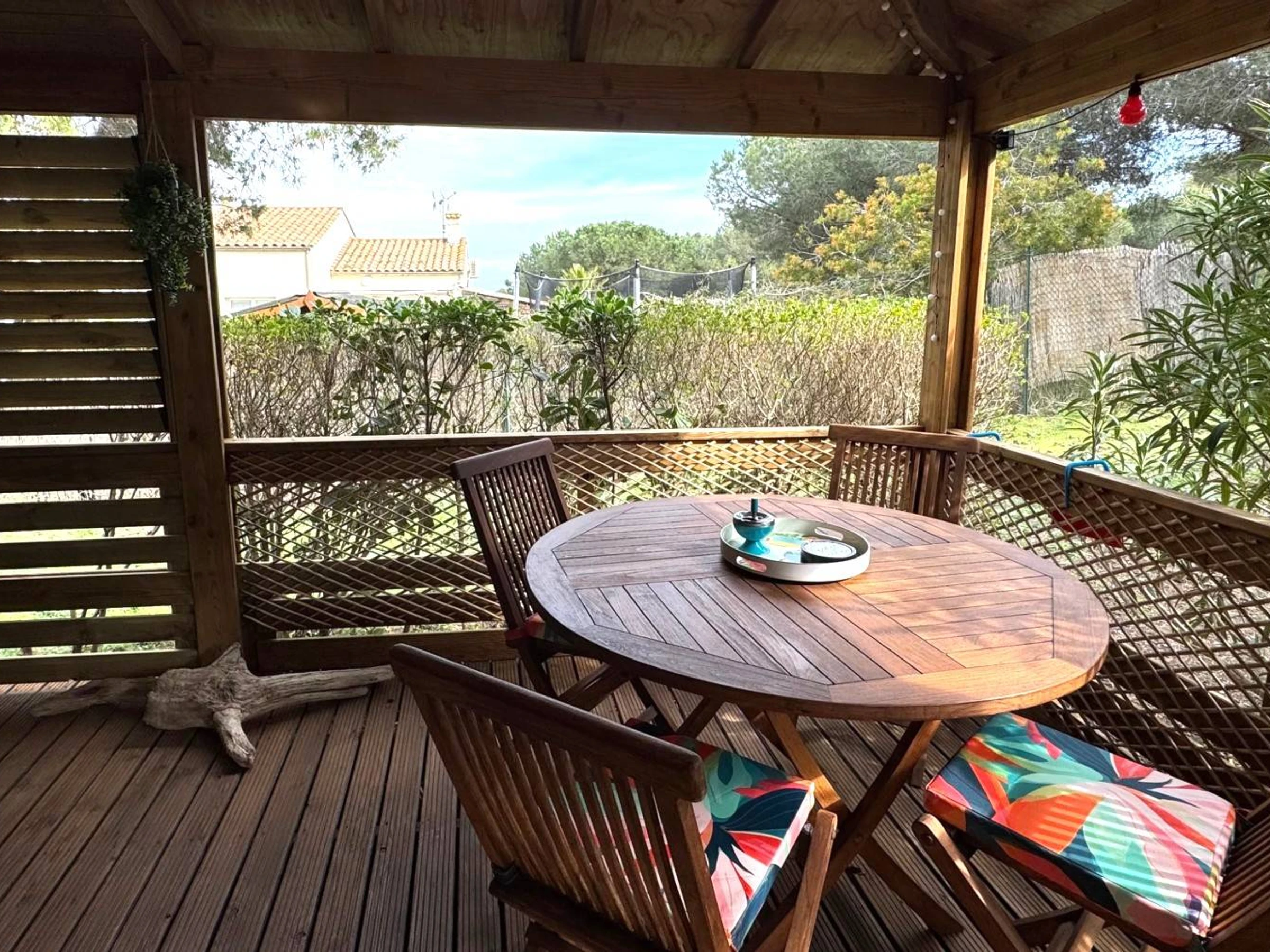 Terrasse couverte de 17 m² avec salon de jardin en teck.