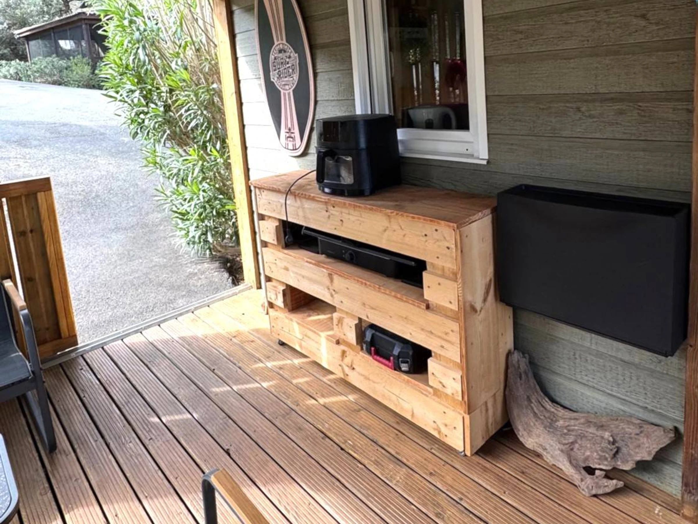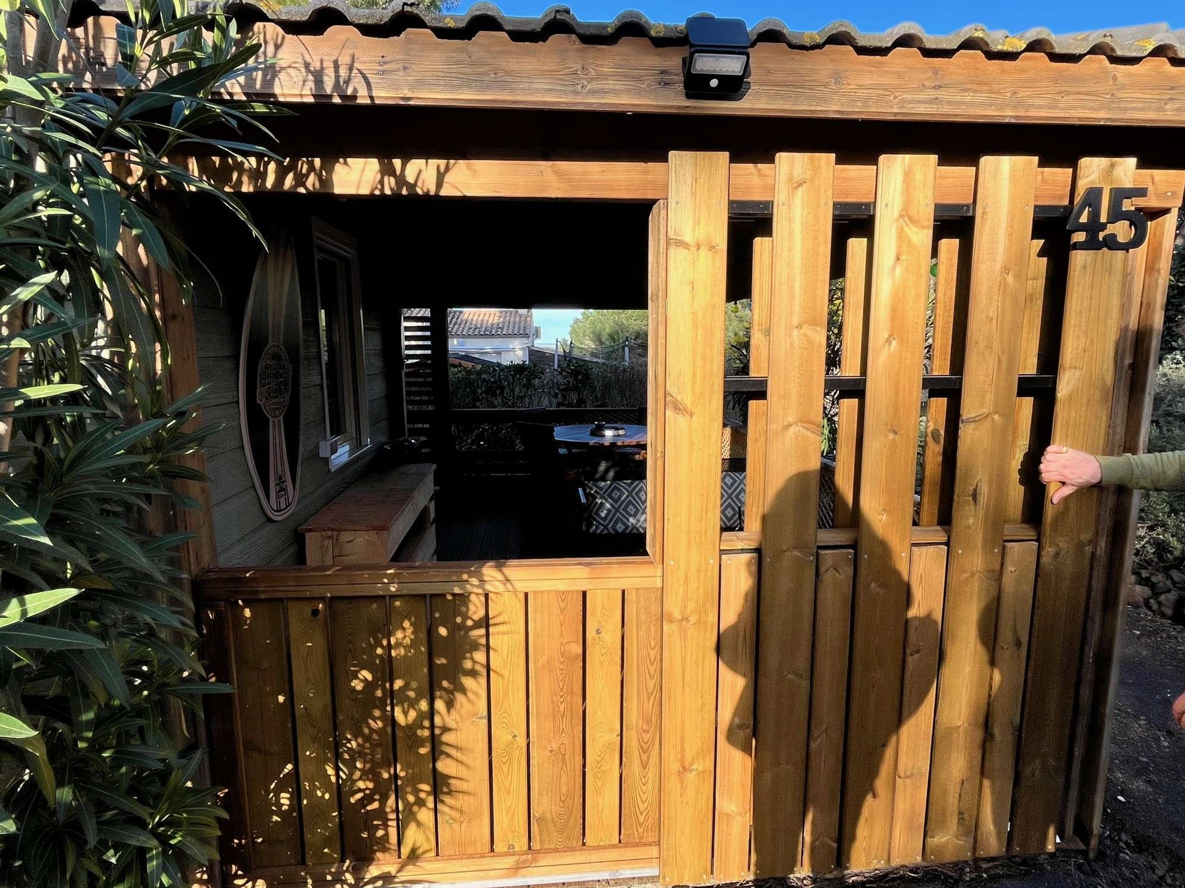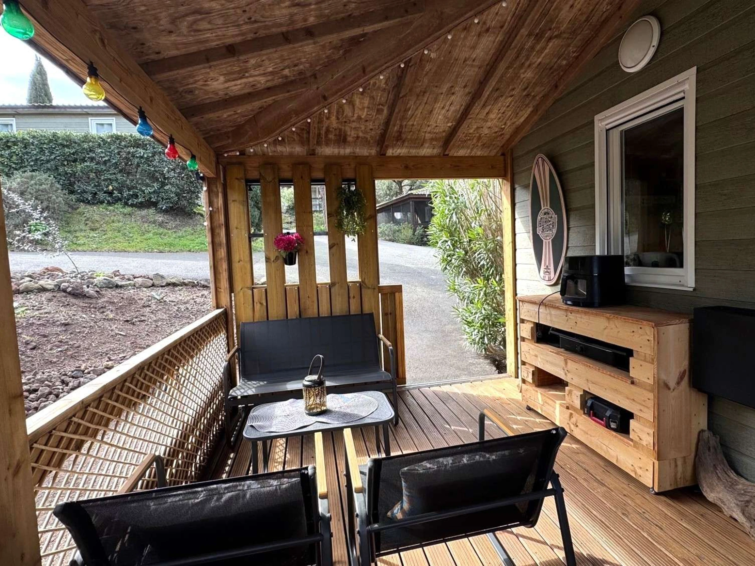 Terrasse couverte de 17 m² avec salon de jardin en teck.