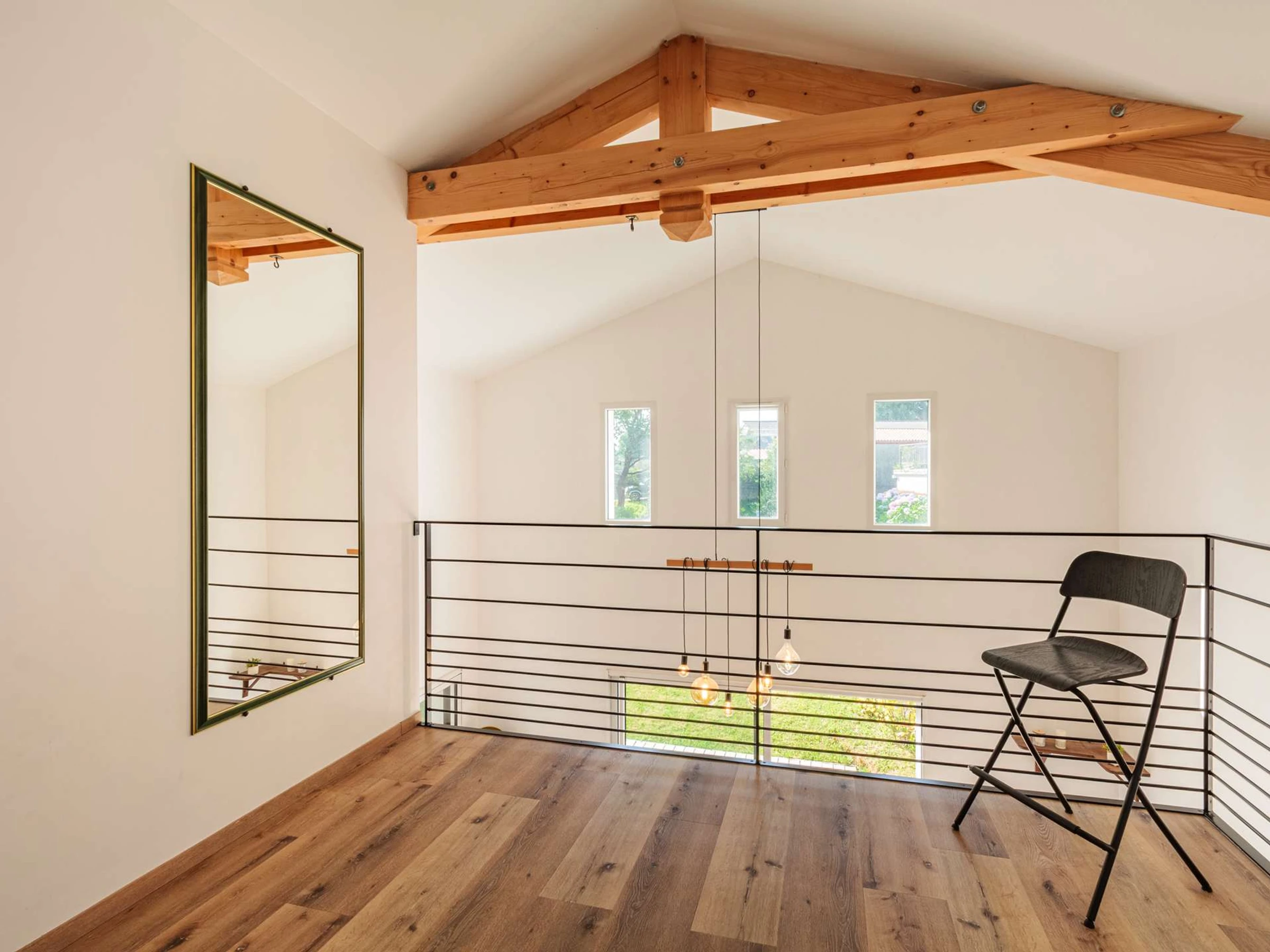 Upstairs, two bedrooms, one with a double bed, one with two single beds, and a bathroom with a toilet and washing machine, complete the sleeping area.