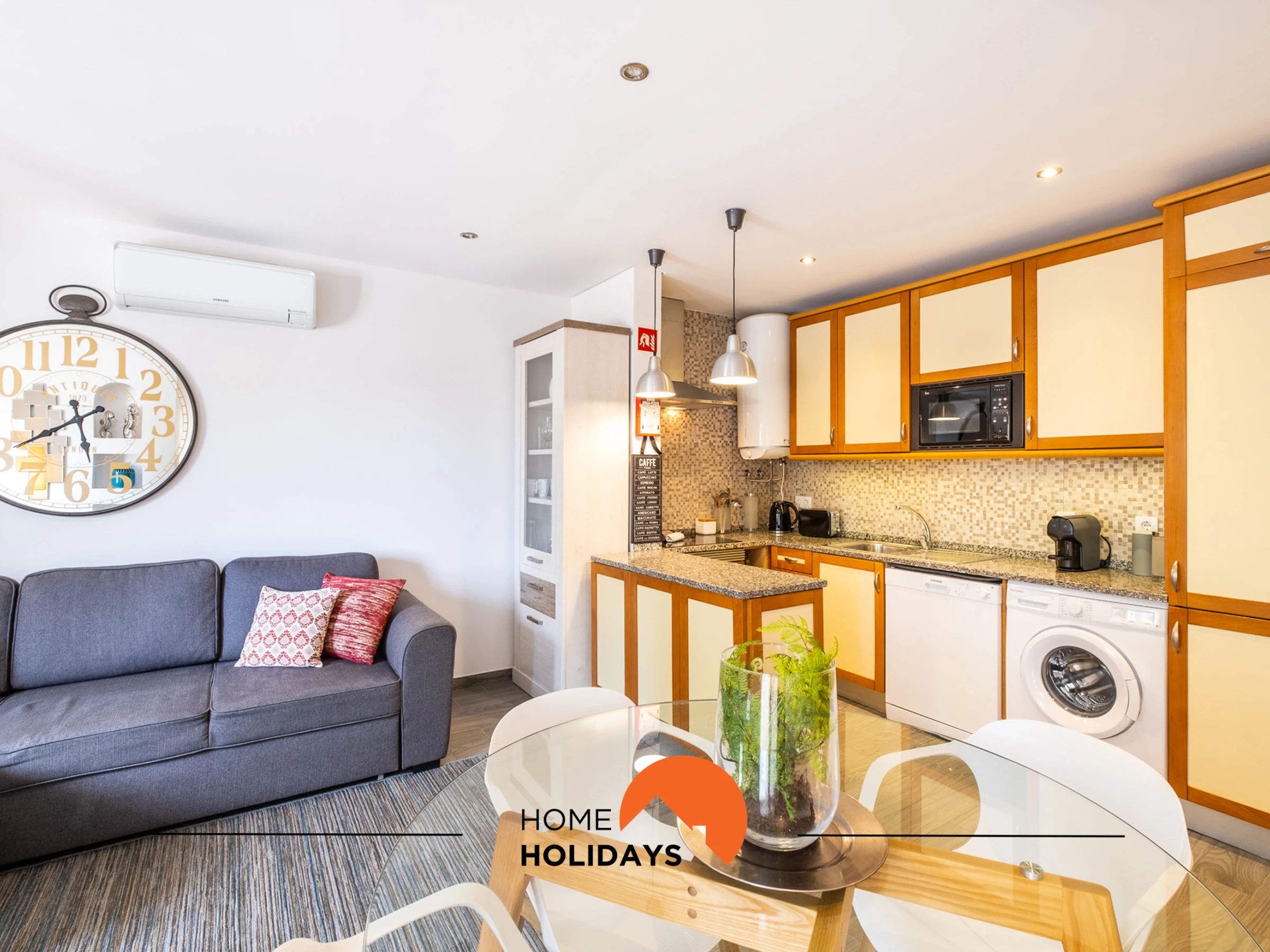 The spacious living room boasts an open-plan, fully equipped kitchen where you can prepare delicious meals while enjoying the company of your loved ones. For your comfort, the apartment is equipped with air conditioning in the living room and bedroom, ensuring a pleasant environment throughout your stay.