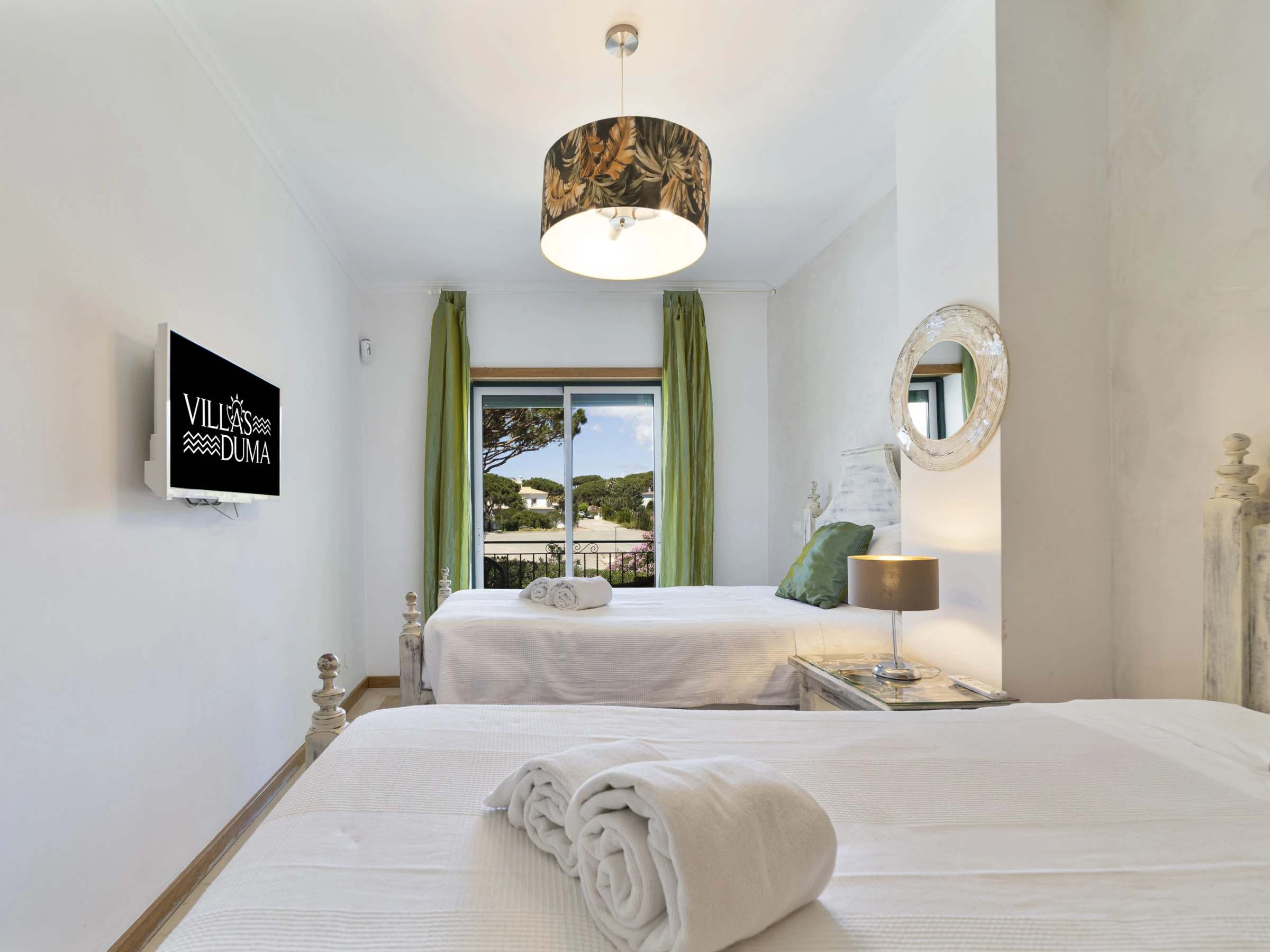 On the first floor, bedroom one has 2 single beds, air conditioning, large fitted wardrobes and double doors opening on to a shared terrace which overlooks the communal gardens and swimming pool.