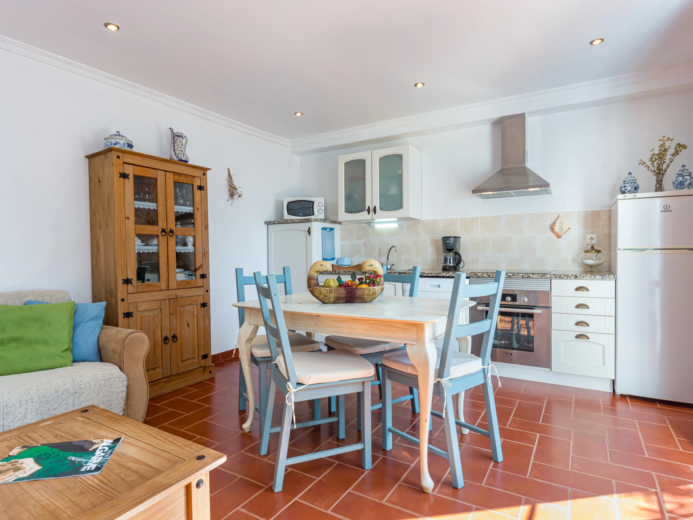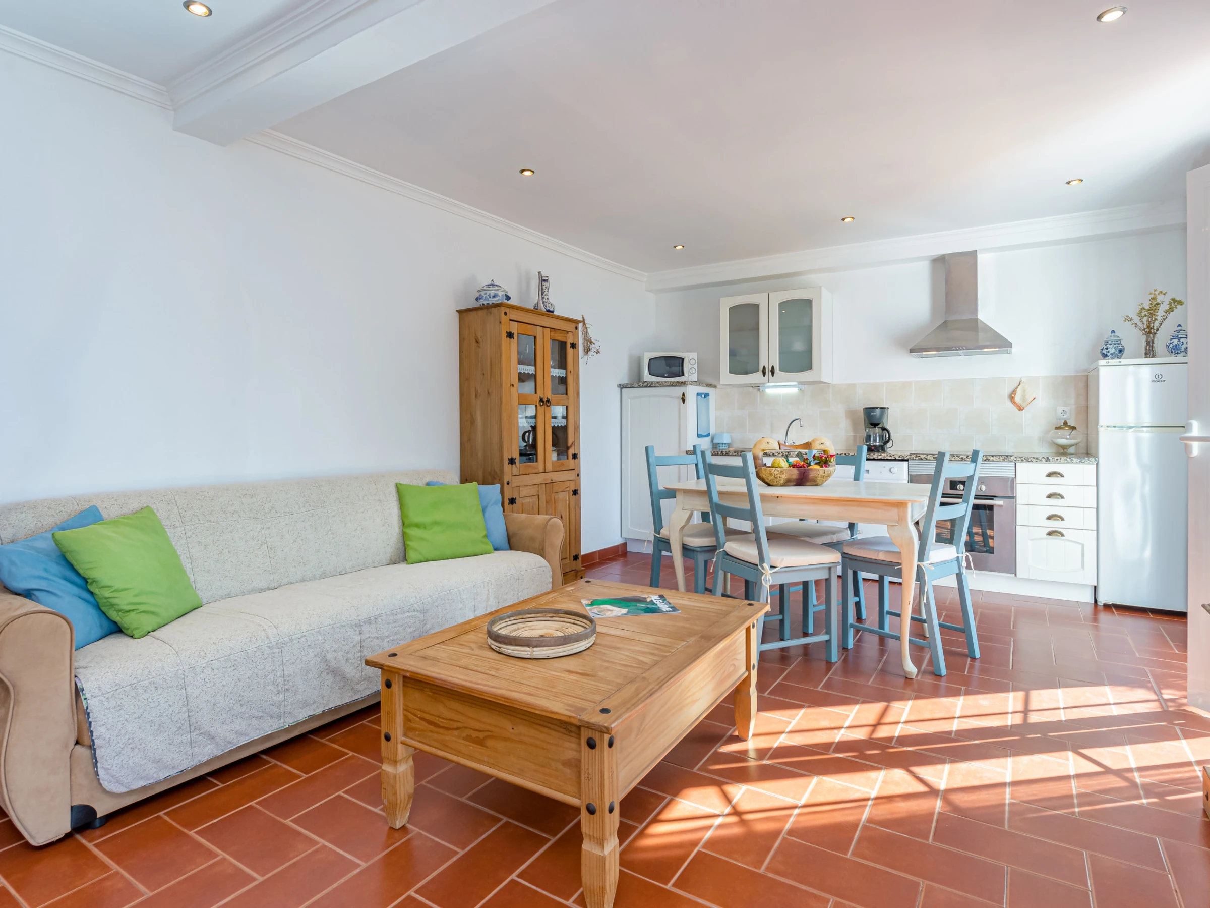 Internally, this bright cottage has a living area with a double sofa bed, an additional separate sofa, TV and dining table with 4 chairs and air conditioning.