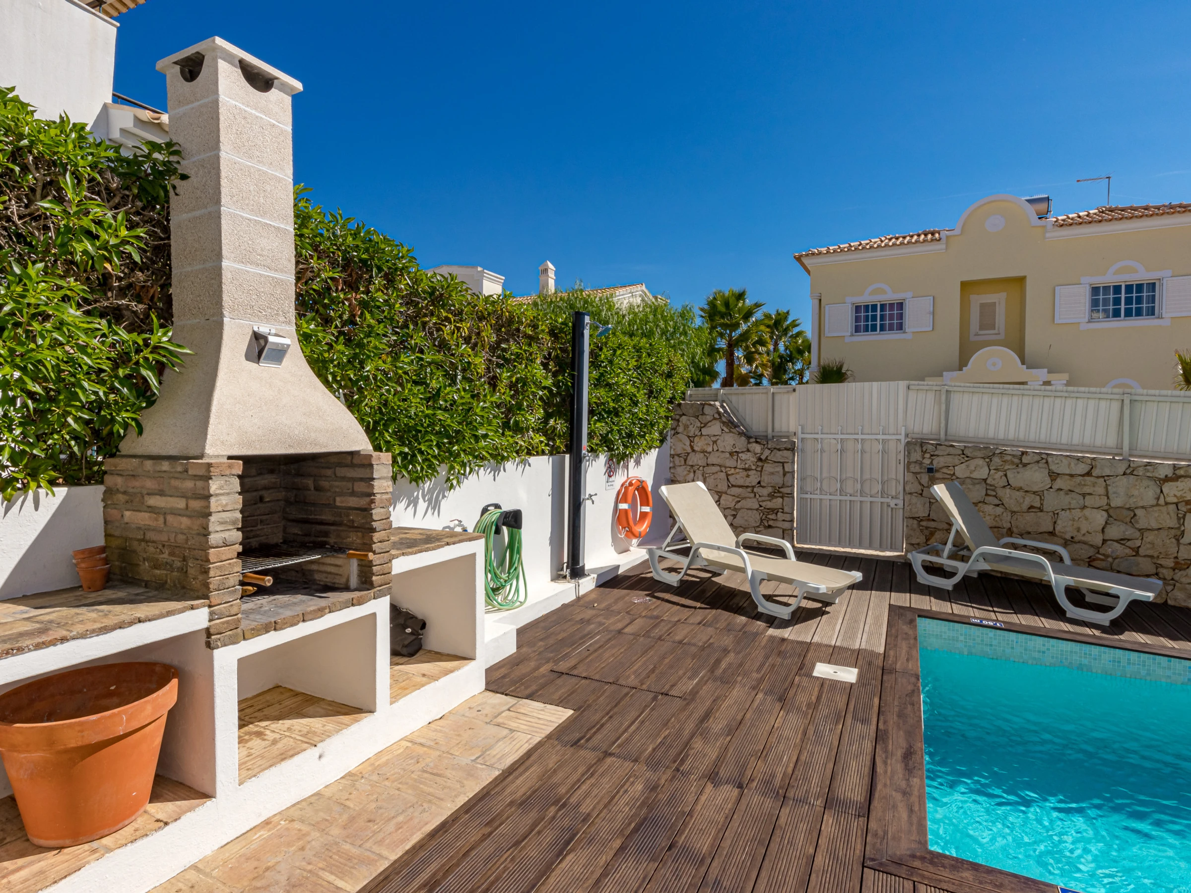 Externally the villa boasts a beautiful decked private swimming pool, an outdoor shower, a charcoal BBQ and small gardens. There are sunlounges by the pool and a table and chairs for outdoor dining.