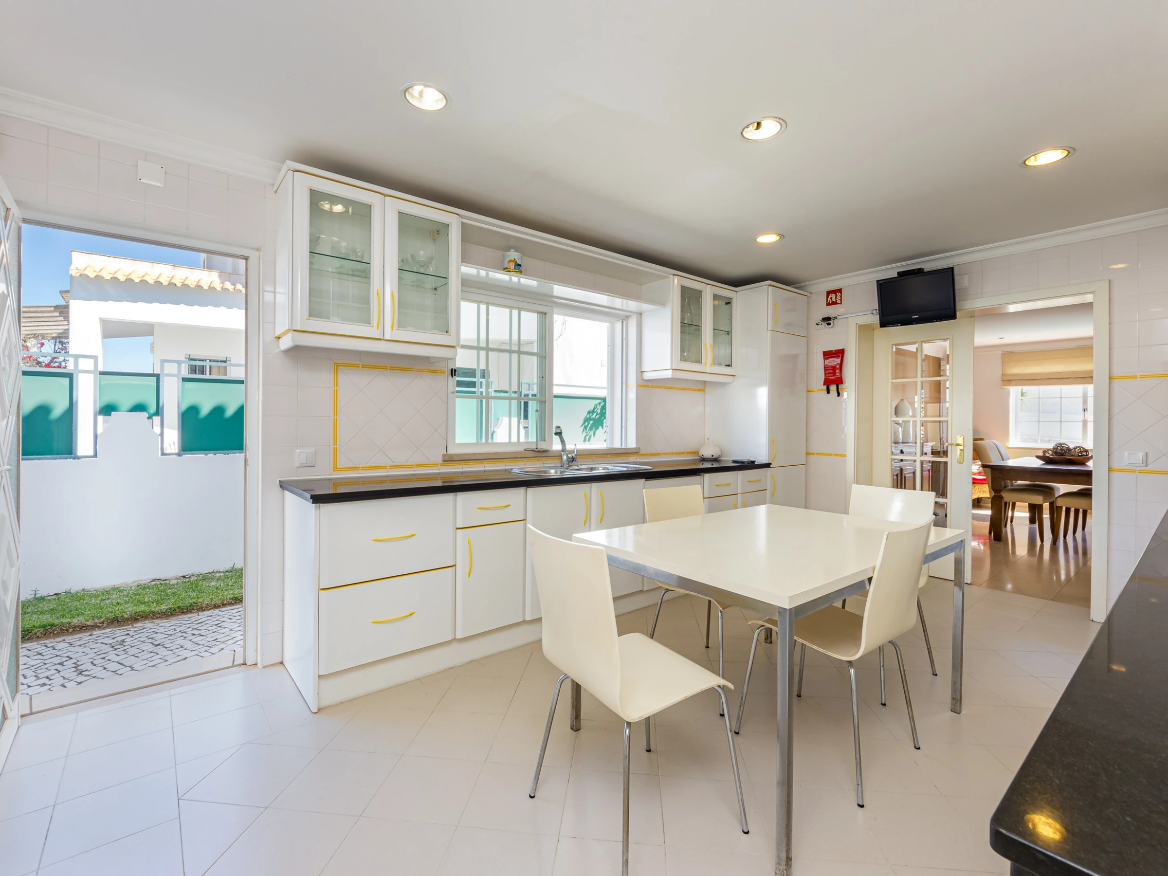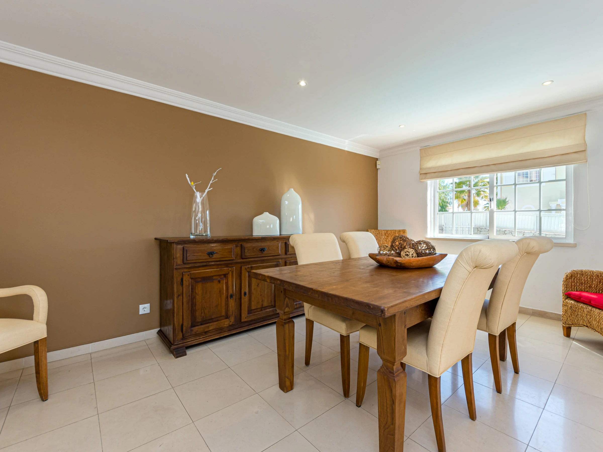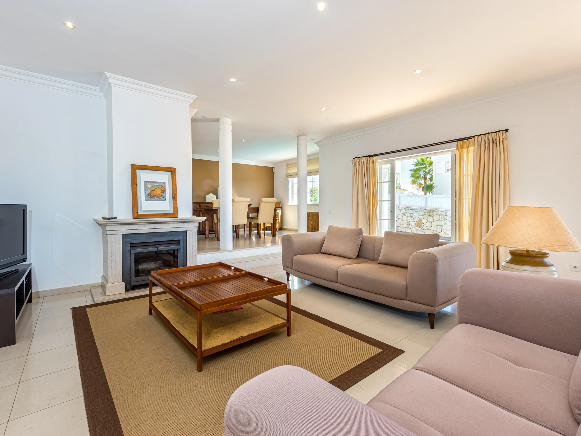 The split-level living room / dining area has comfortable sofas, fireplace, flat screen TV, dining table and chairs and air conditioning. Patio doors open out onto the swimming pool terrace and gardens.