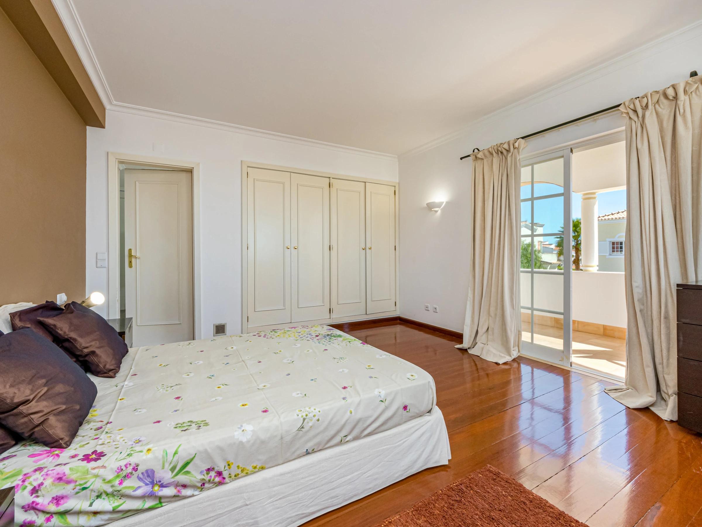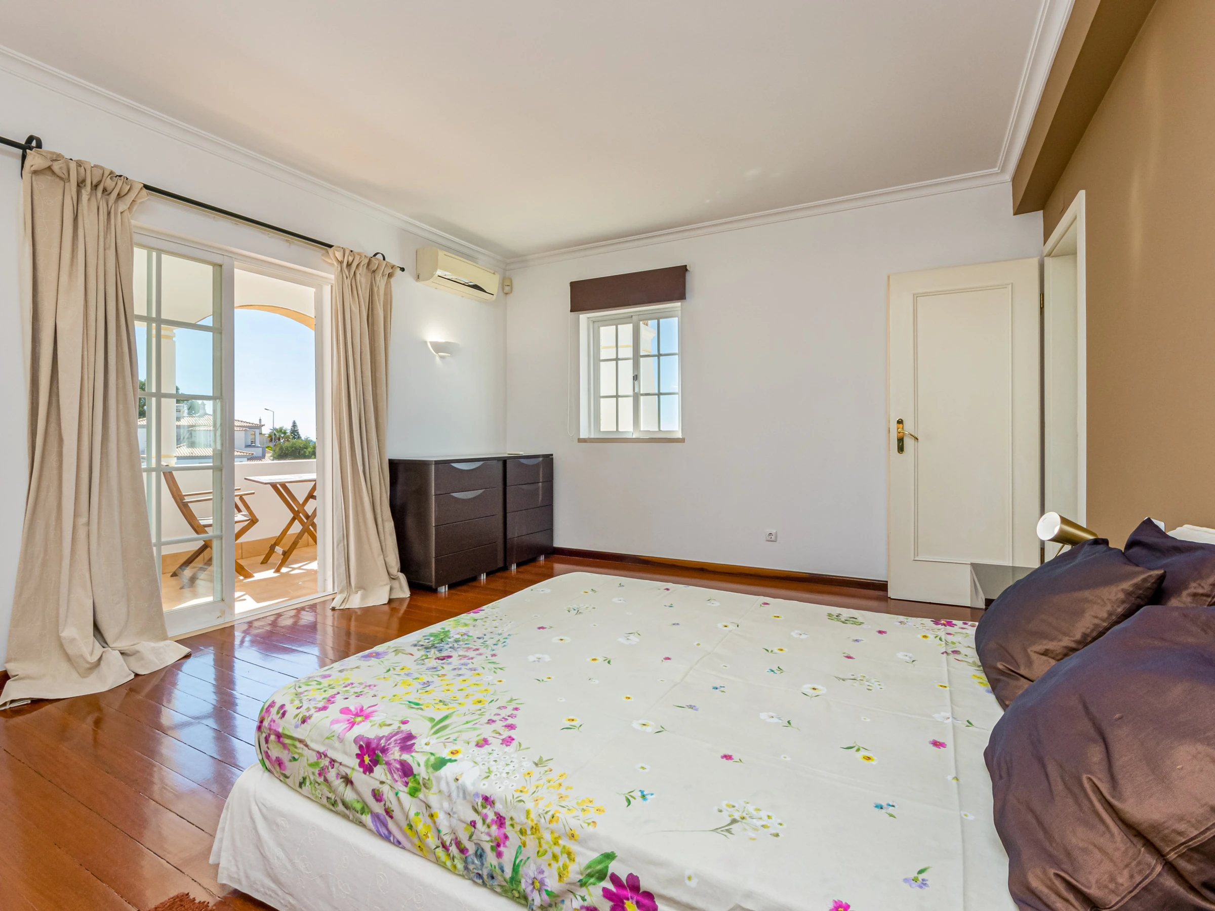 A large bedroom is also on the ground floor with double bed, fitted wardrobes, air conditioning, private balcony and a private bathroom (which has a bath with shower over).