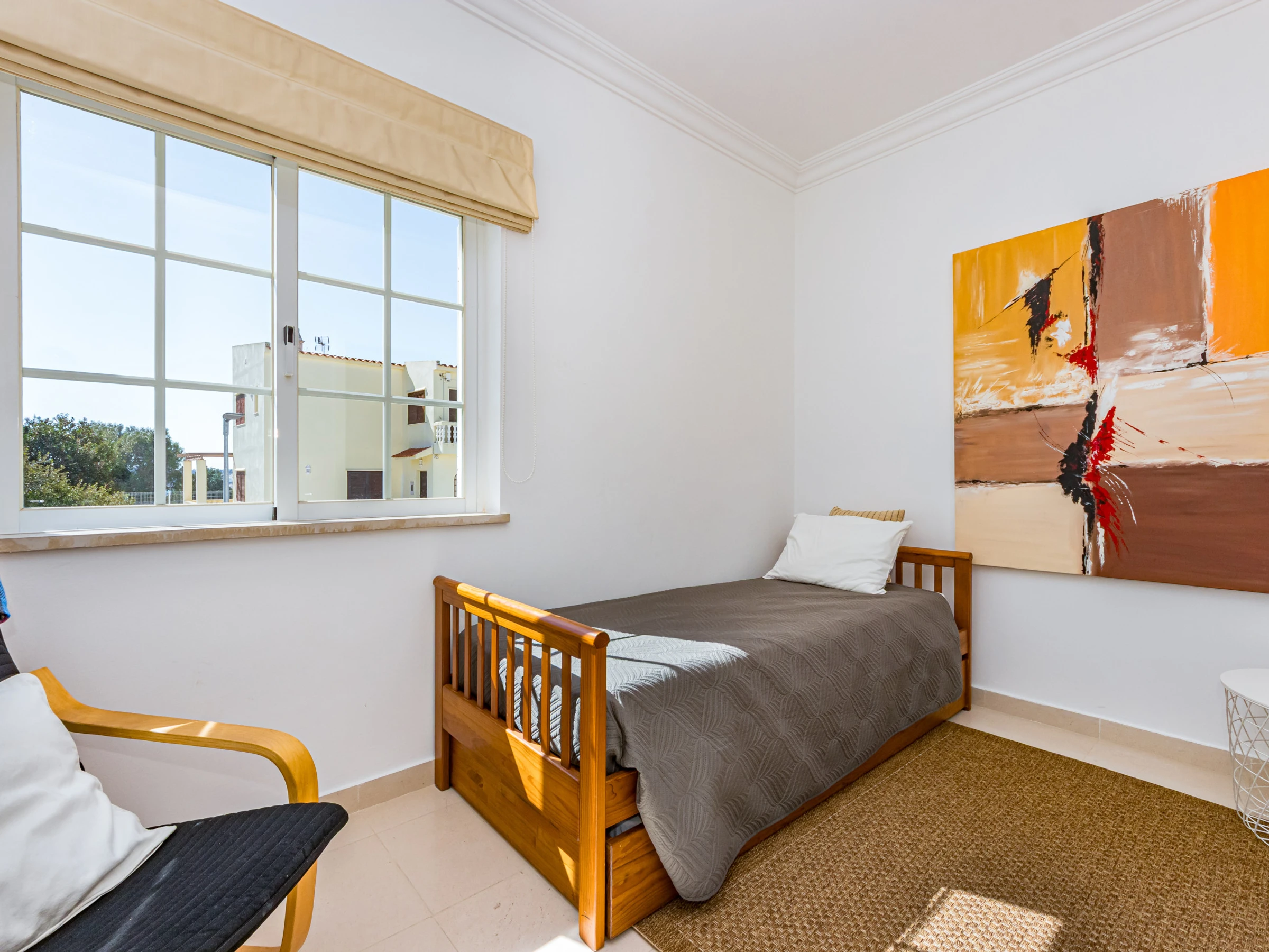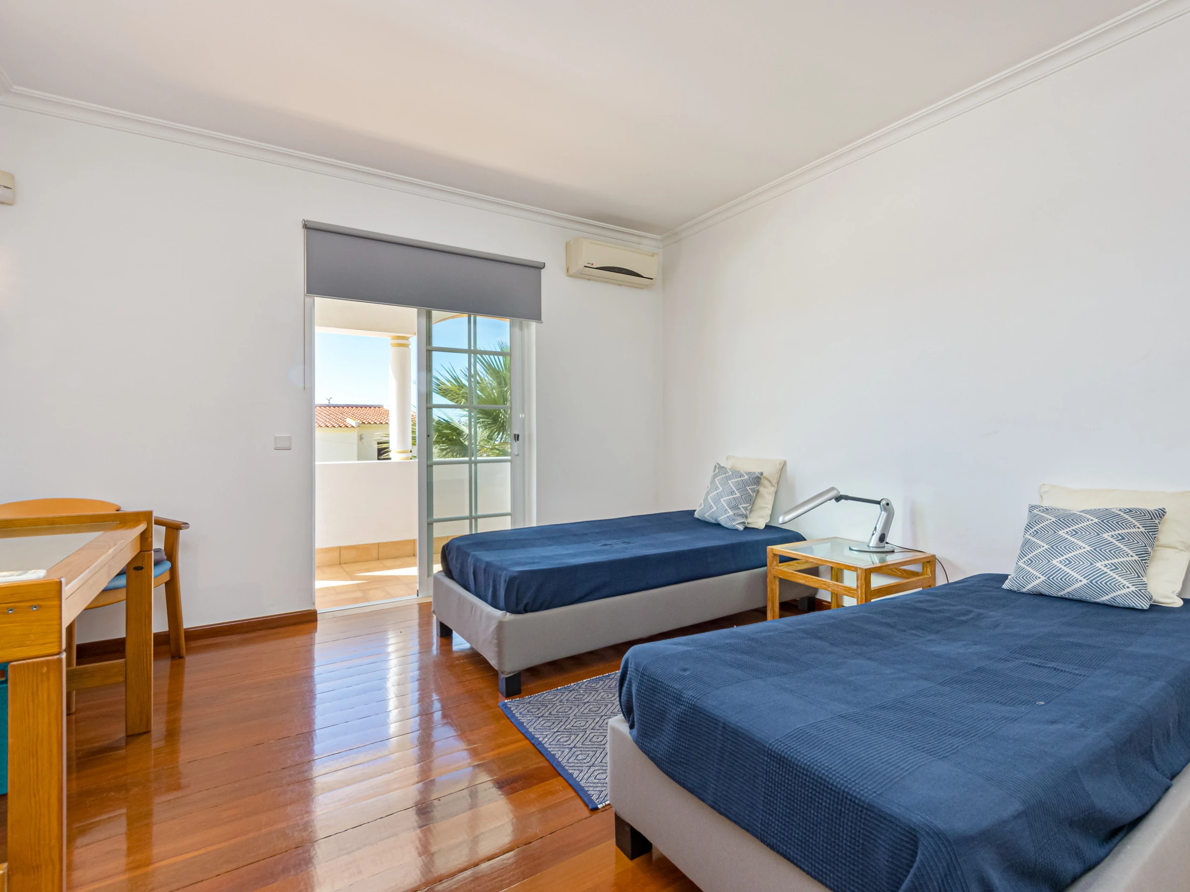 On the first floor there is a full bathroom and a bedroom with twin single beds. The bedroom also features large fitted wardrobes, air conditioning and a private balcony with sea views.