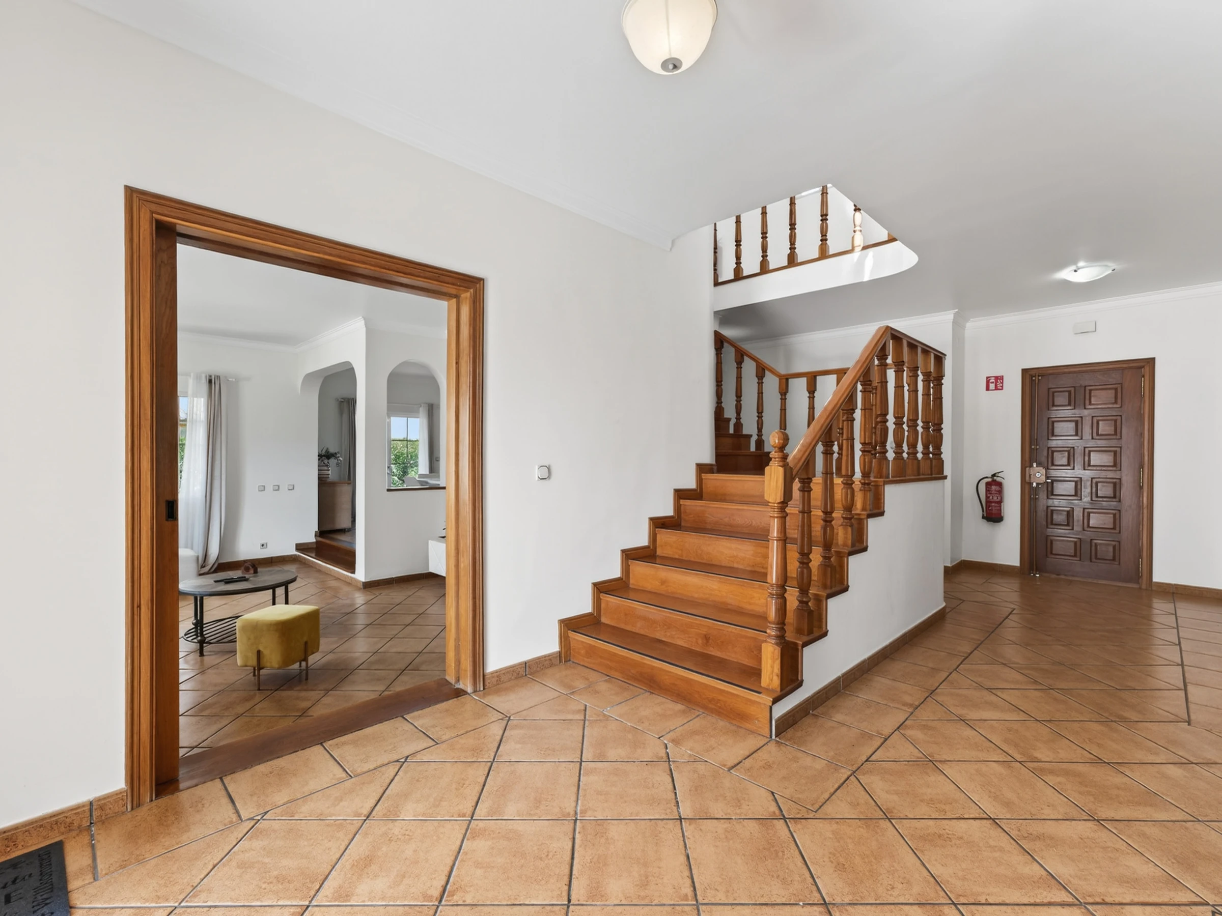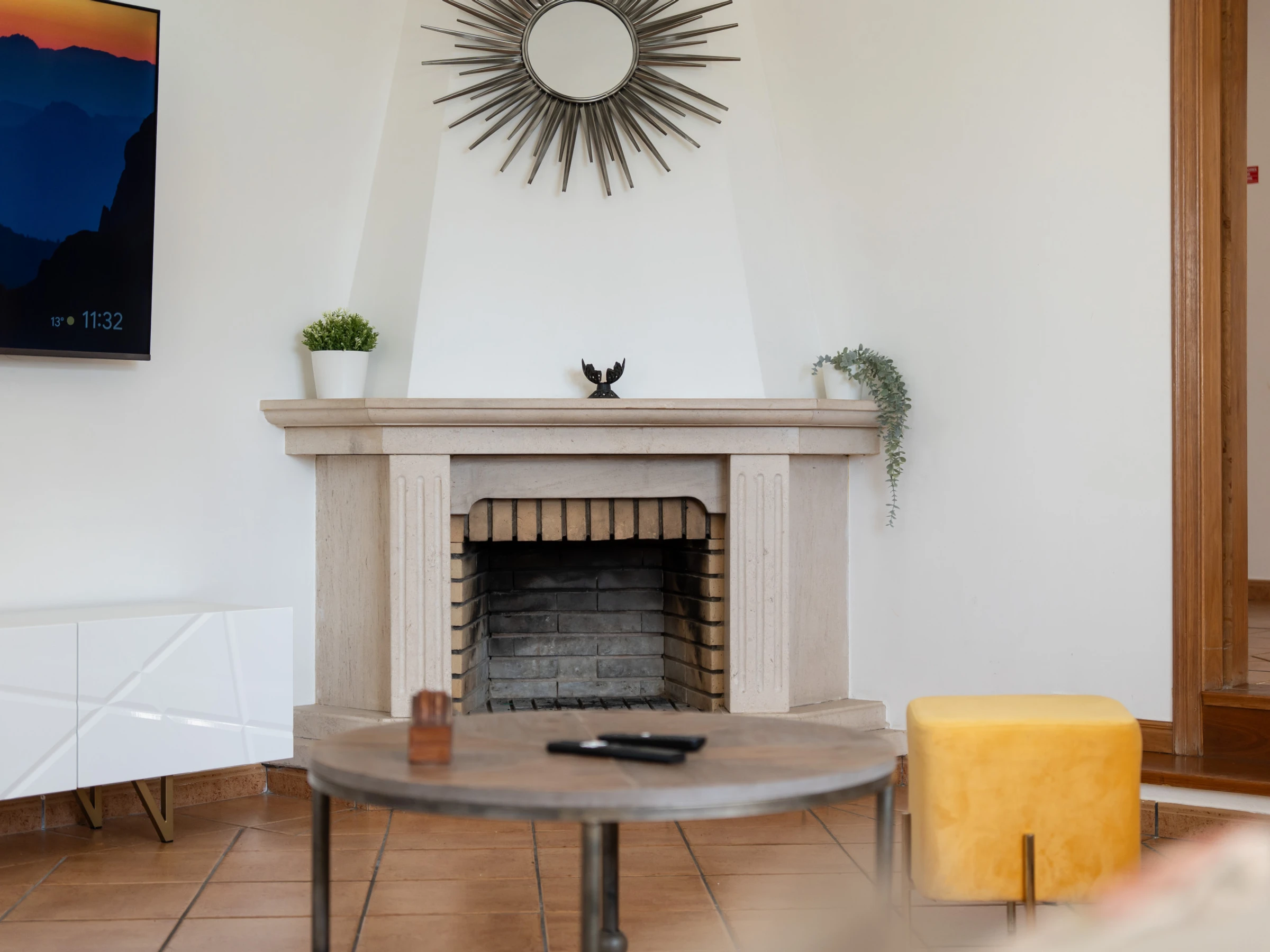 Step inside on the ground floor to a welcoming living area with a fireplace, large TV and a comfy sofa—perfect for lazy afternoons or cosy evenings together. Just beside it, a dining table sets the scene for shared meals and long conversations over a good Portuguese wine. The compact kitchen is equipped for light meals, with oven, hob, fridge, microwave, coffee machine, toaster, cutlery and basic utensils so you can easily prepare simple breakfasts, snacks or suppers at home.