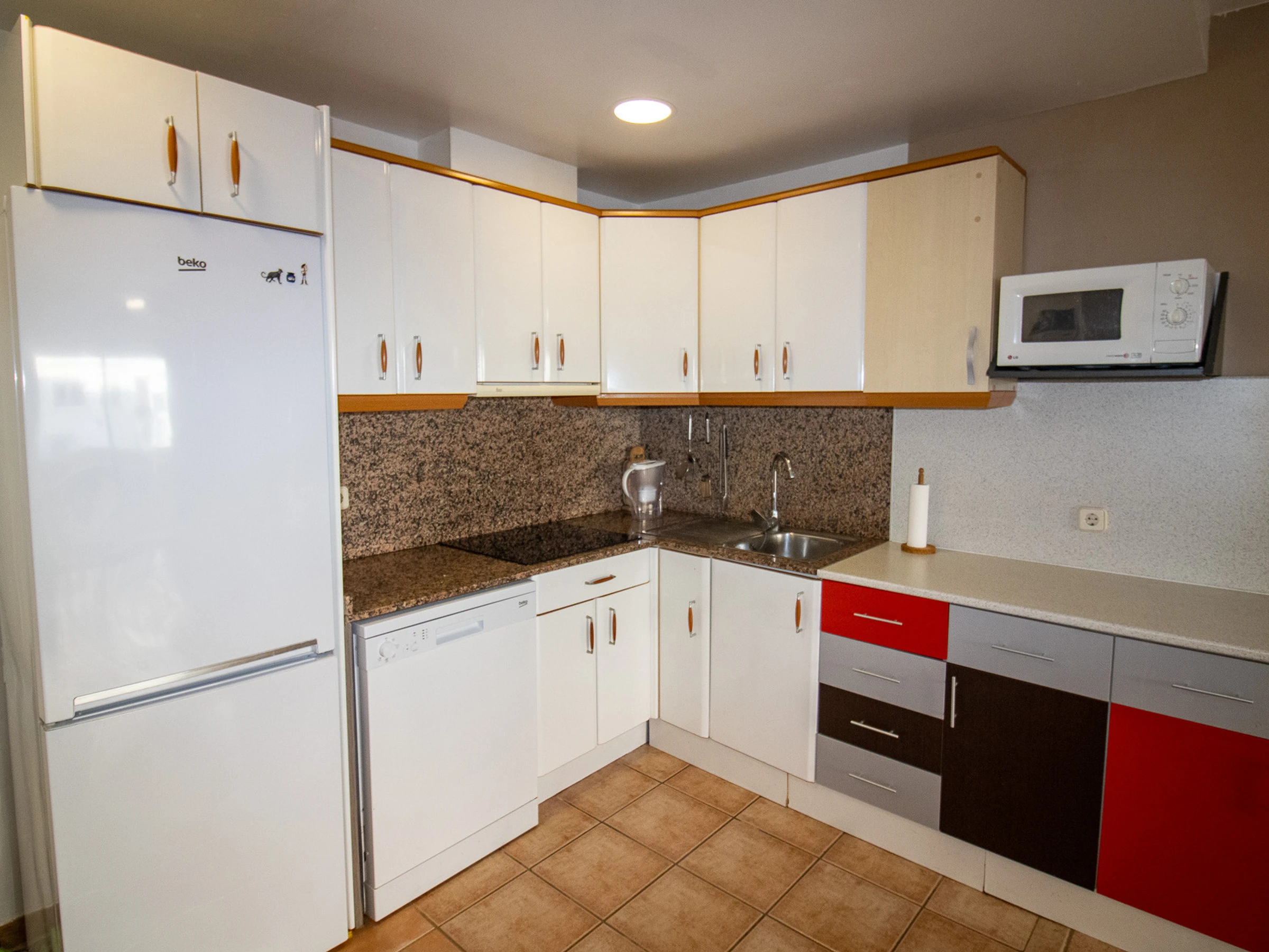 The open plan kitchen, of hotplate of glass ceramics, is equipped with refrigerator, microwave, freezer, dishwasher, dishes/cutlery, kitchen utensils, coffee machine and toaster.